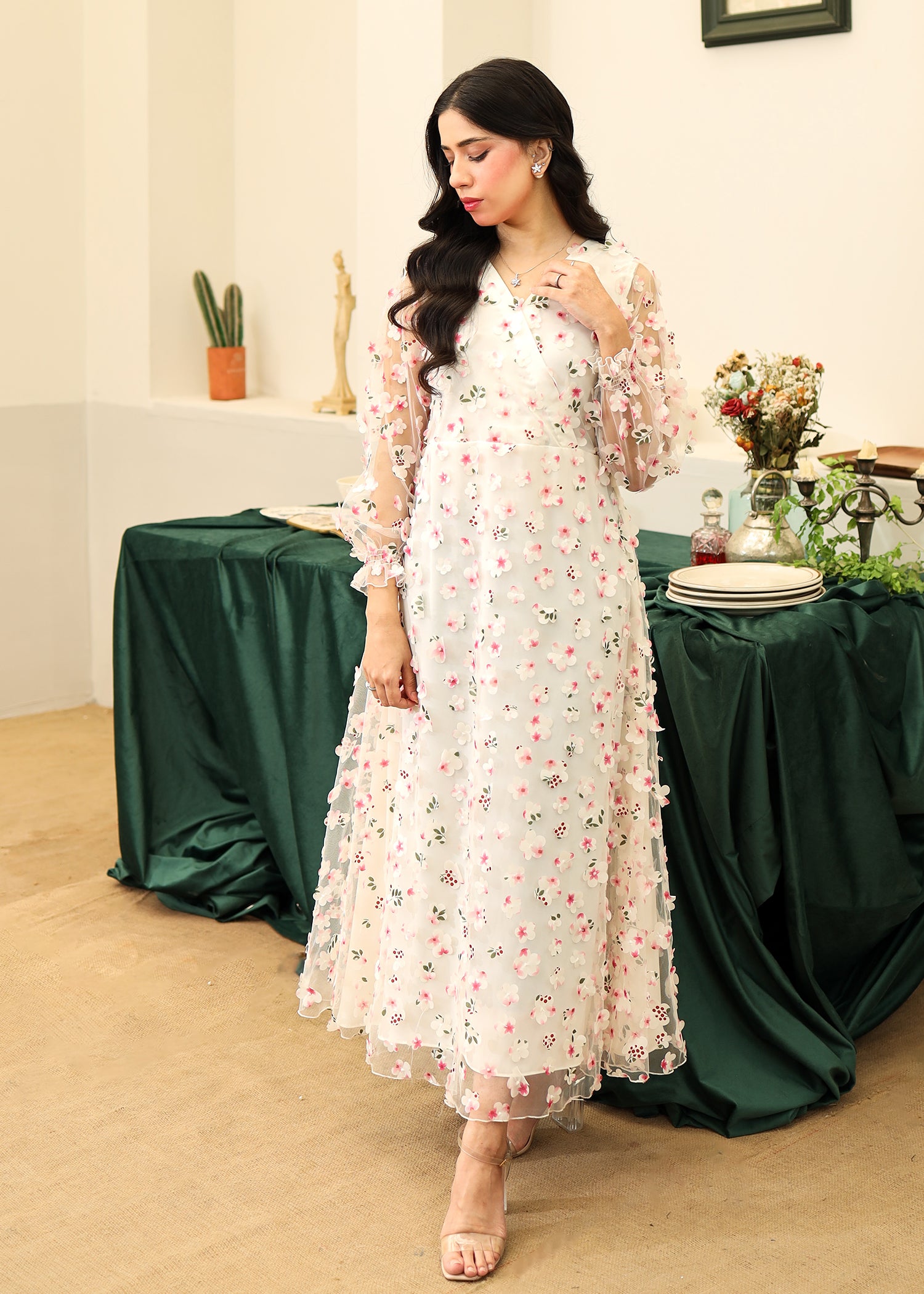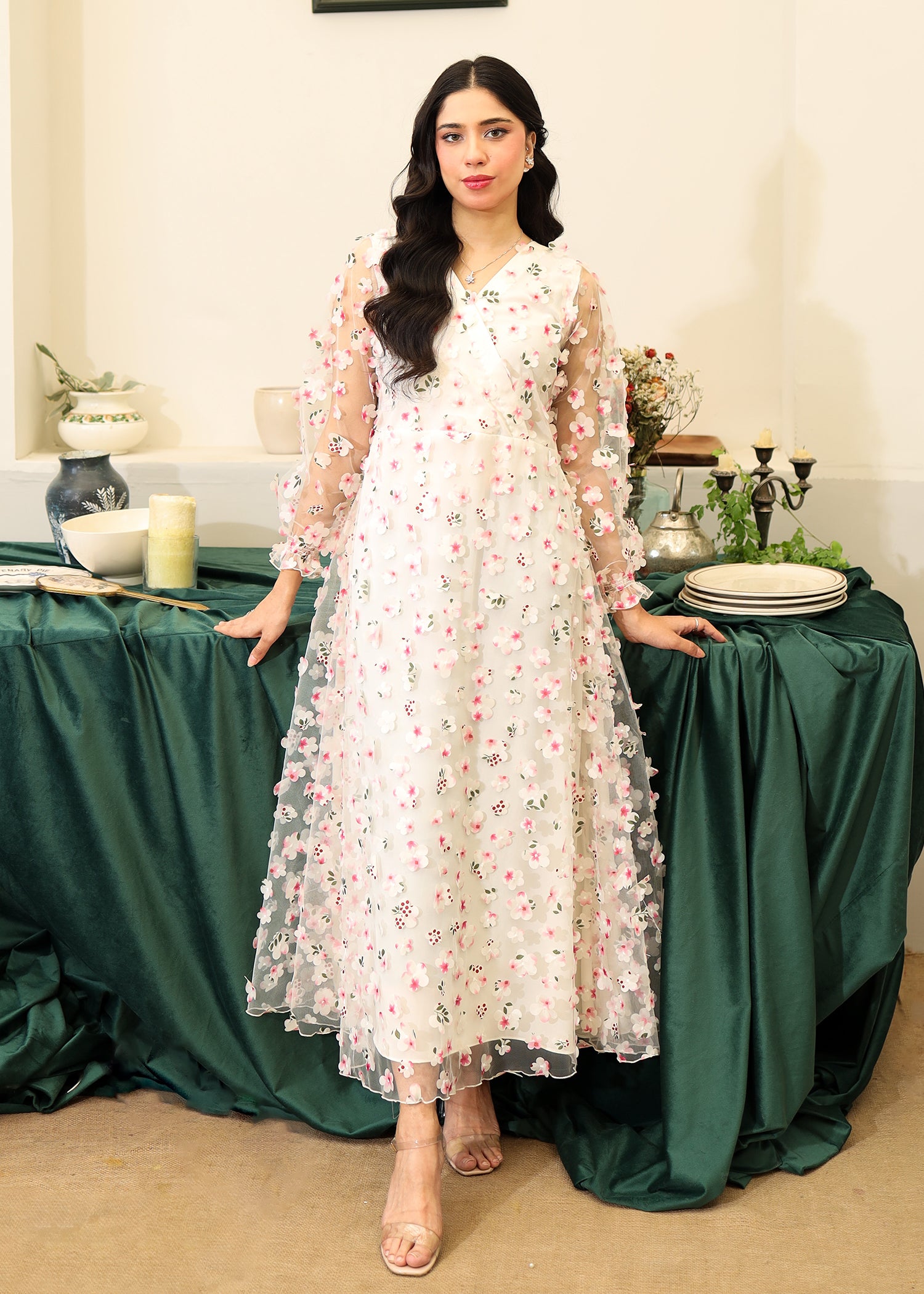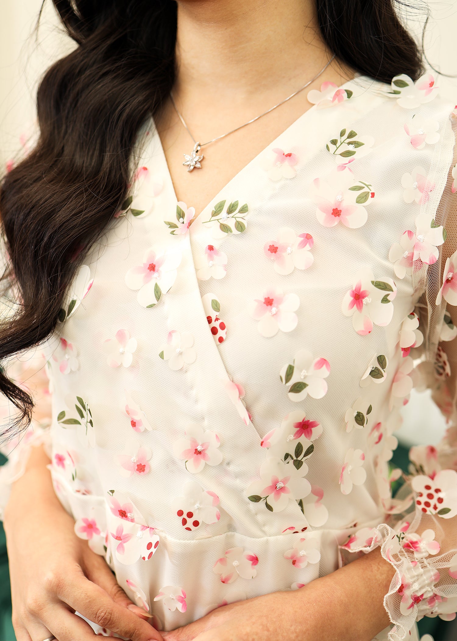 Crafted from delicate white 3D floral net with a sleek georgette underlayer, this dress is a vision of grace. It features a timeless wrap neckline, complemented by romantic puffy sleeves.