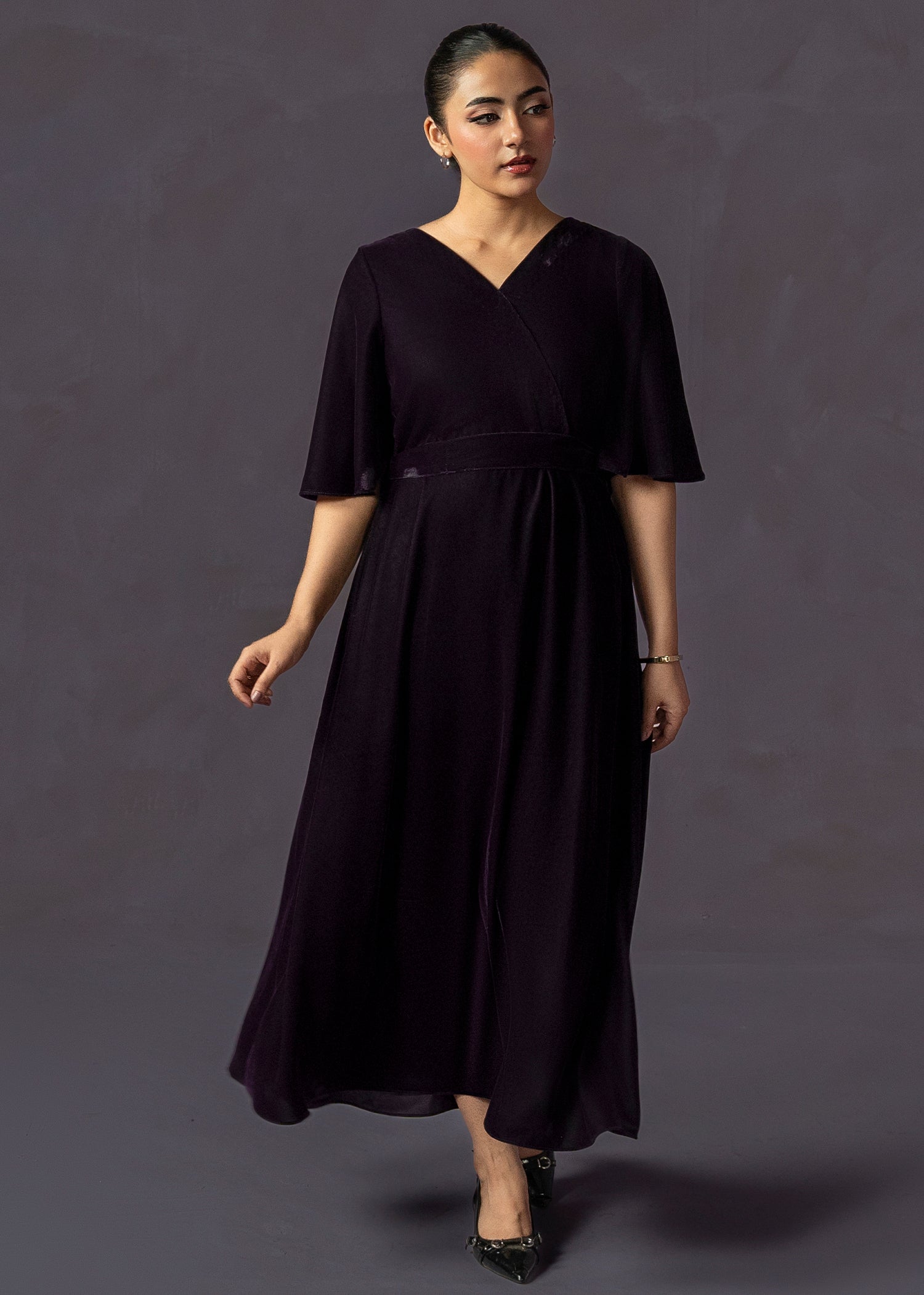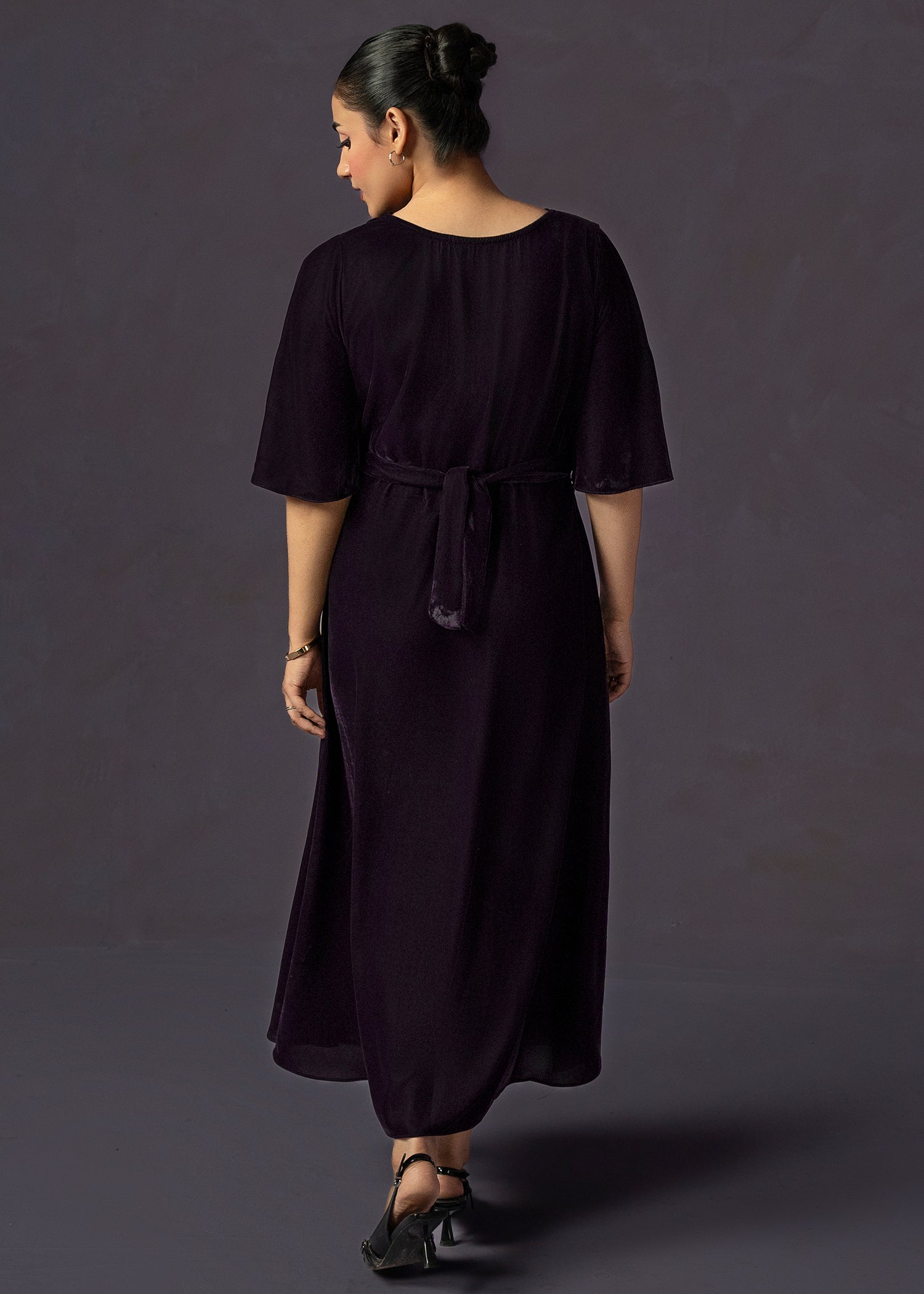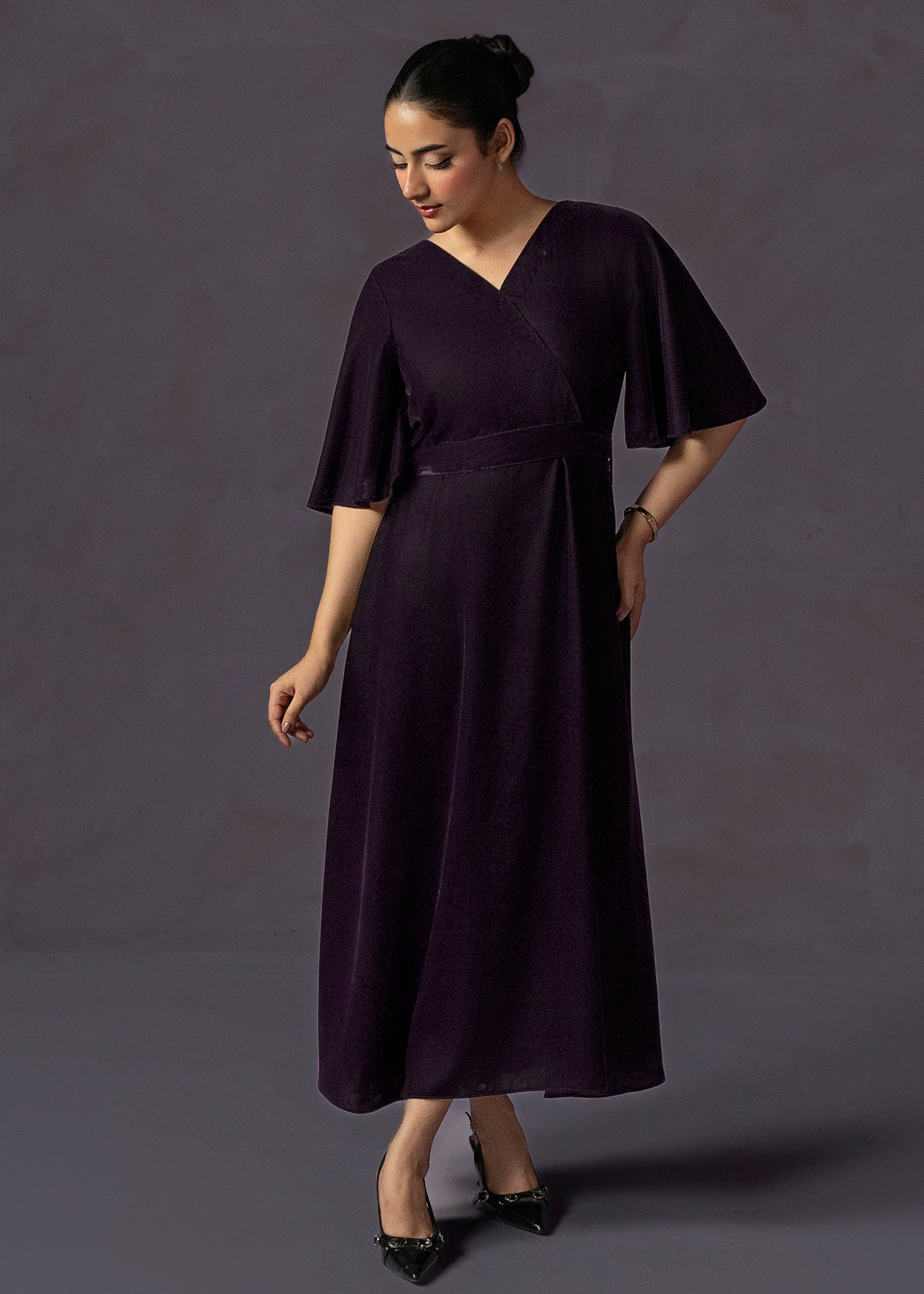 Elegant and timeless, this deep plum dress is crafted from soft velvet fabric that drapes beautifully over the body. It features a flattering wrap-style bodice with a V-neckline, wide flutter sleeves, and a defined waistband that cinches the silhouette gracefully. The flowy A-line skirt adds movement and sophistication, making it perfect for evening gatherings, dinners, or formal events.