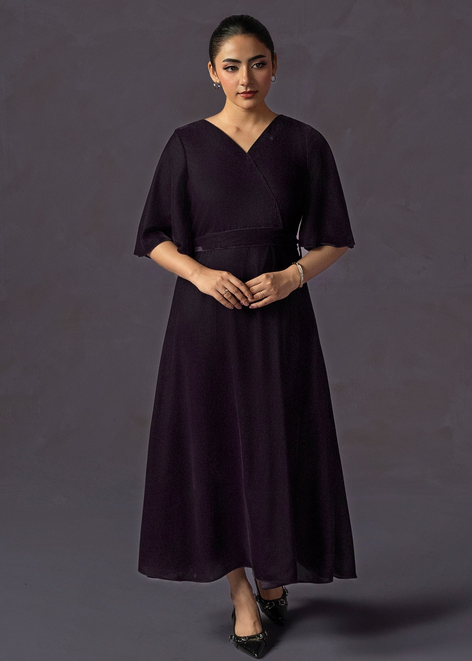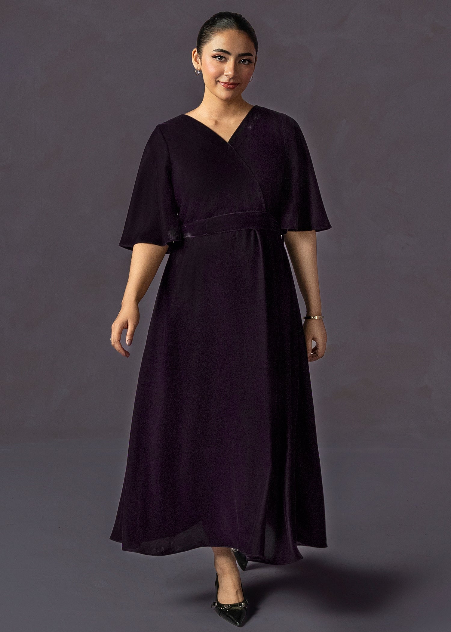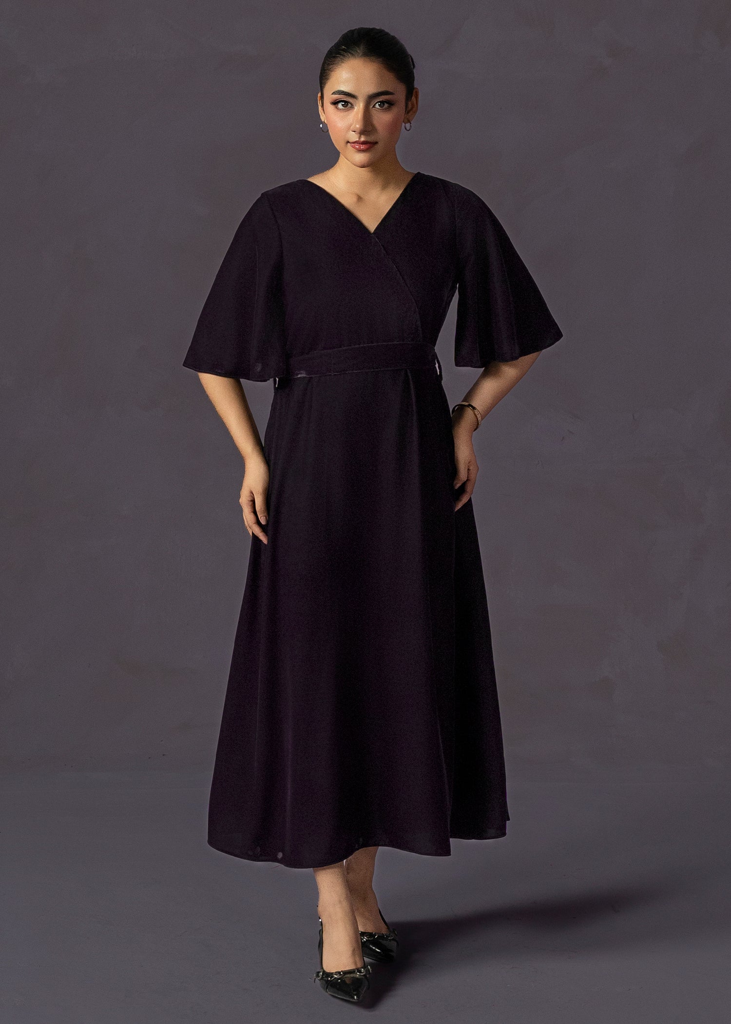 Elegant and timeless, this deep plum dress is crafted from soft velvet fabric that drapes beautifully over the body. It features a flattering wrap-style bodice with a V-neckline, wide flutter sleeves, and a defined waistband that cinches the silhouette gracefully. The flowy A-line skirt adds movement and sophistication, making it perfect for evening gatherings, dinners, or formal events.