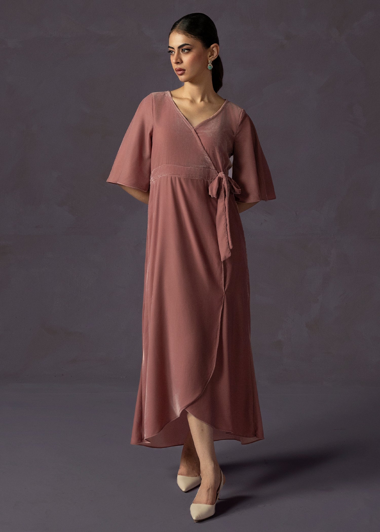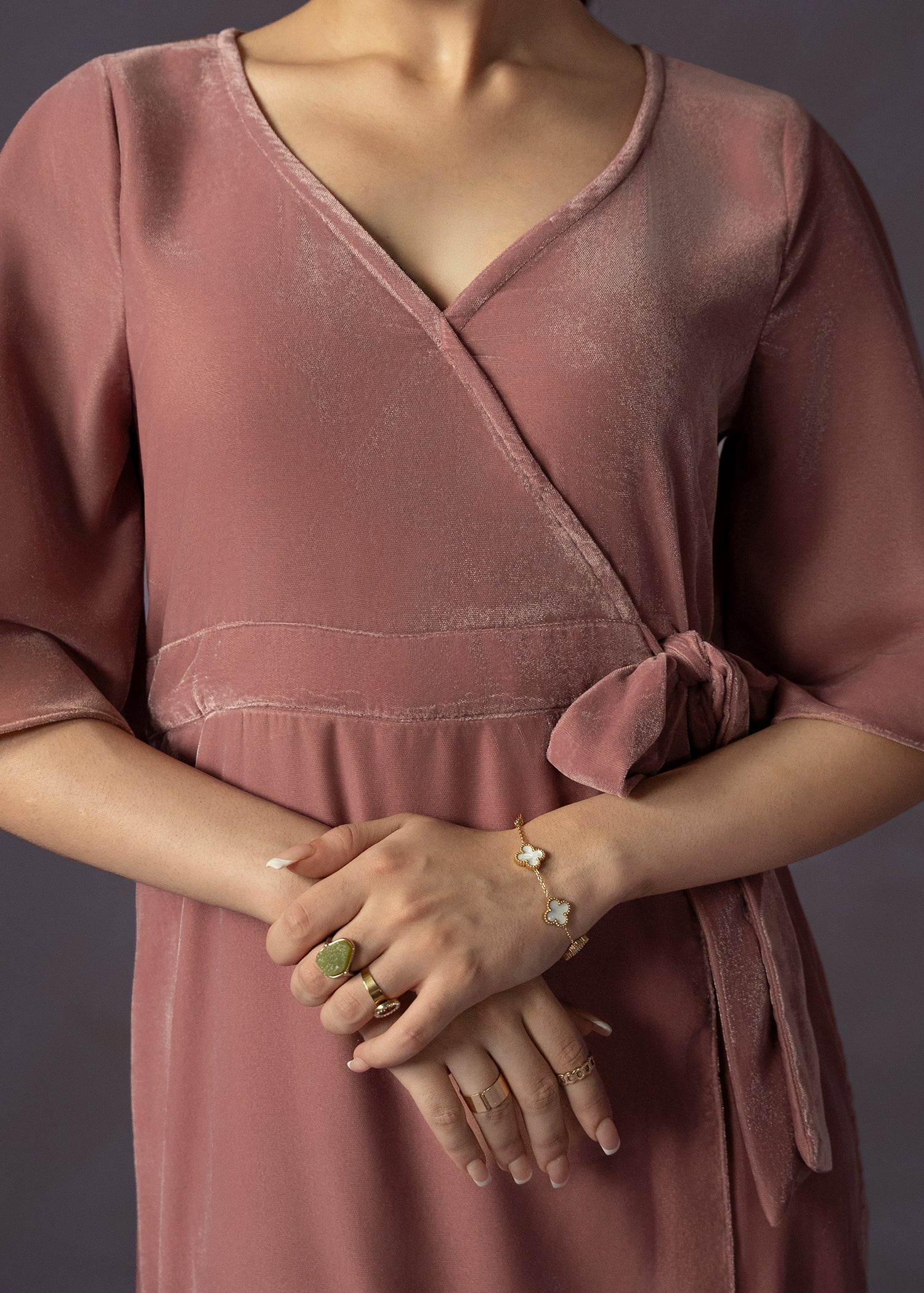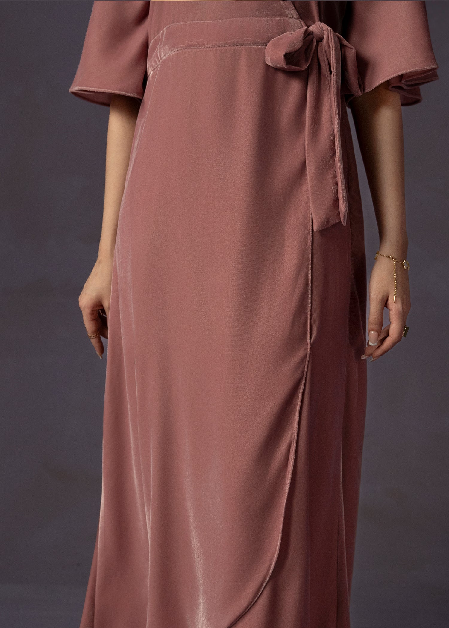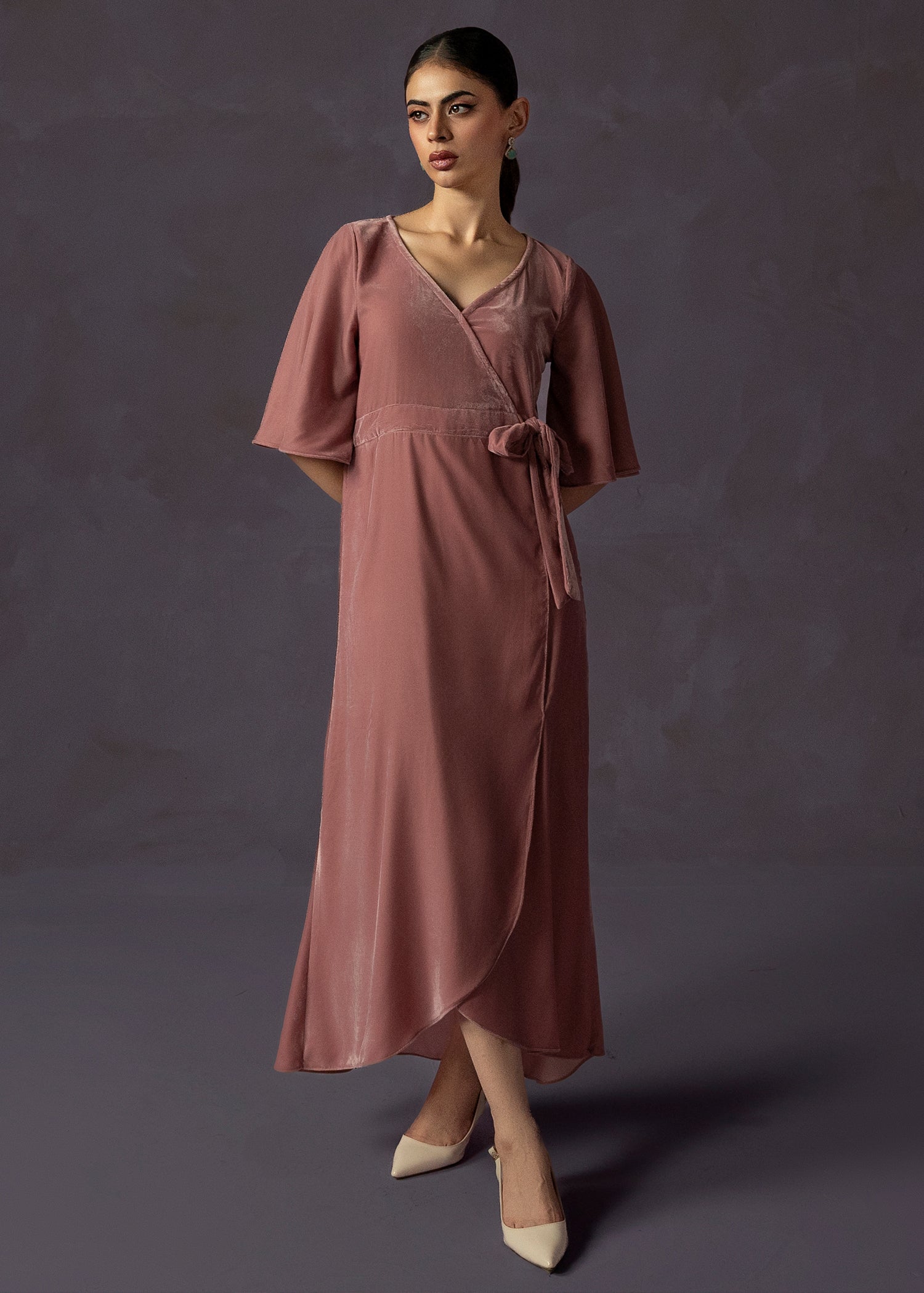 Chic and graceful, this wrap dress is designed to flatter with its soft drape and elegant silhouette. Crafted from flowy velvet, it features a V-neckline, flared sleeves, and a wrap-over front tied delicately at the waist. The asymmetrical hem adds a touch of movement and modern femininity, making it a perfect choice for both day and evening occasions.