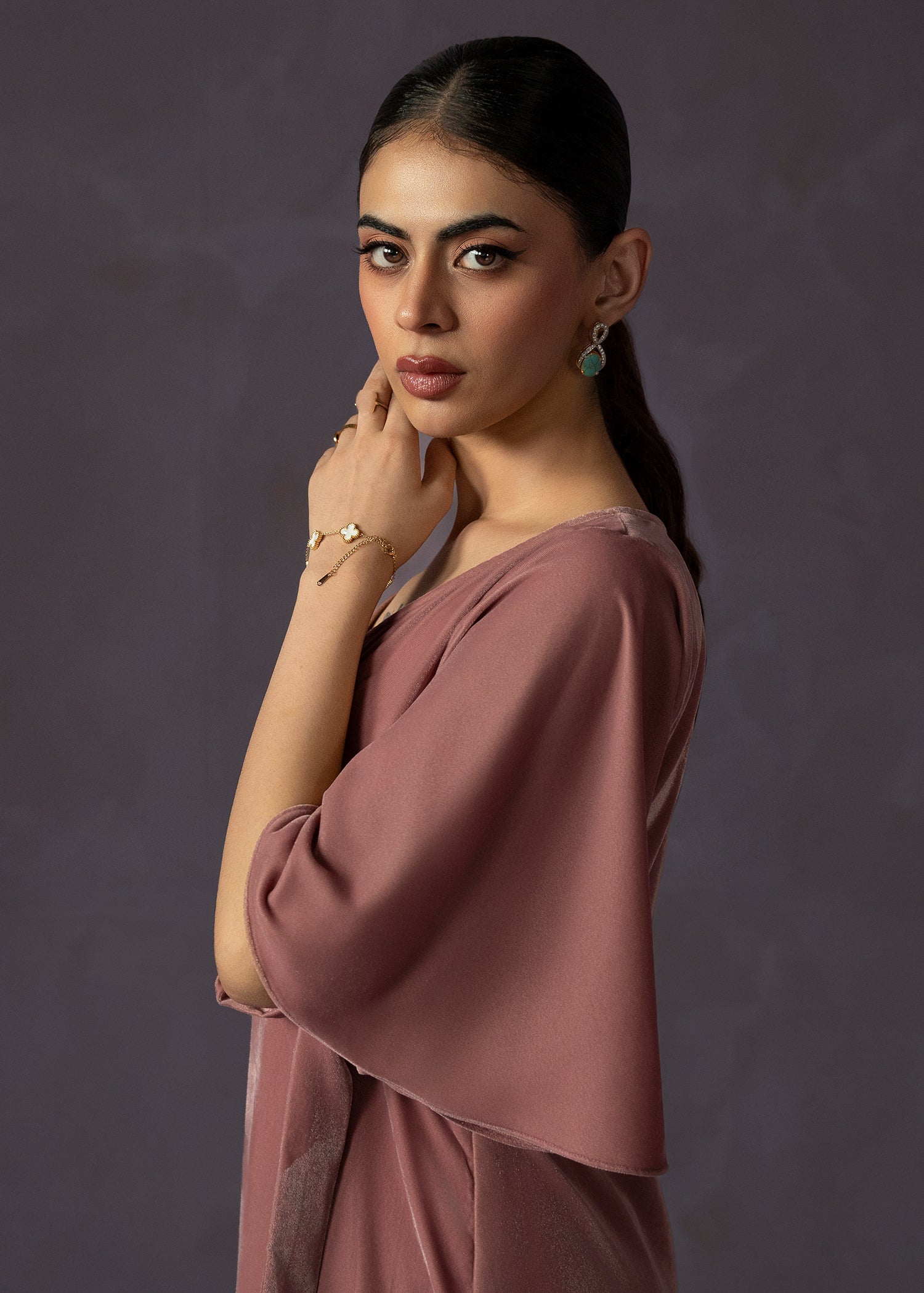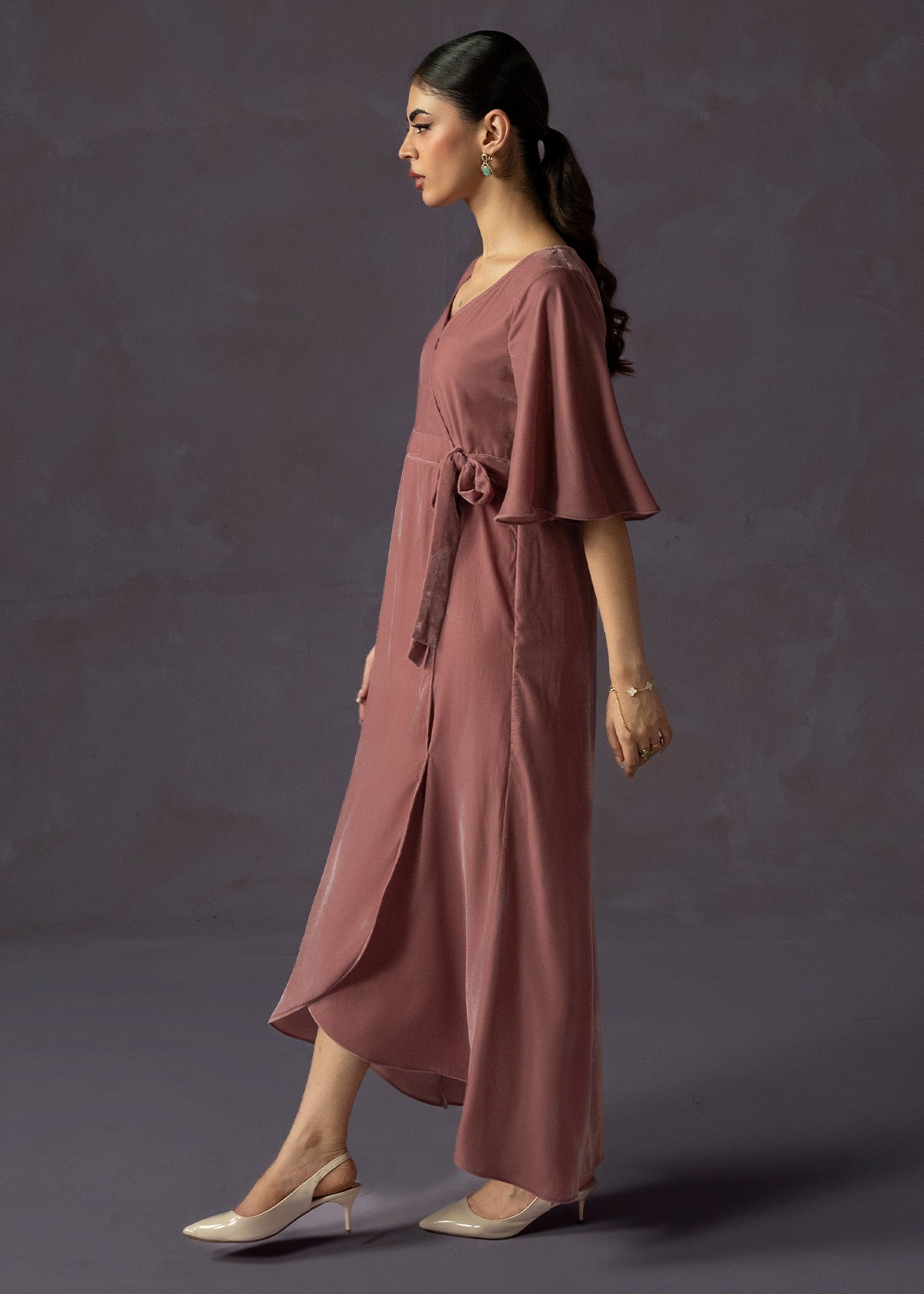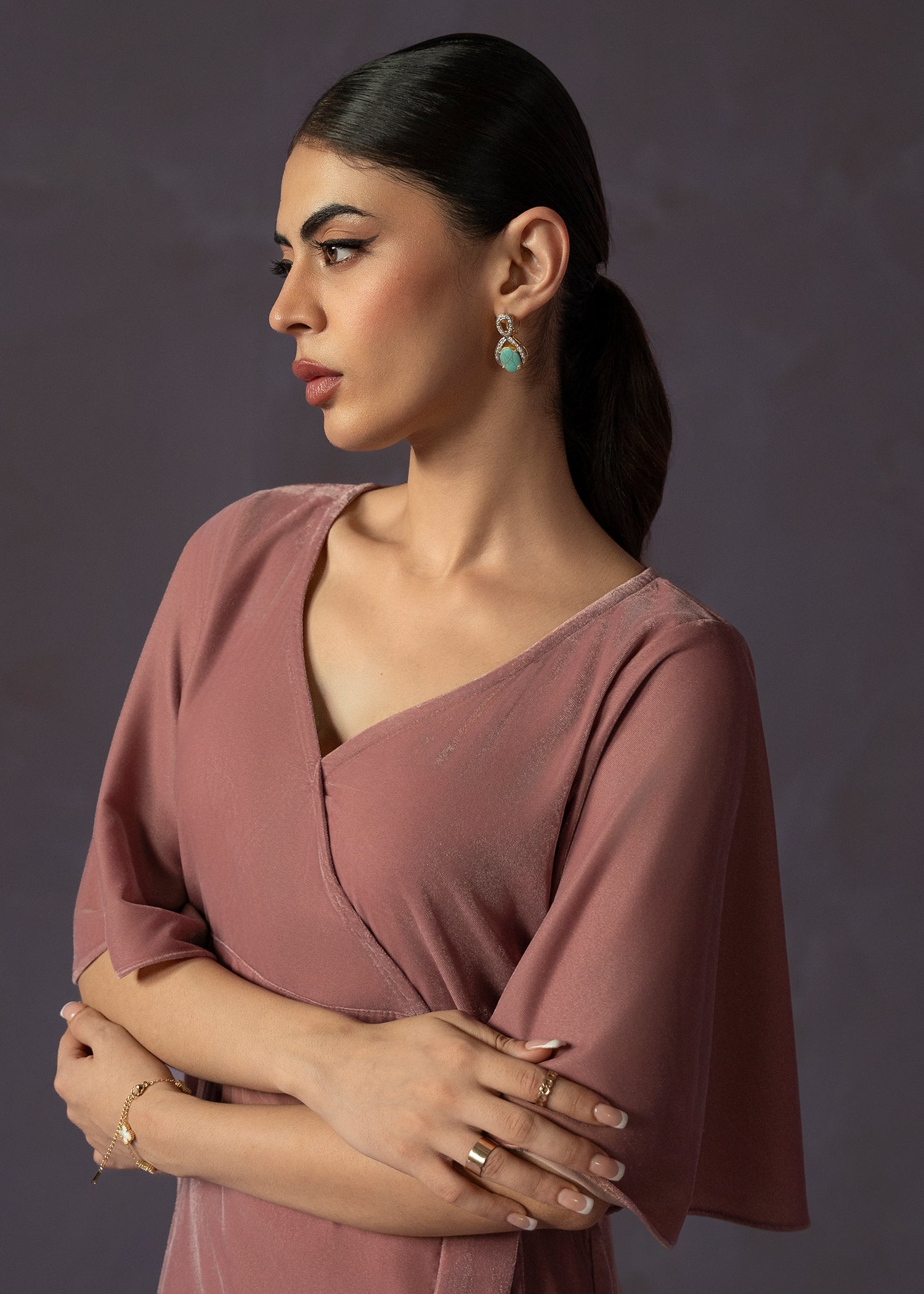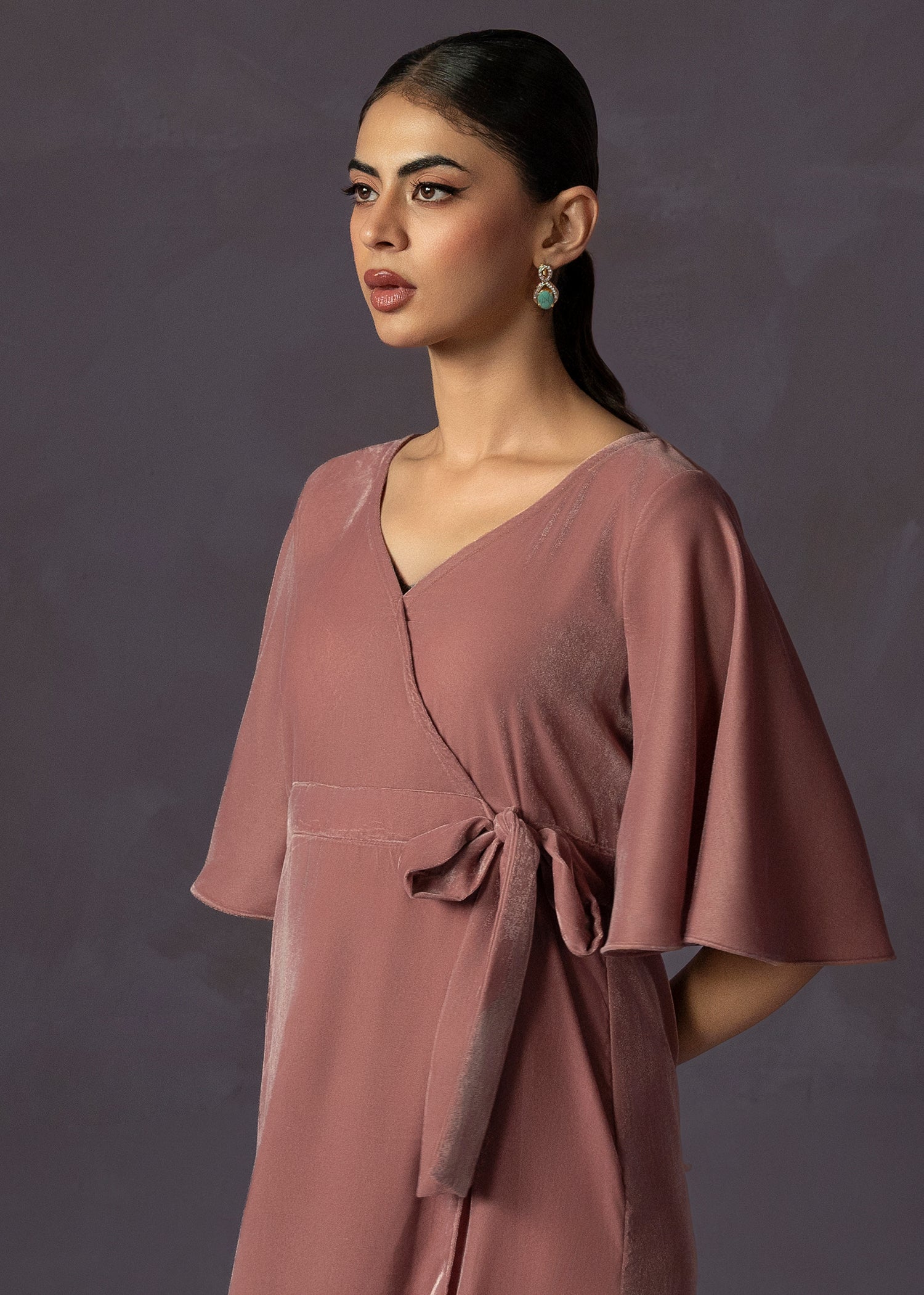 Chic and graceful, this wrap dress is designed to flatter with its soft drape and elegant silhouette. Crafted from flowy velvet, it features a V-neckline, flared sleeves, and a wrap-over front tied delicately at the waist. The asymmetrical hem adds a touch of movement and modern femininity, making it a perfect choice for both day and evening occasions.