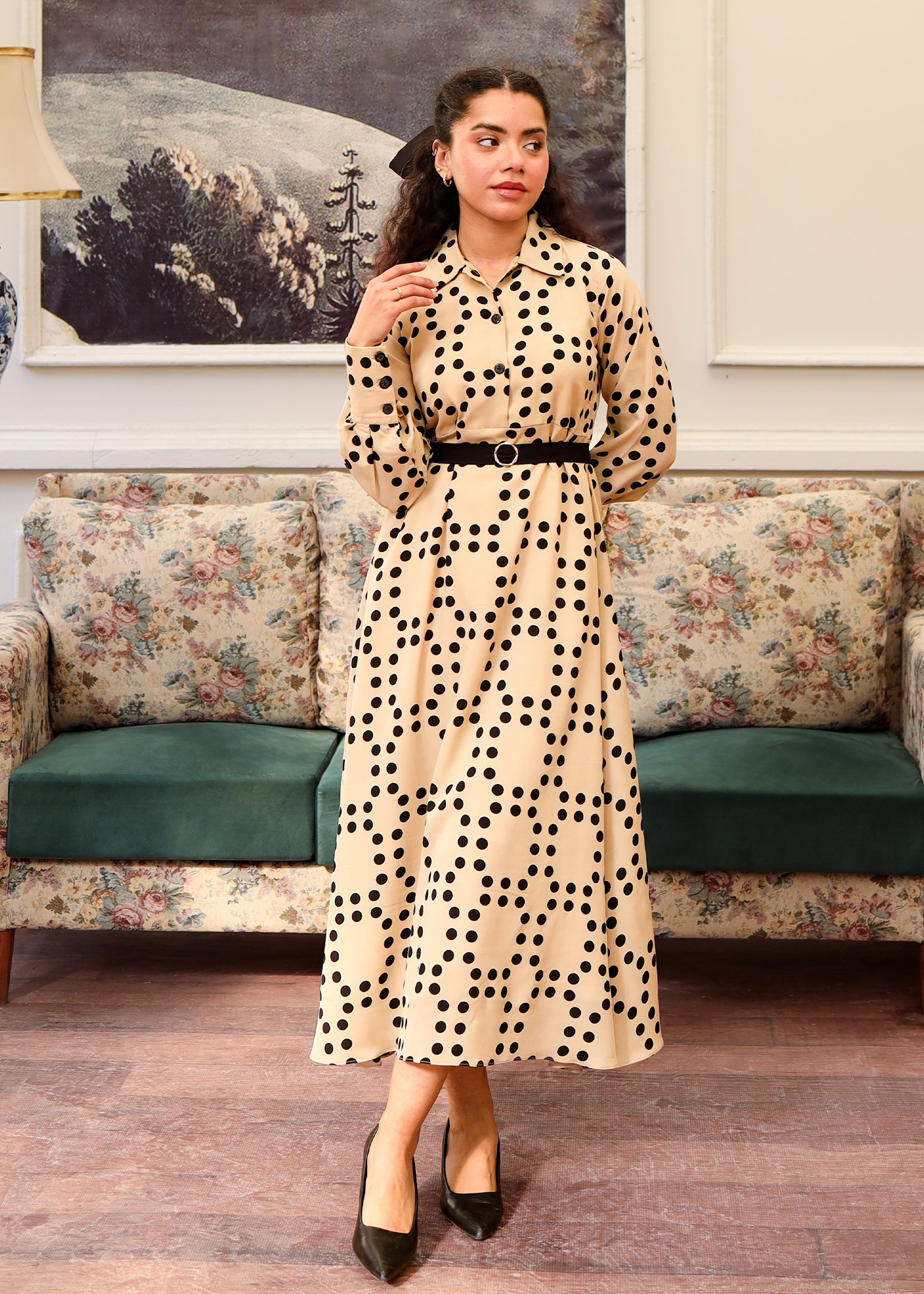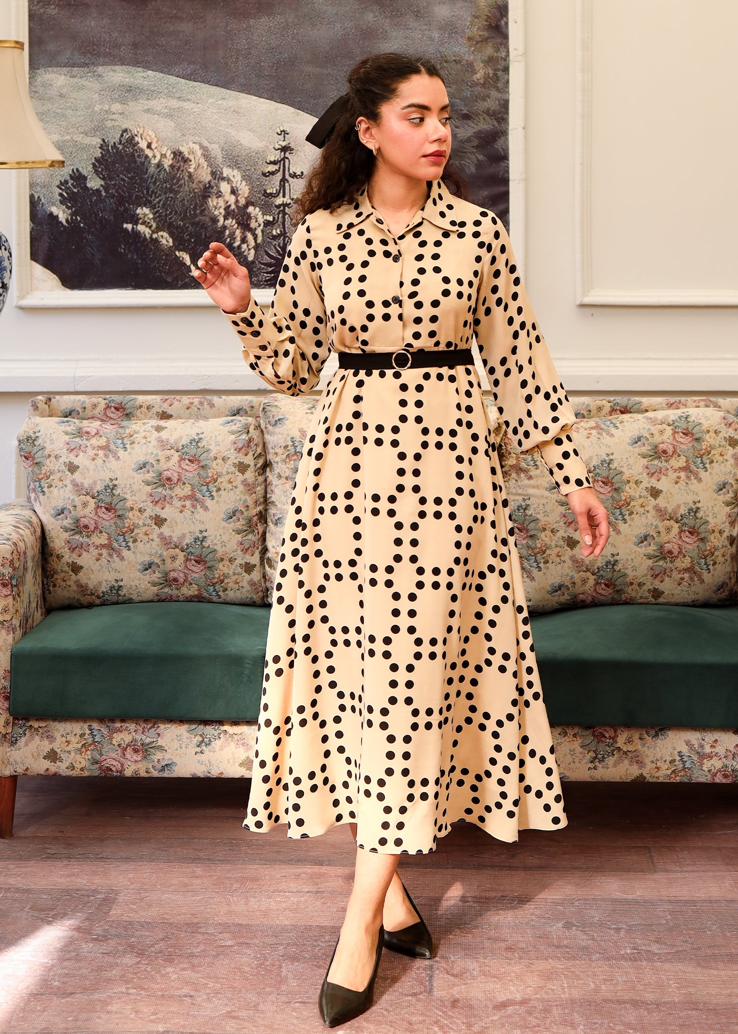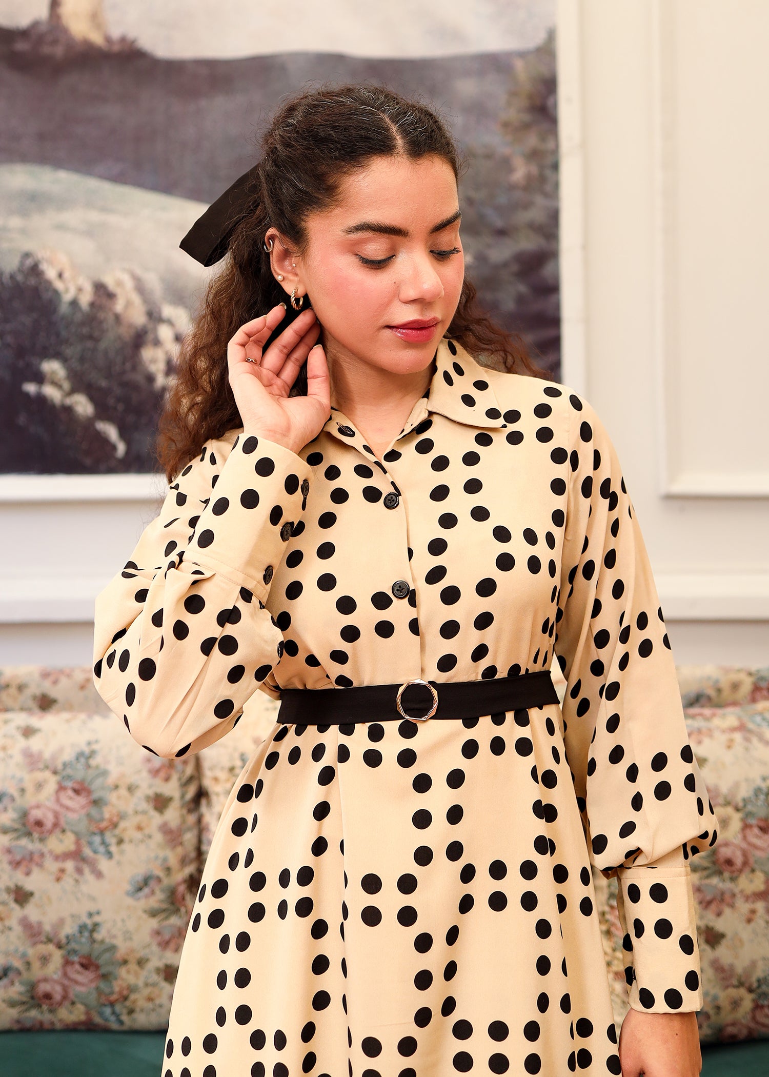 Our Beige Polka Dots Dress features a collar neckline with button details, loose fit cuff sleeves and a plain black belt with a golden buckle.