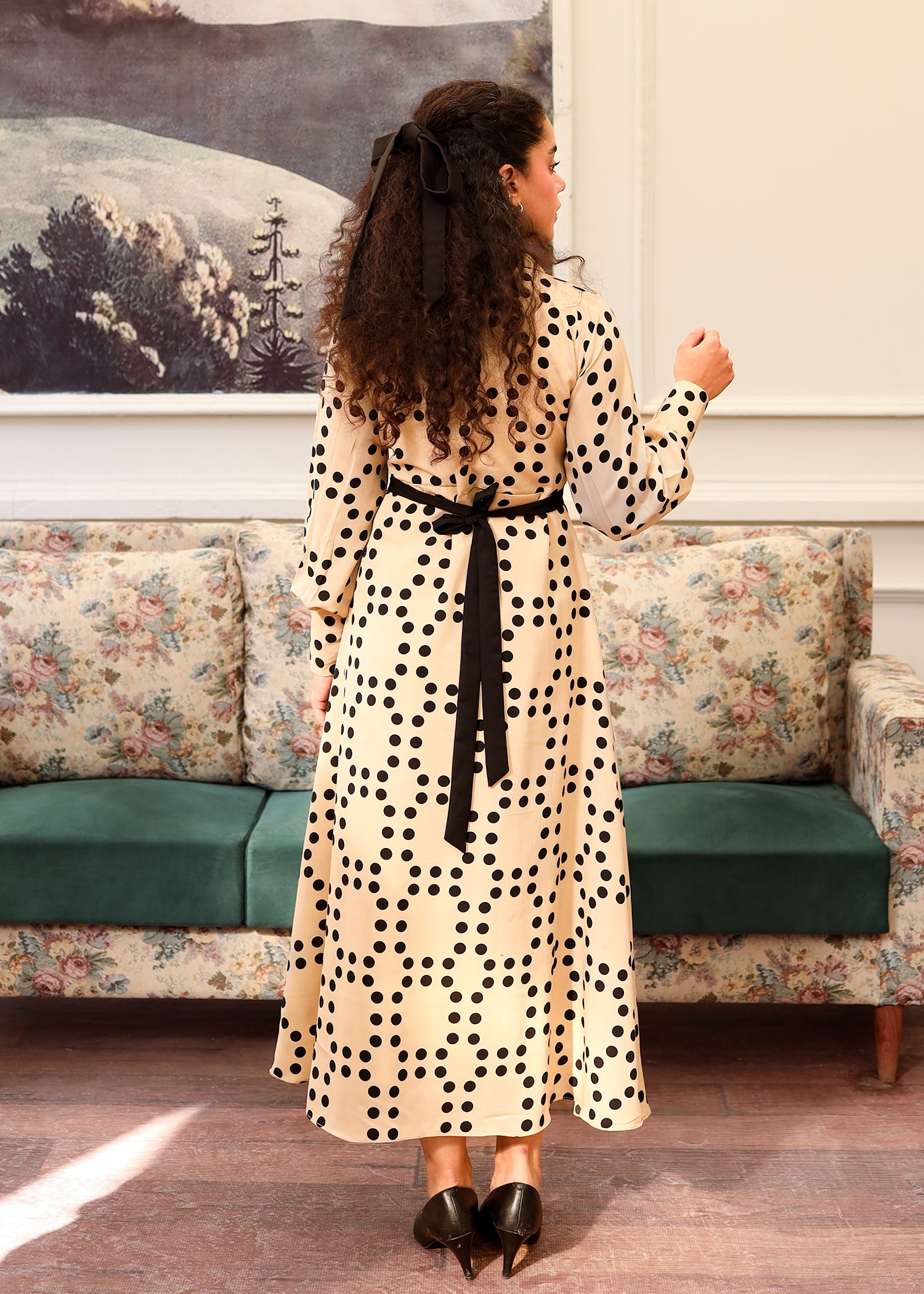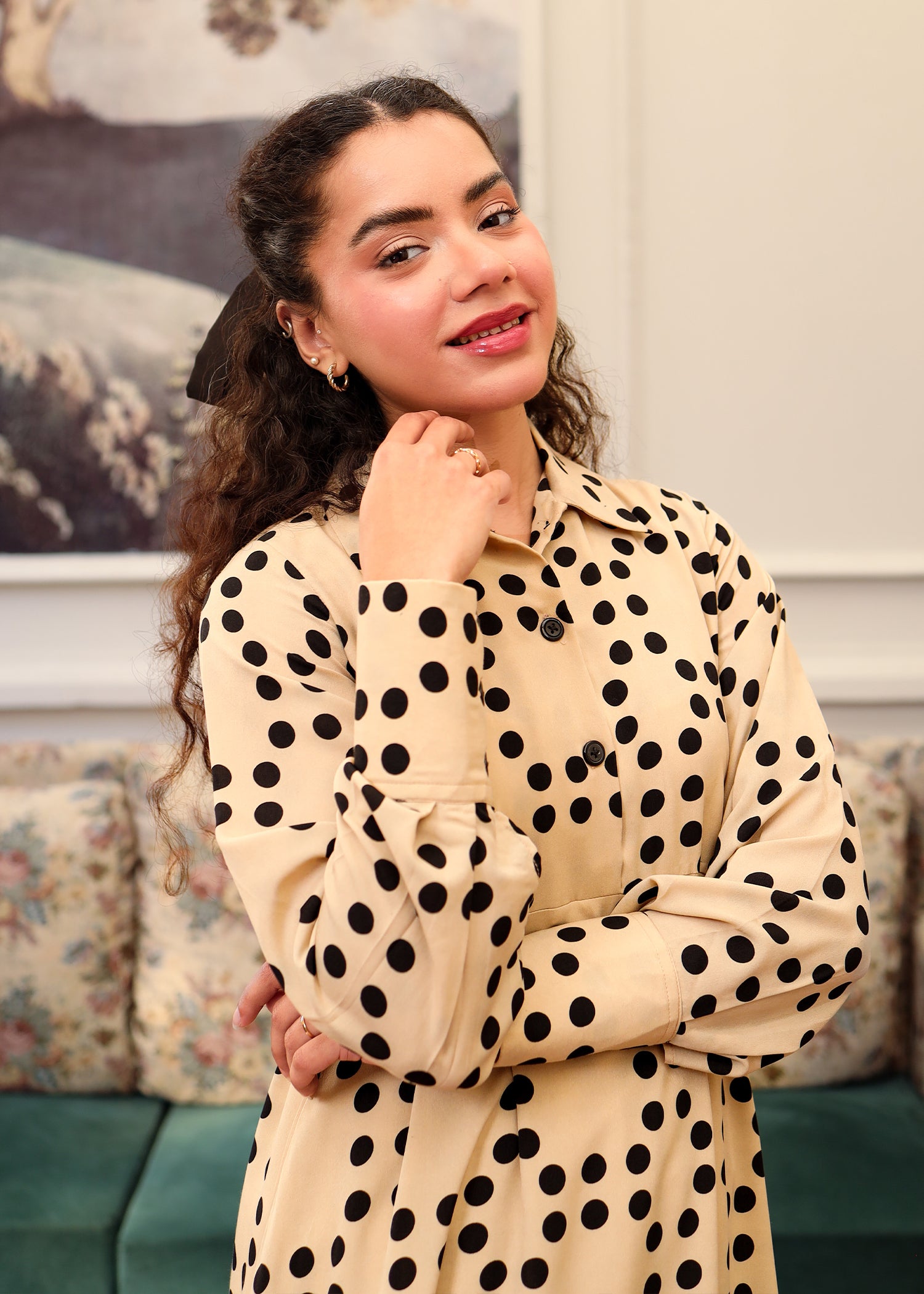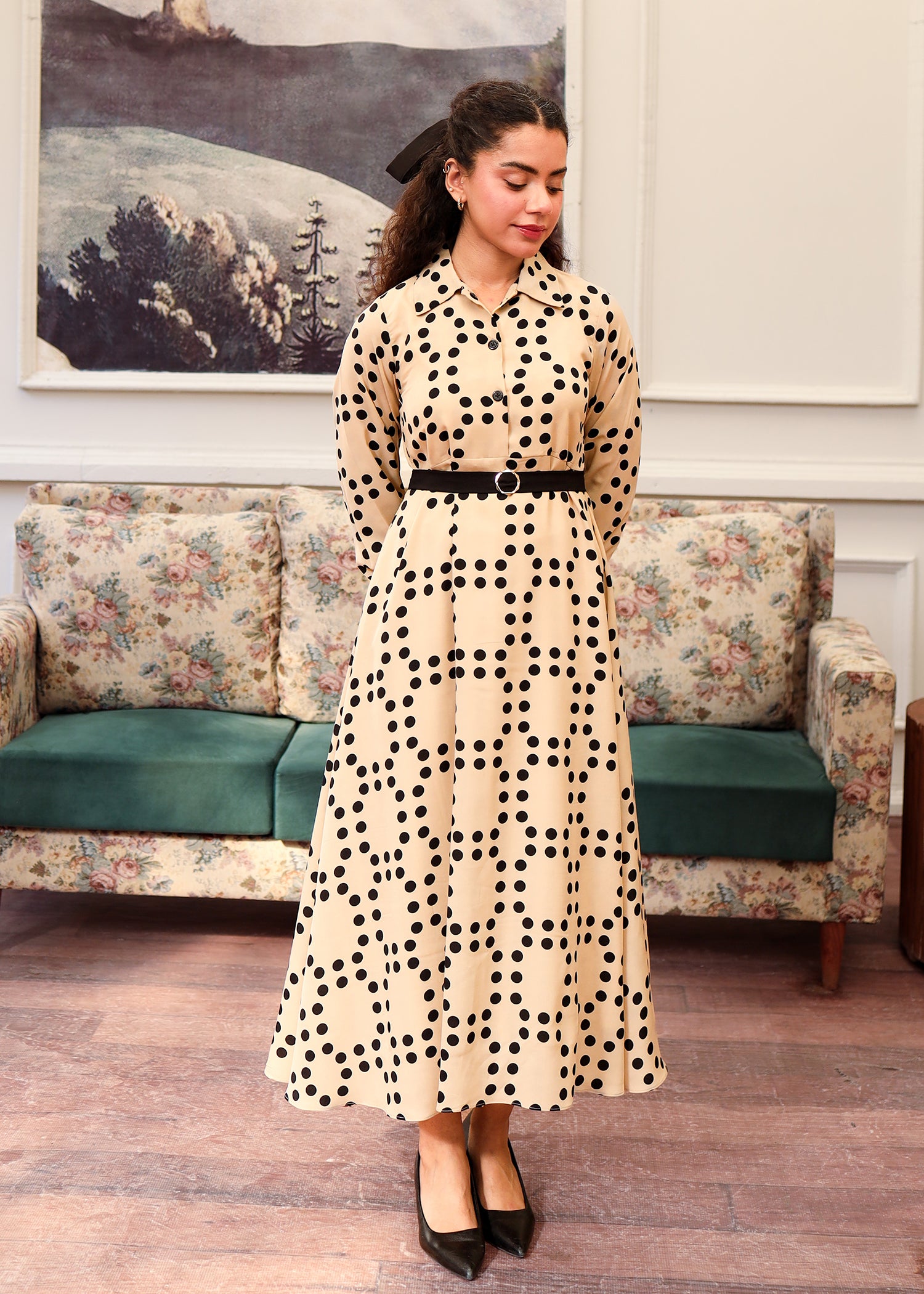 Our Beige Polka Dots Dress features a collar neckline with button details, loose fit cuff sleeves and a plain black belt with a golden buckle.