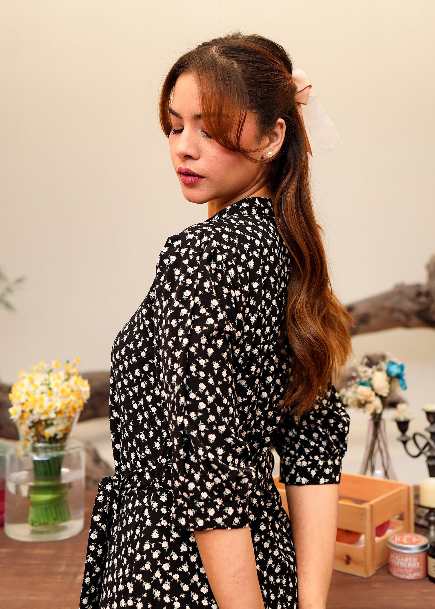 Embrace effortless charm with our Black Floral Dress, a perfect blend of elegance and ease. Featuring a graceful V-band neckline and a chic button-down style, this dress exudes timeless appeal. The loose puffy sleeves add a touch of playfulness, making it a versatile choice for any occasion. Whether dressed up or down, this floral beauty is sure to turn heads.