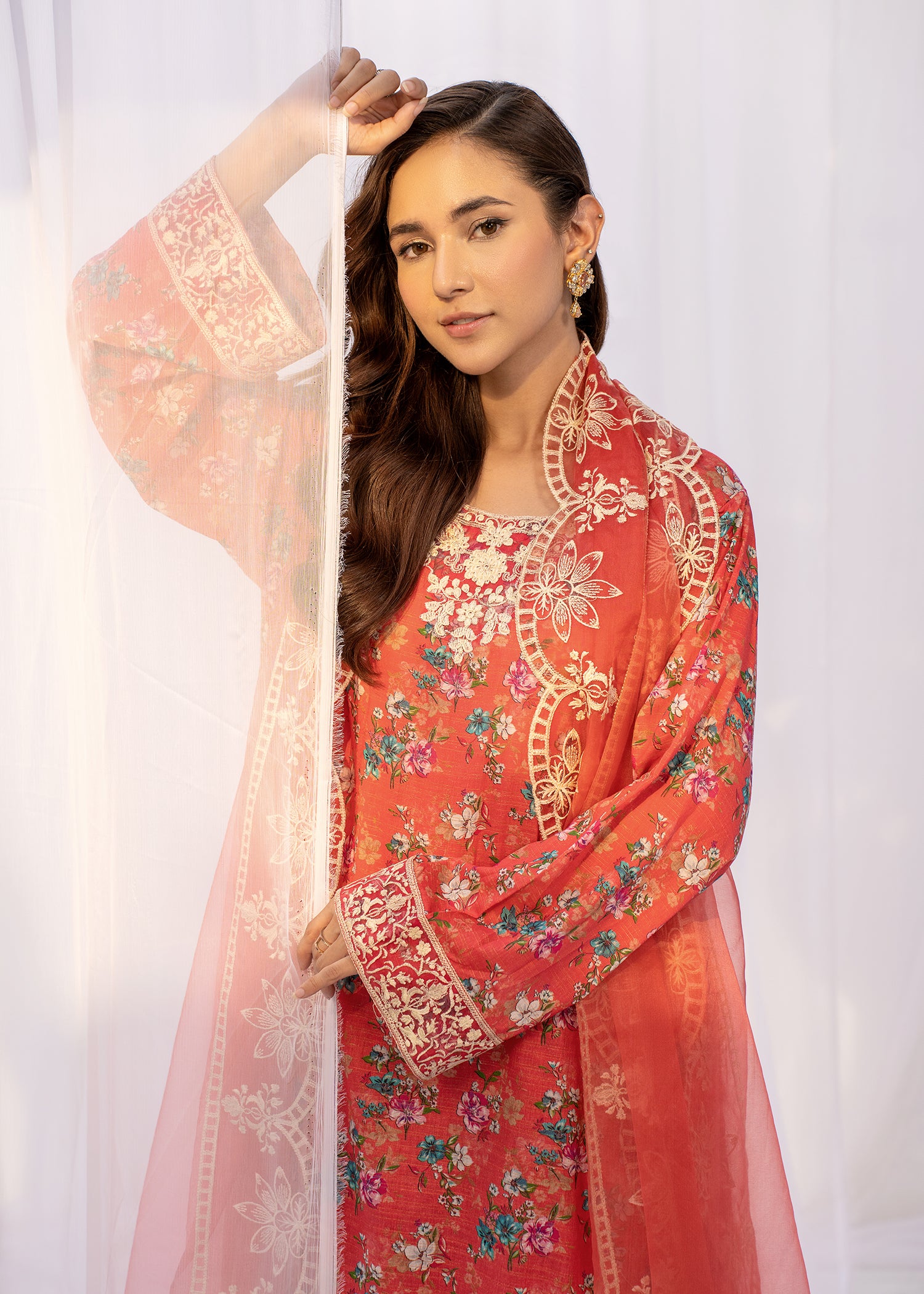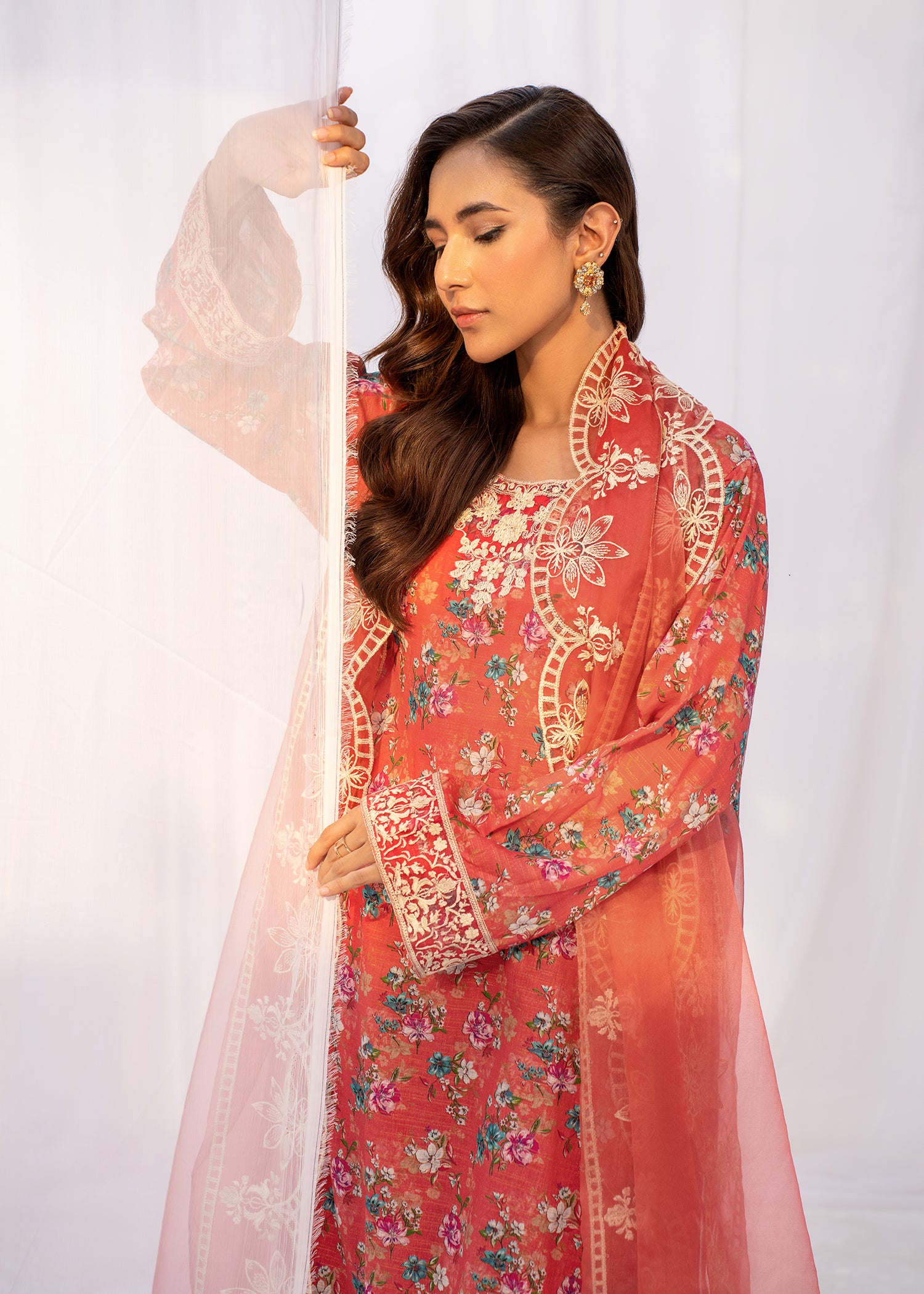 Introducing our blooming pink floral 3-piece suit, a harmonious blend of elegance and intricate artistry. The ensemble features a loose-fit shirt adorned with a captivating floral print, beautifully accentuated by an exquisitely embroidered neckline. The sleeves are elegantly finished with embroidered hems, enhancing the shirt's luxurious allure. Completing the set is a stunning embroidered organza dupatta, adding an ethereal charm with its delicate and intricate designs. Perfect for any special occasion, this outfit embodies timeless beauty and modern grace.
