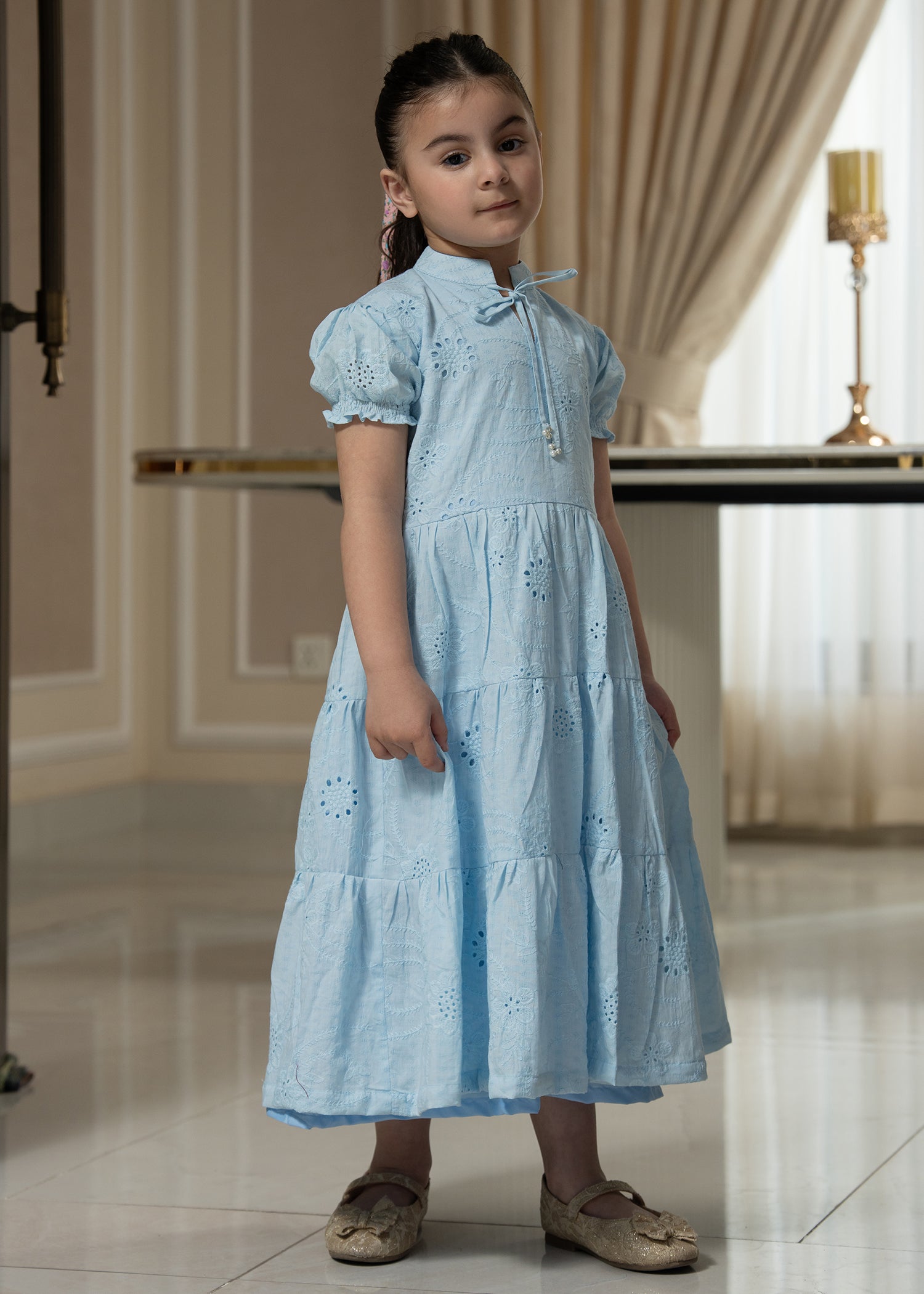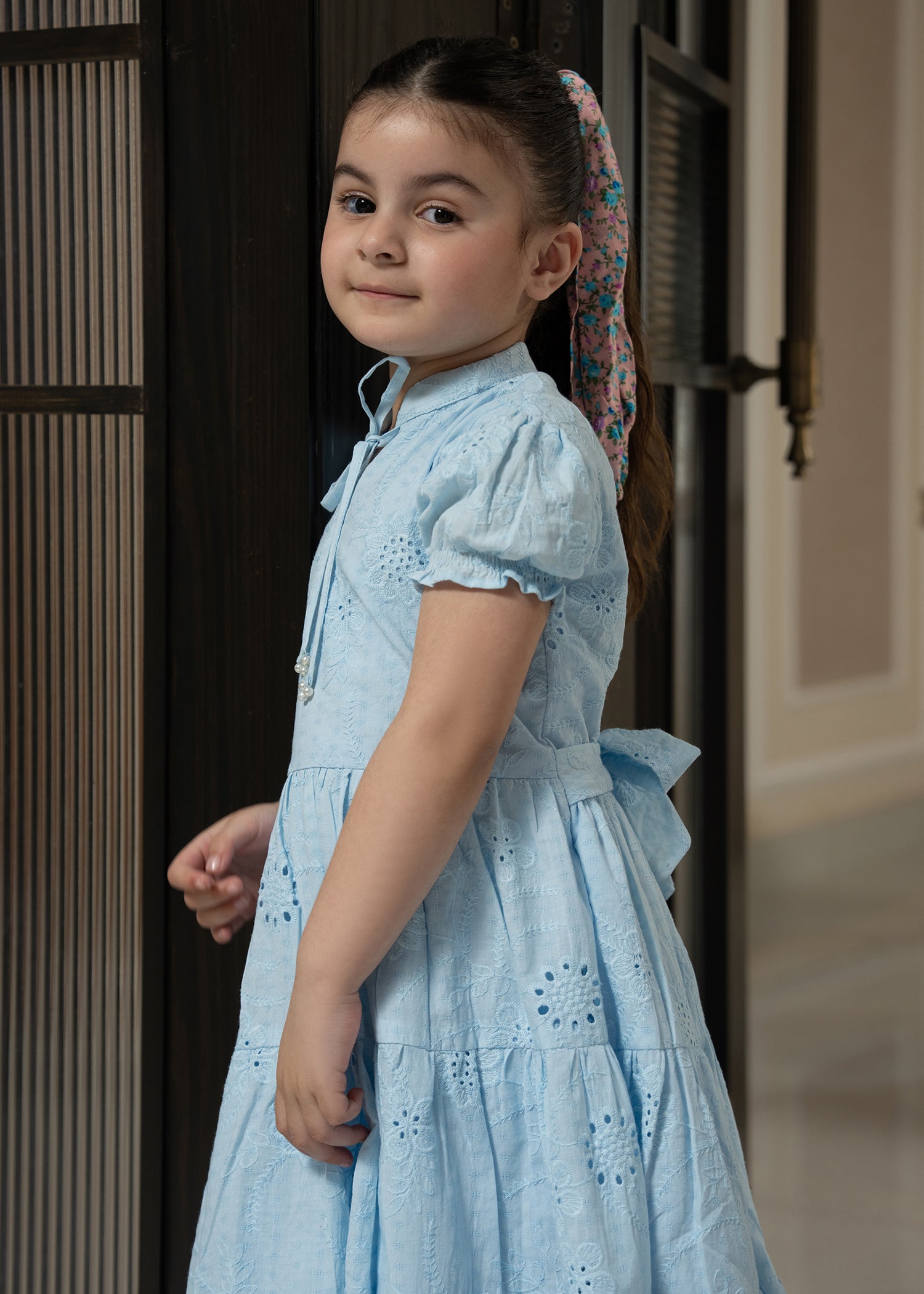 This powder blue mini dress is designed for comfort with a charming, playful feel. The collared neckline adds a neat finish, while the tiered silhouette allows easy movement for all-day wear. Light, breathable, and picture-perfect for special days and outings.