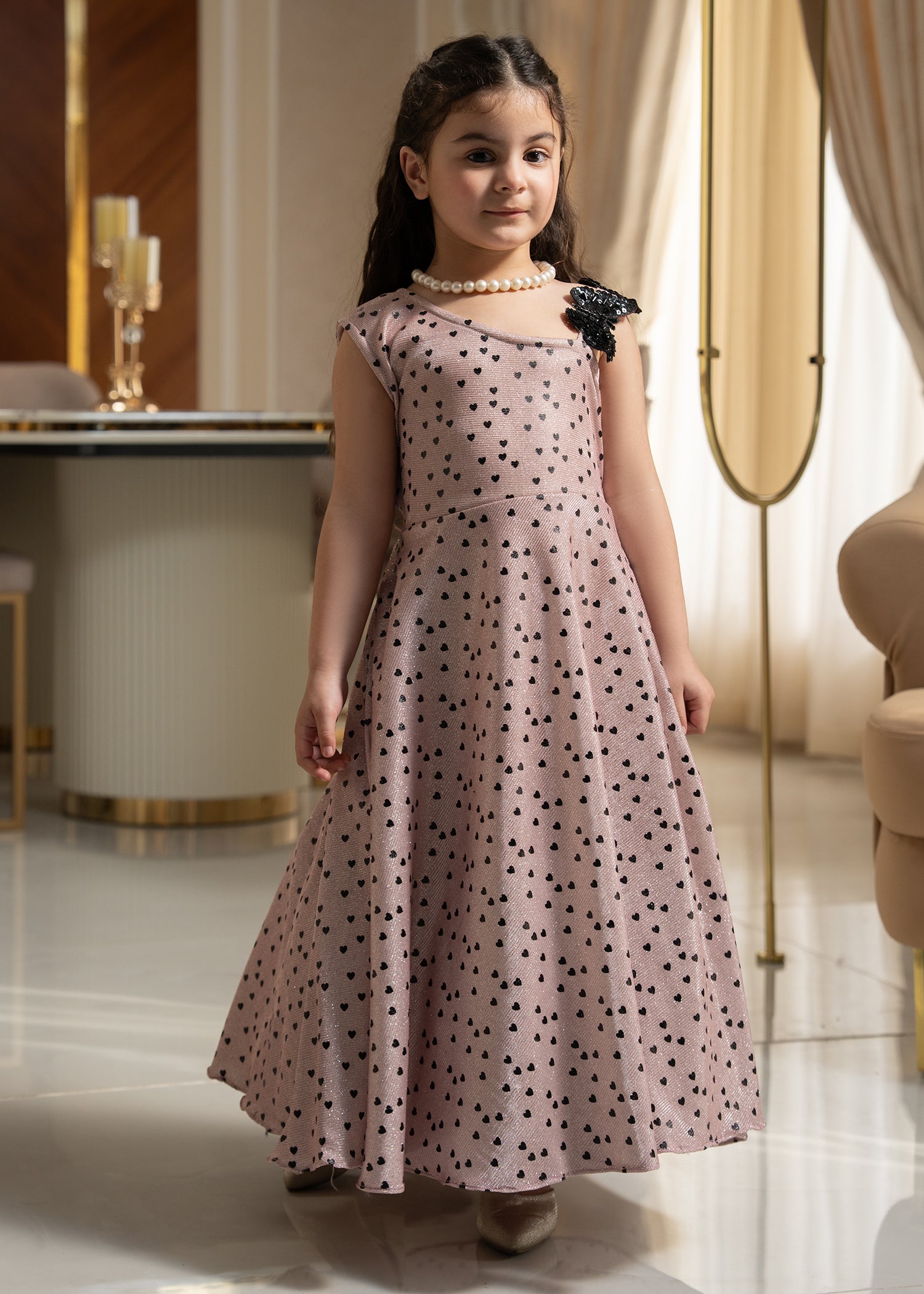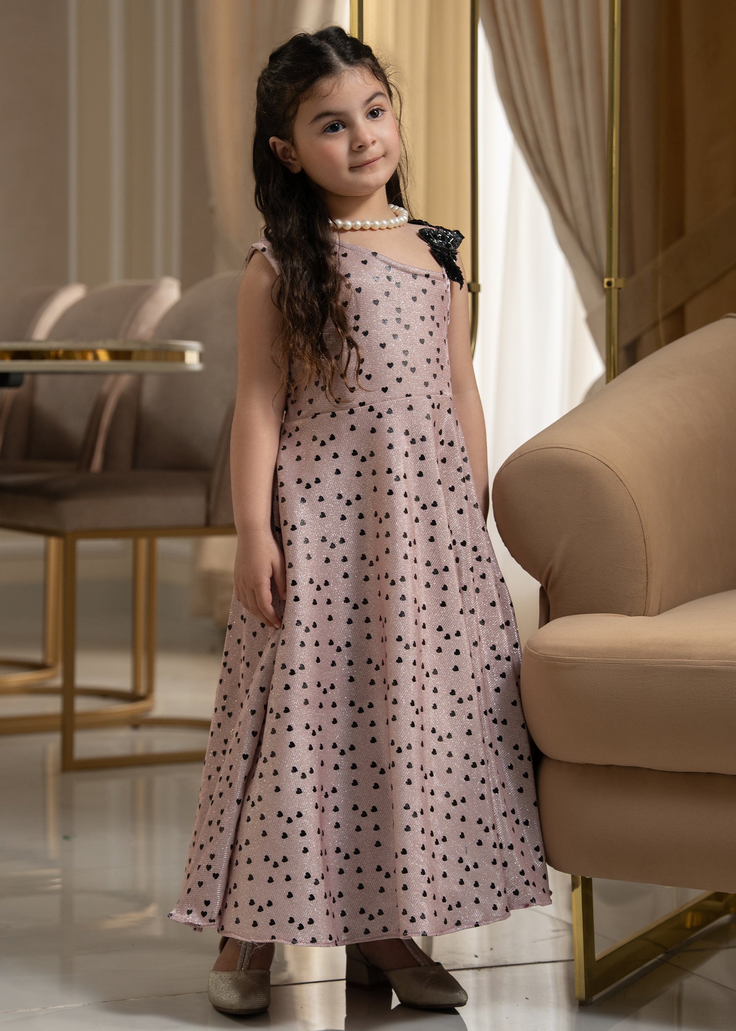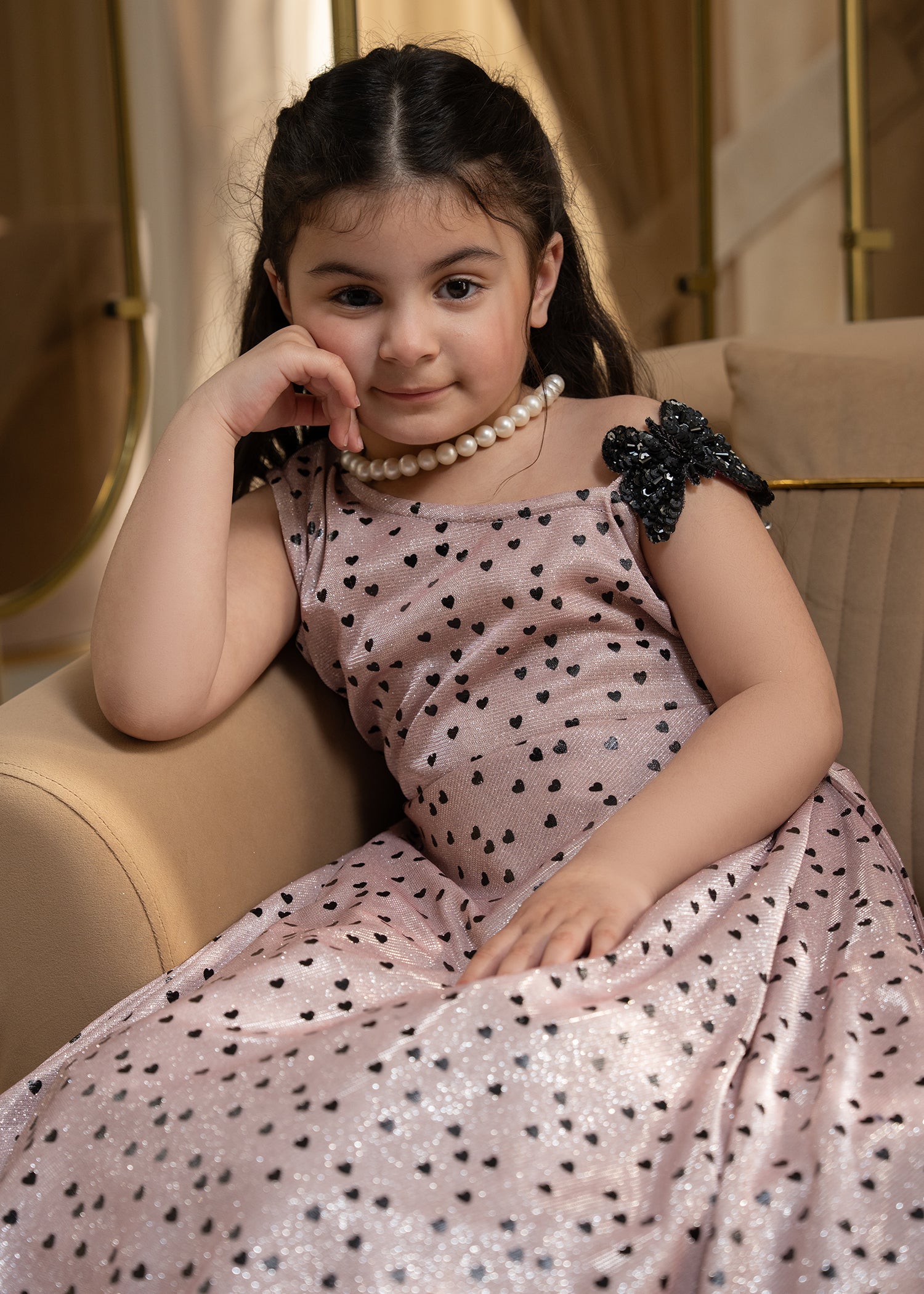 Sweet, graceful, and full of charm — the Moonlight Kids Dress is designed to make every little moment feel special. Crafted in a soft blush-toned fabric adorned with delicate black hearts, this sleeveless silhouette features a gently fitted bodice that flows into a beautifully flared skirt for the perfect twirl.