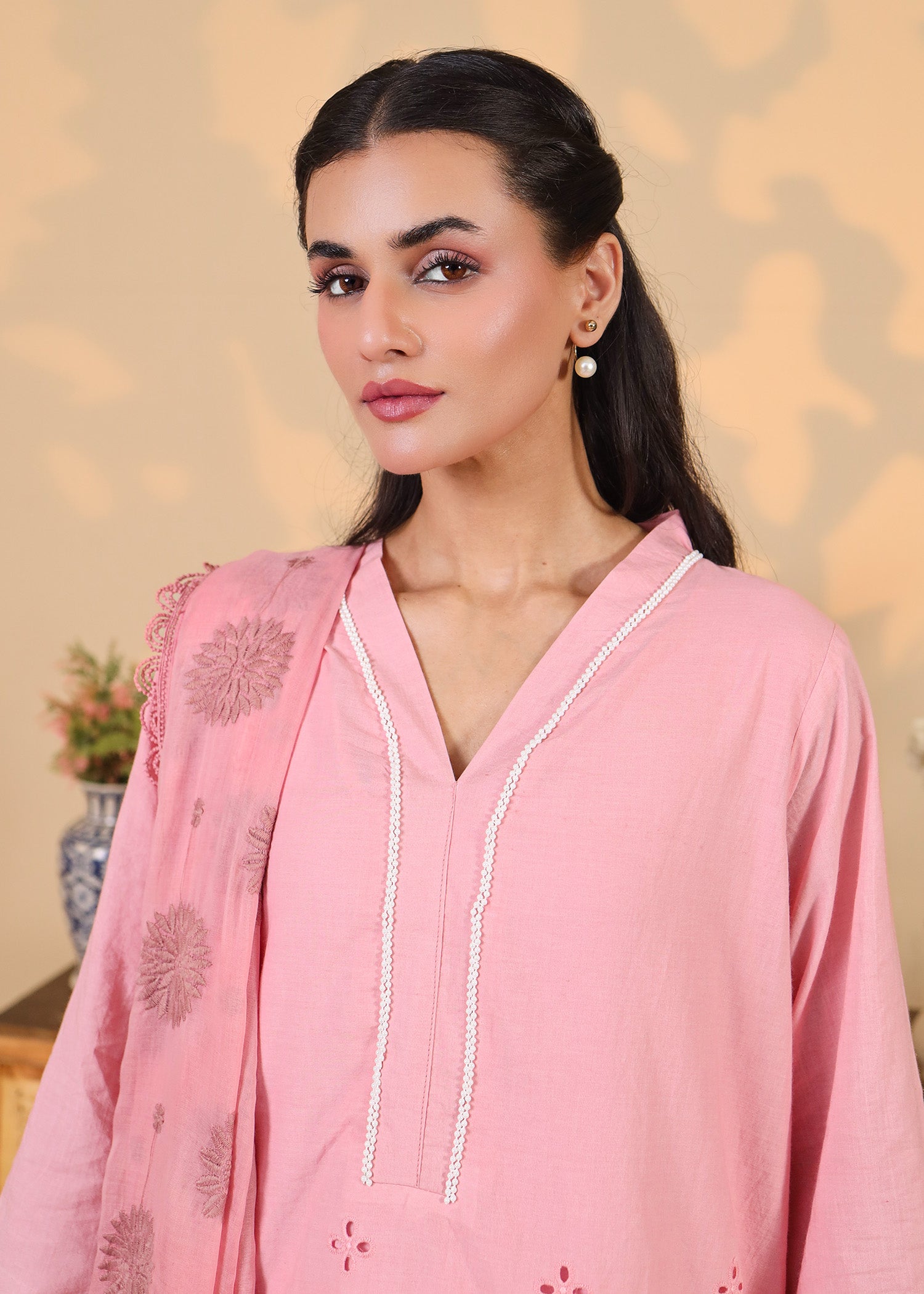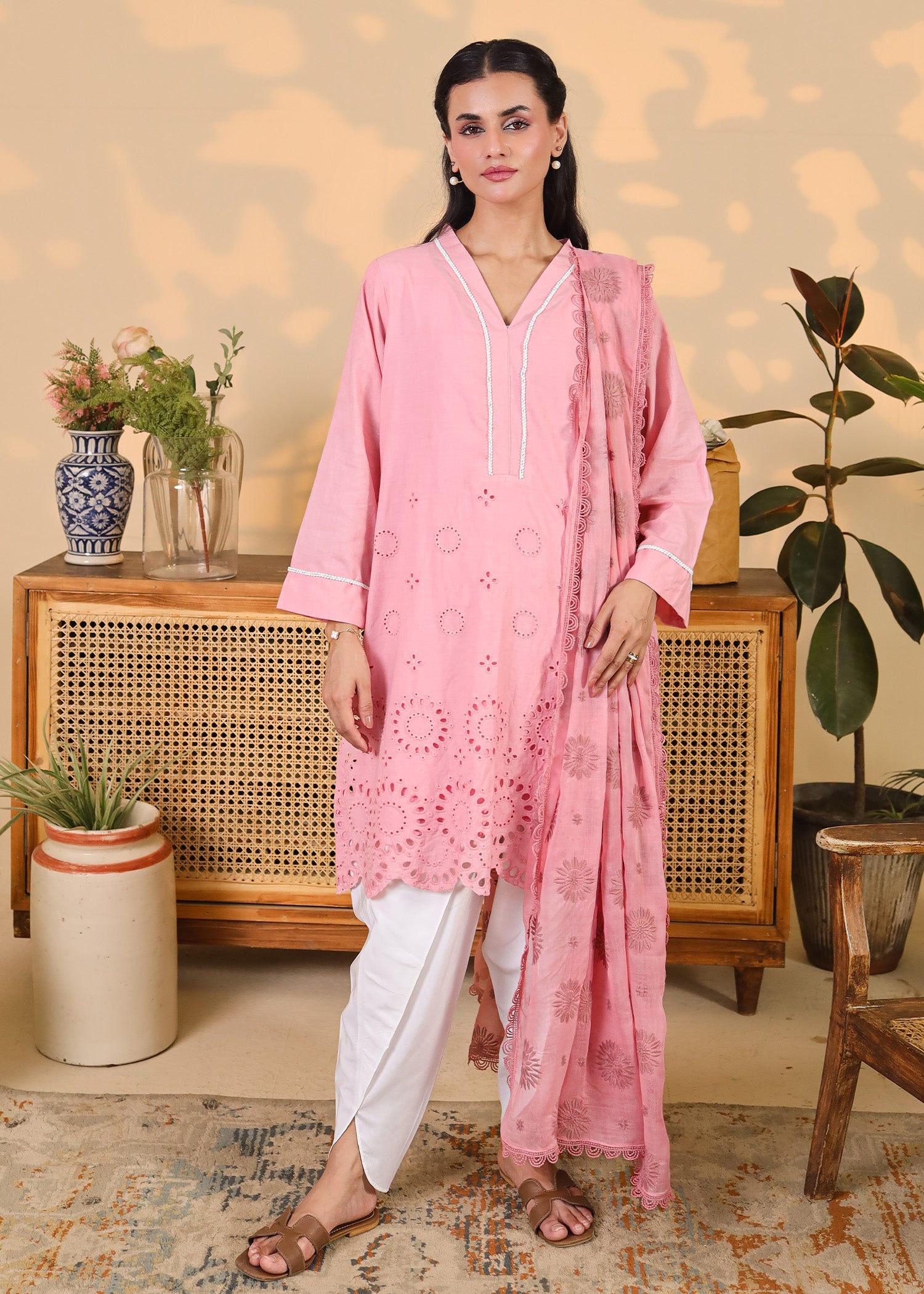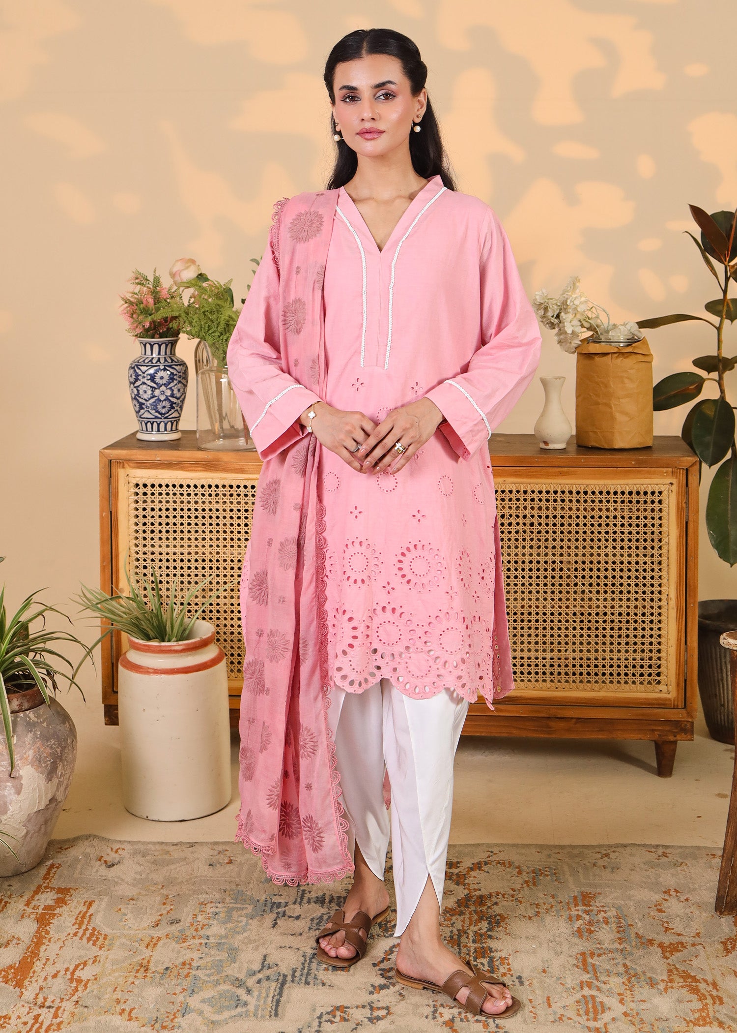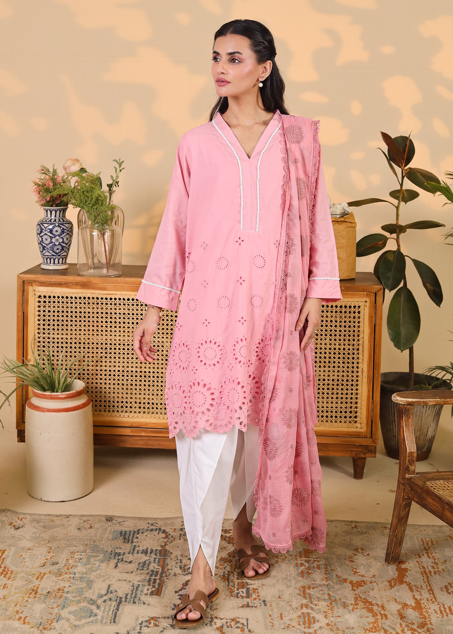 Featuring intricate eyelet embroidery and scalloped hemlines, the soft cotton shirt is paired with a matching embroidered dupatta and crisp white tulip pants. Delicate detailing at the neckline and sleeves adds a refined touch, making this set perfect for festive mornings, casual get-togethers, or daytime celebrations.