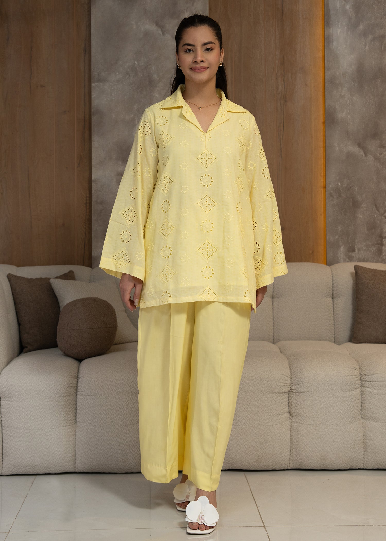 Fresh, soft, and effortlessly chic — the Buttercup Co-ord Set is designed in a soothing butter-yellow tone for a light and airy feel. The shirt is crafted from delicate eyelet fabric, featuring a relaxed silhouette and subtle detailing, while the straight-fit trousers are made from breathable cotton for all-day comfort. Perfect for warm days, casual outings, and relaxed festive wear, this set blends comfort with understated elegance.