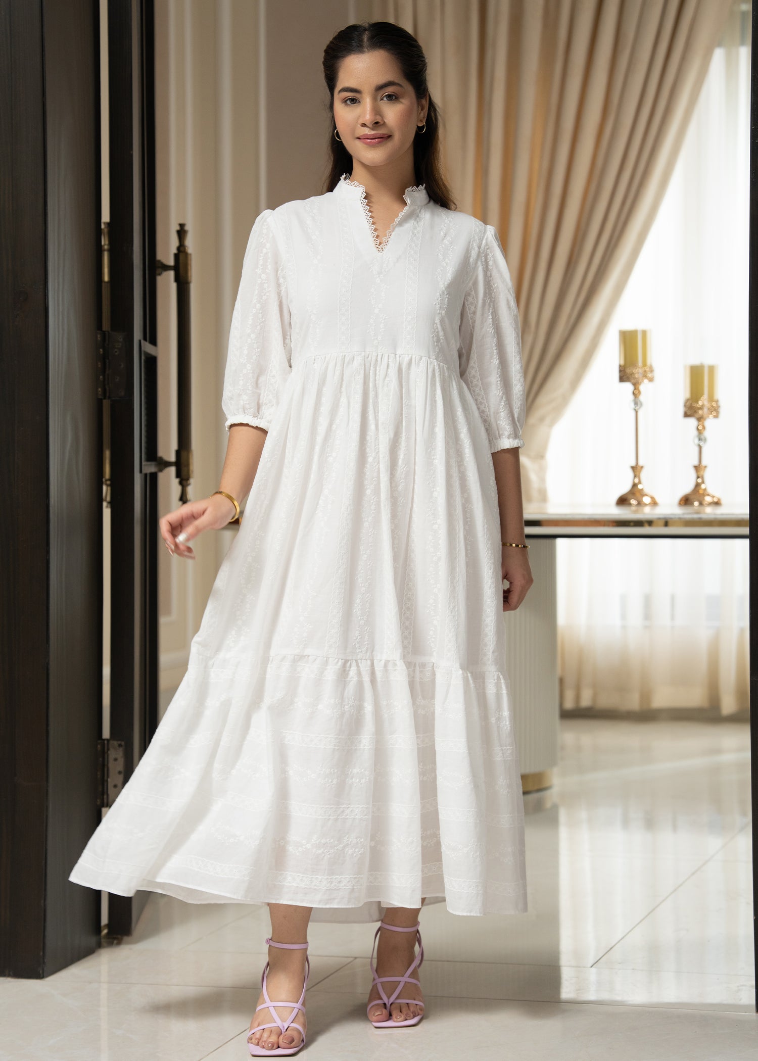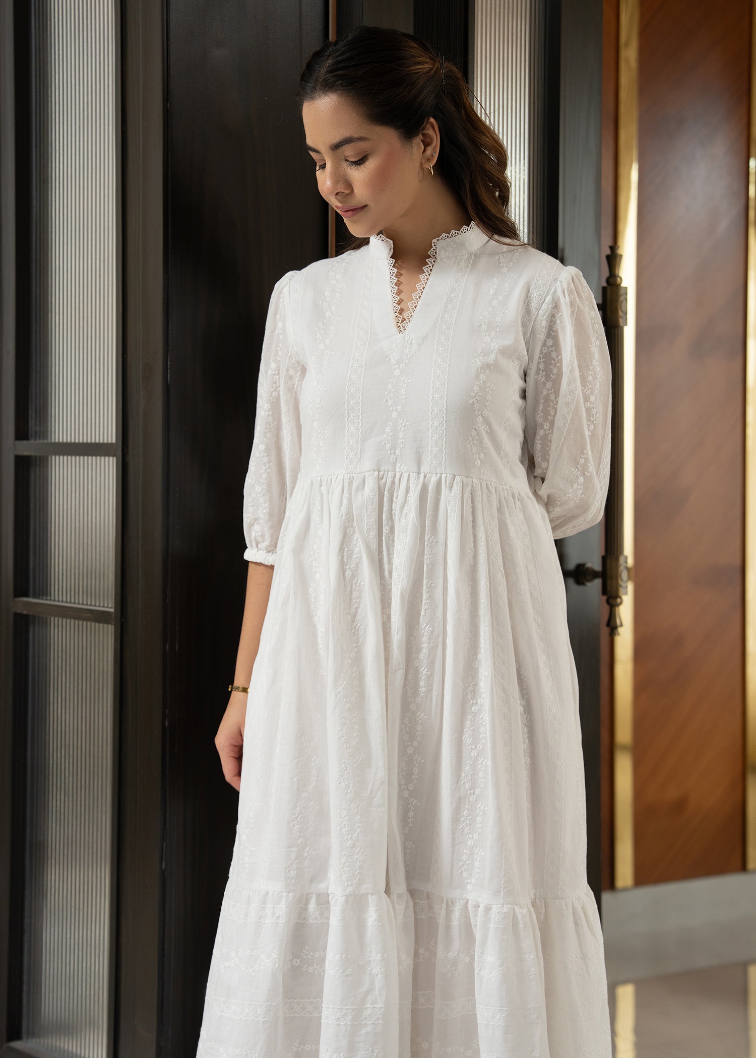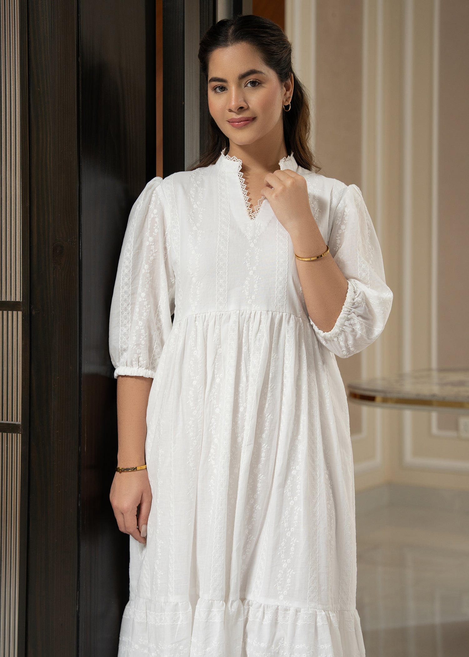 Soft, airy, and effortlessly elegant — the Camomile Dress is crafted in delicate eyelet fabric for a light, breathable feel. Designed with a graceful V-notch neckline, subtle front detailing, and a flowy tiered silhouette, it offers timeless charm and everyday comfort. The serene white tone makes it a versatile piece for daytime gatherings, brunches, and summer festivities.