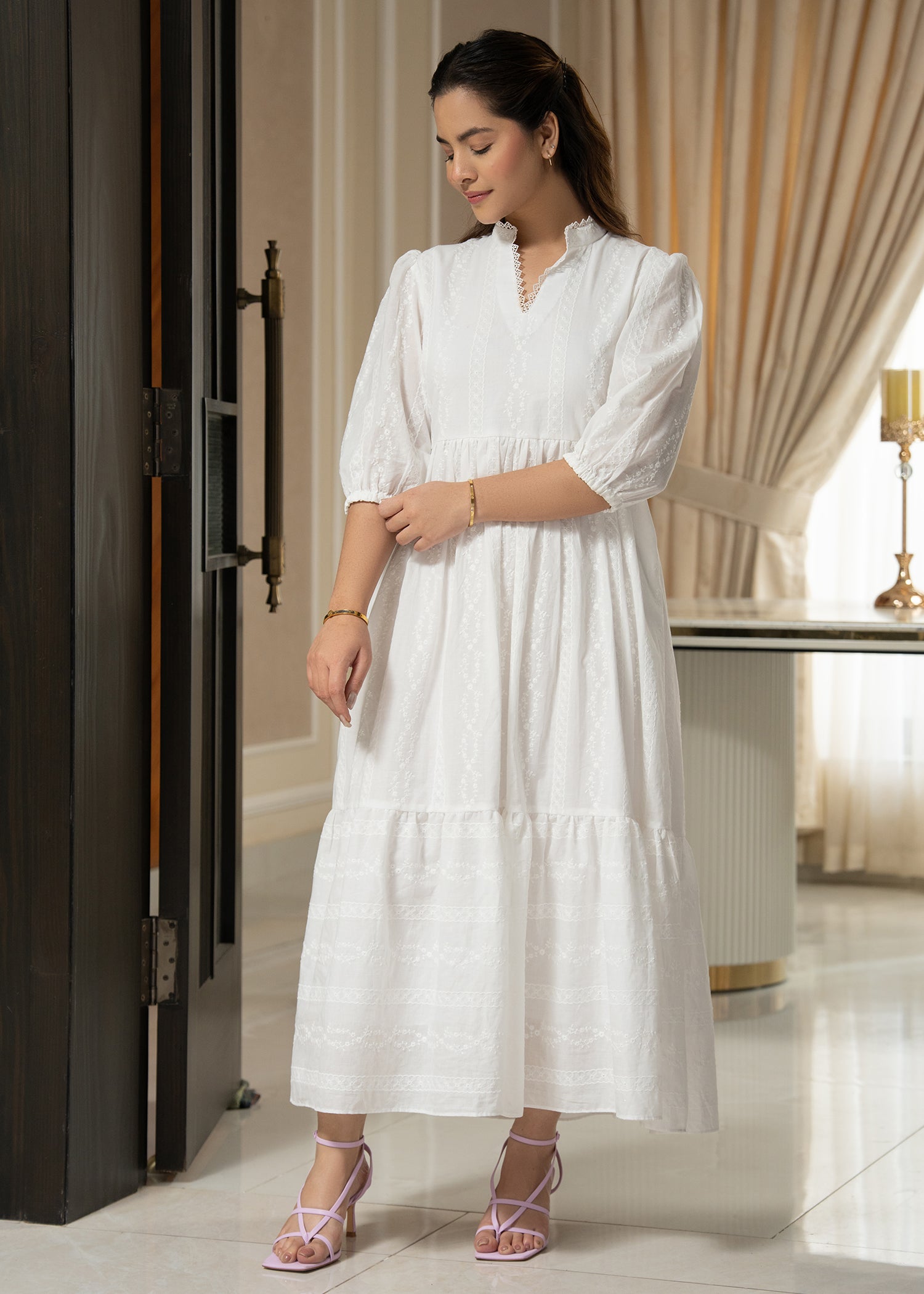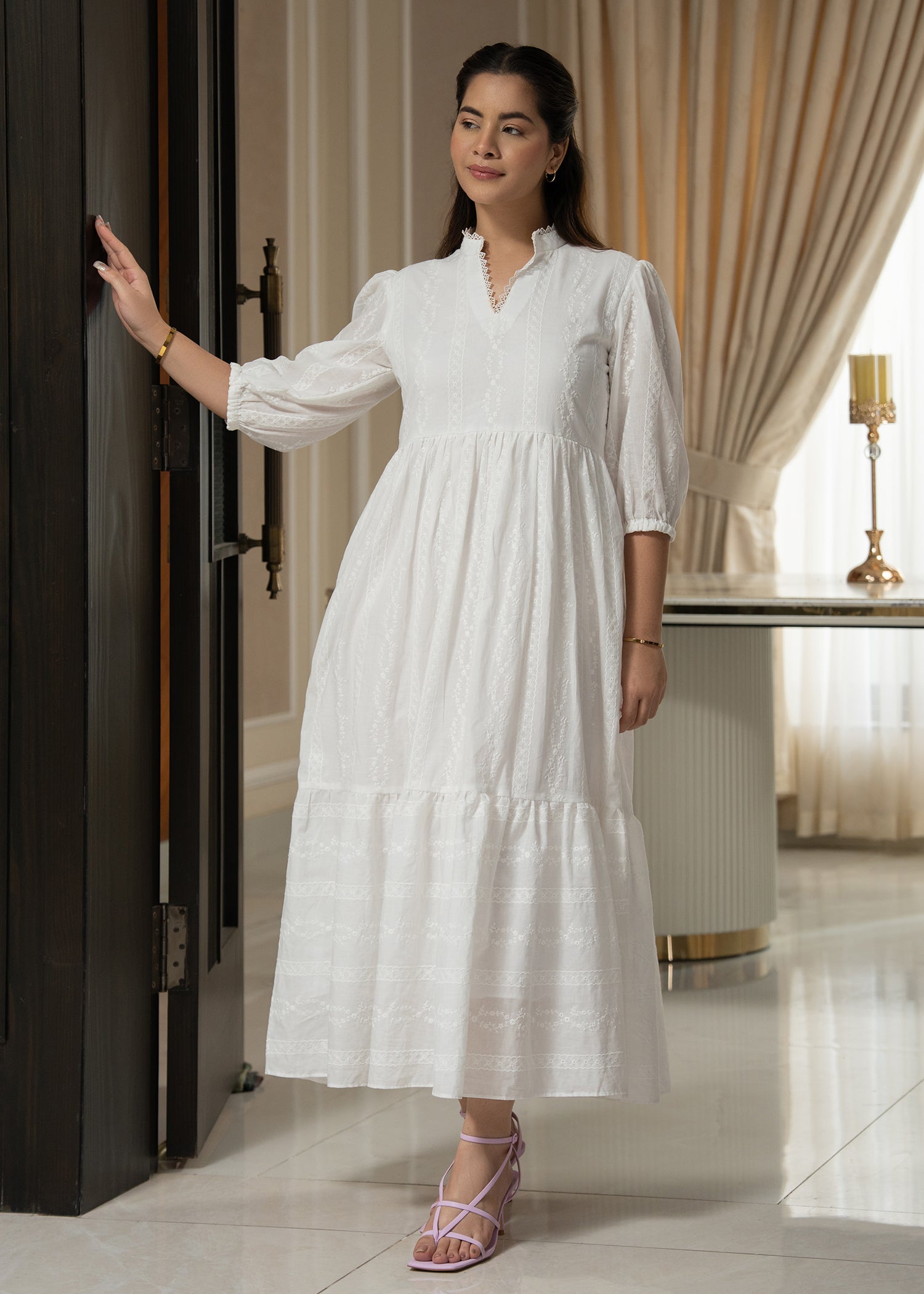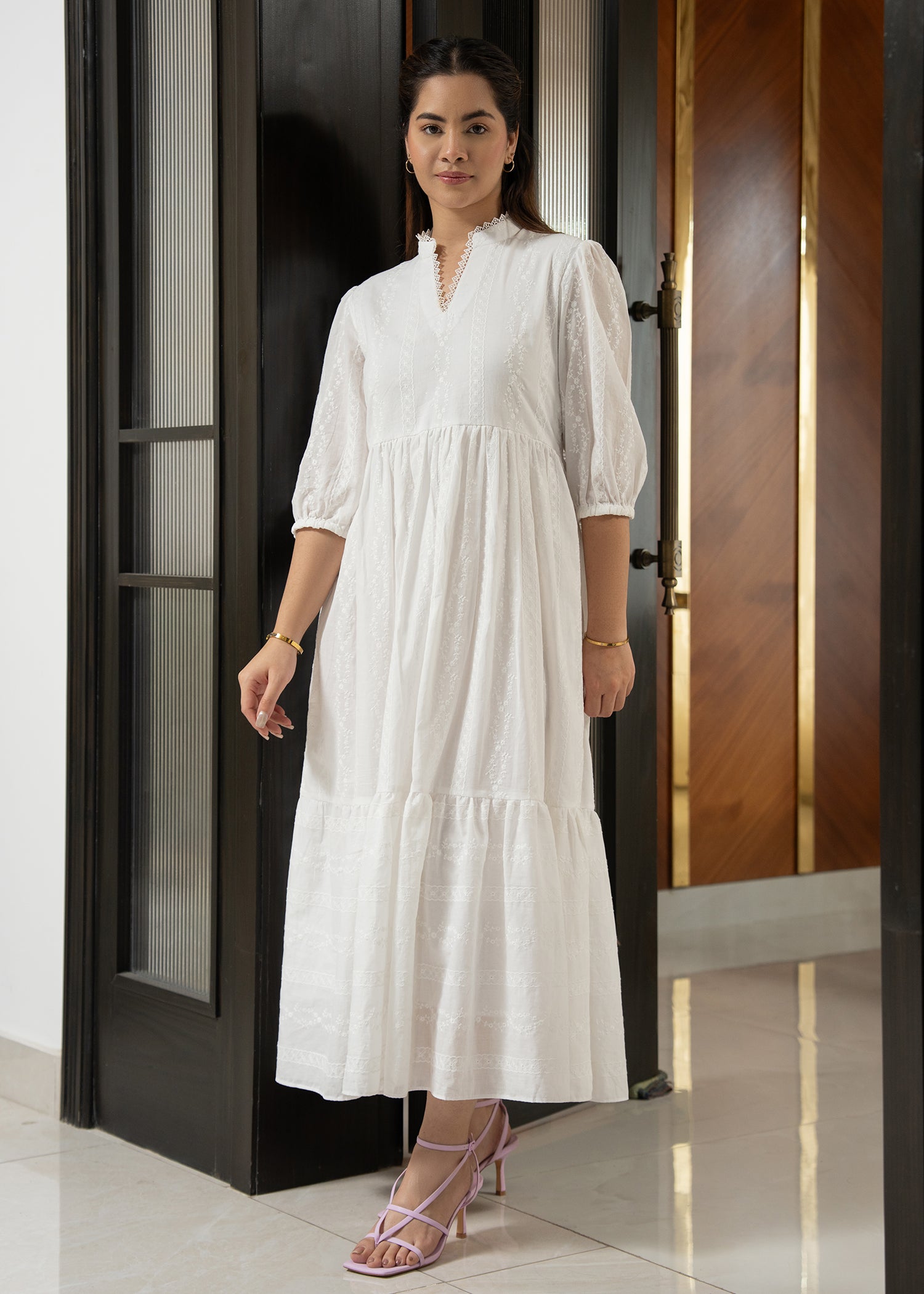 Soft, airy, and effortlessly elegant — the Camomile Dress is crafted in delicate eyelet fabric for a light, breathable feel. Designed with a graceful V-notch neckline, subtle front detailing, and a flowy tiered silhouette, it offers timeless charm and everyday comfort. The serene white tone makes it a versatile piece for daytime gatherings, brunches, and summer festivities.