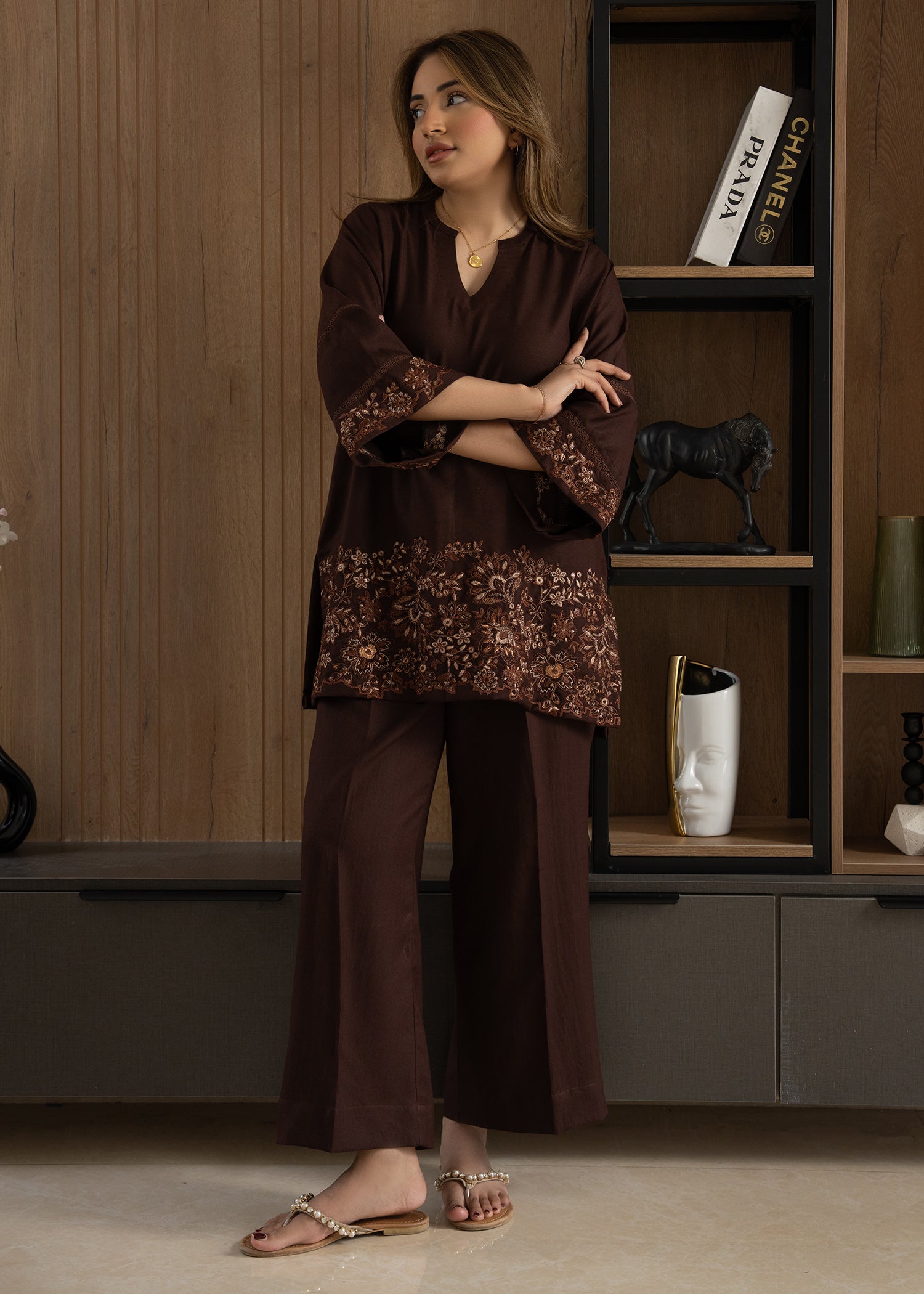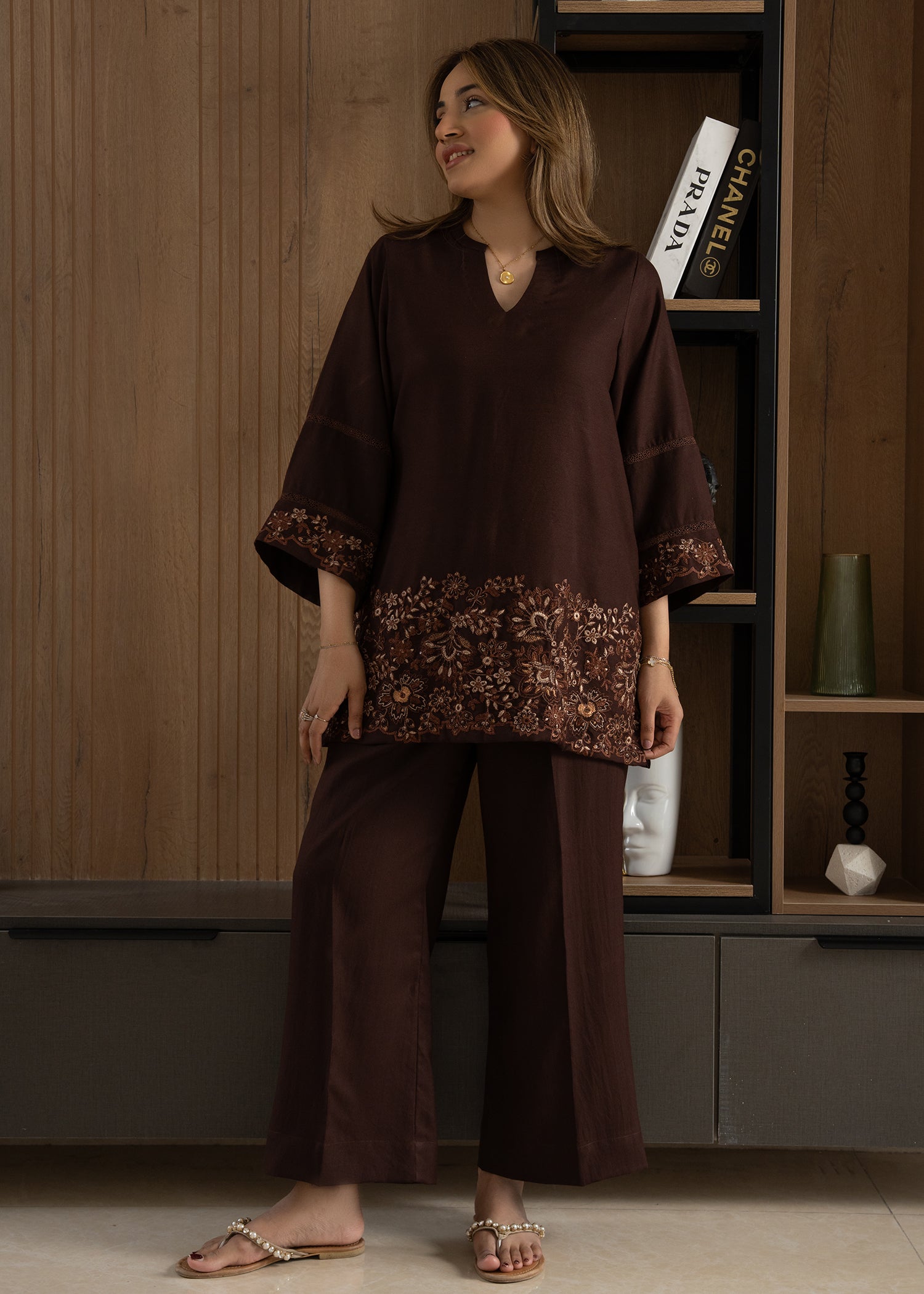 This rich chocolate-brown co-ord set is crafted in a soft, breathable fabric. The ensemble features a relaxed-fit shirt with a graceful V-neckline and statement flared sleeves. The highlight of the piece is the intricately embroidered hem, adorned with delicate floral detailing that adds depth and artisanal charm to the silhouette.