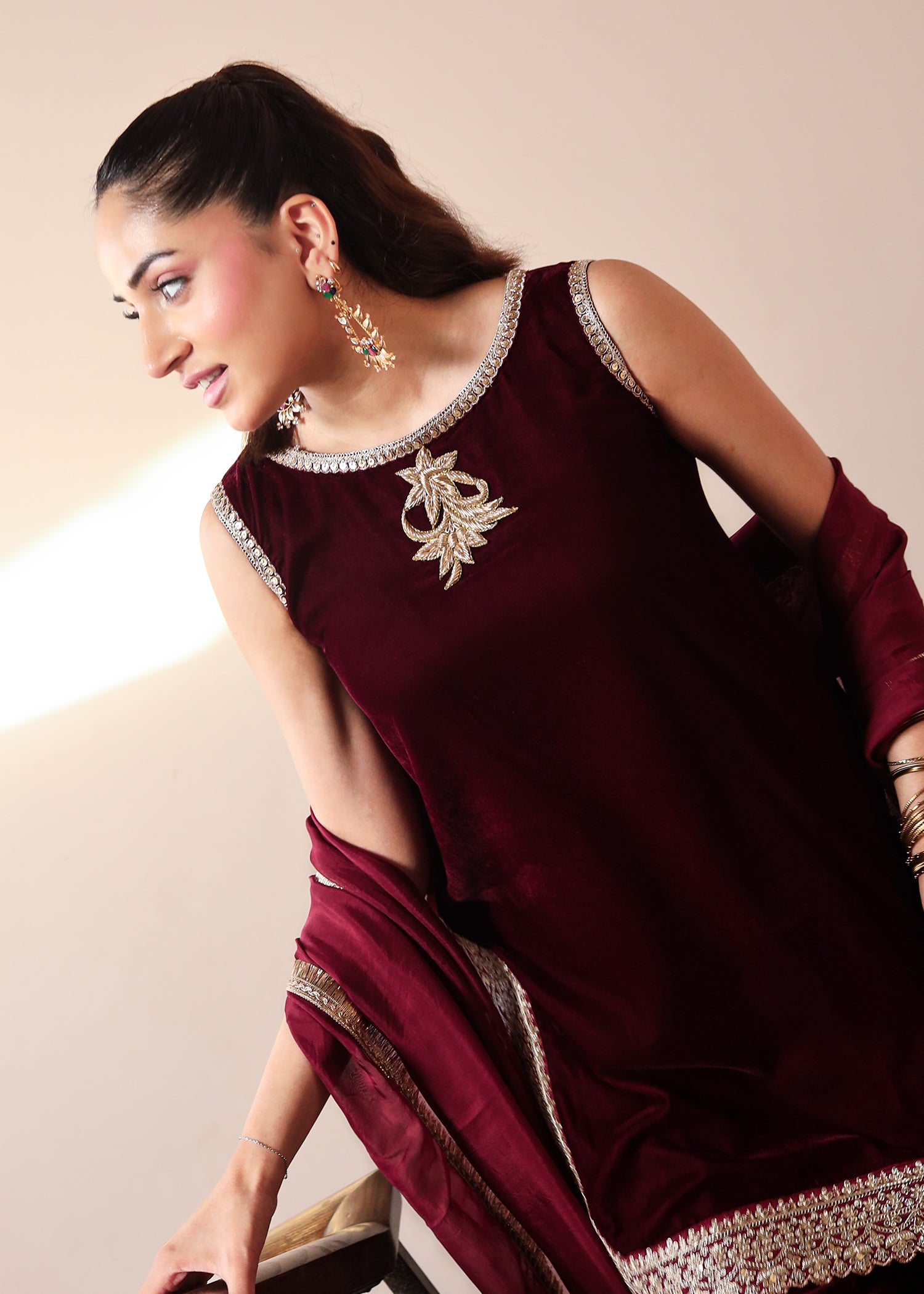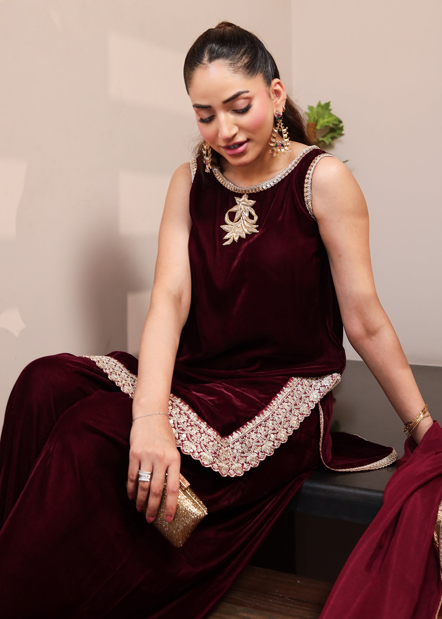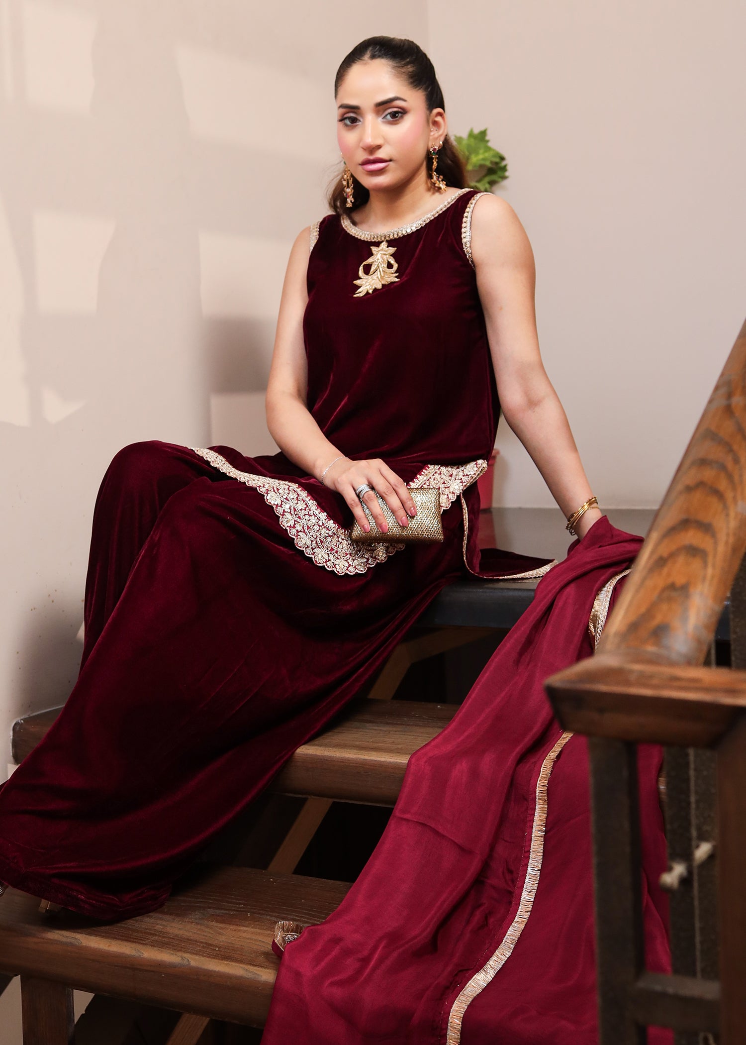 Unleash your inner queen with the Crimson Royale Ensemble from Candy Closet’s Luxe Collection. Designed in a rich maroon velvet, this sleeveless kameez is adorned with intricate gold and silver embellishments along the neckline and hem, radiating timeless opulence. Paired with dramatic flared trousers and a flowing dupatta, this look is perfect for weddings, festive nights, or any celebration where elegance is key. This ensemble blends tradition with a contemporary edge, making you unforgettable wherever you go.