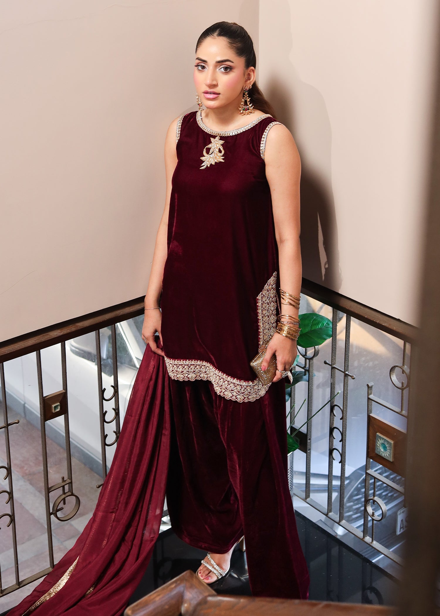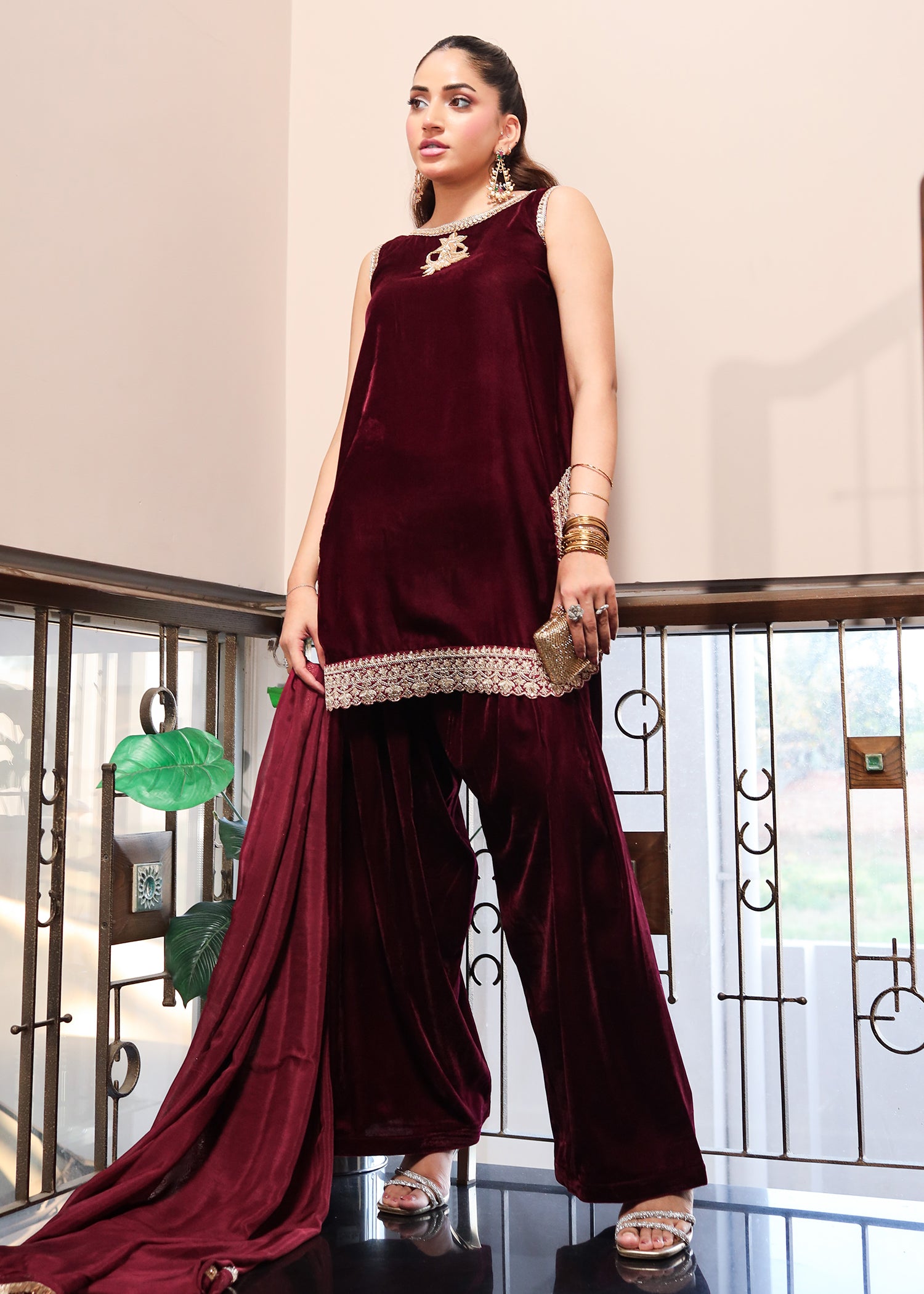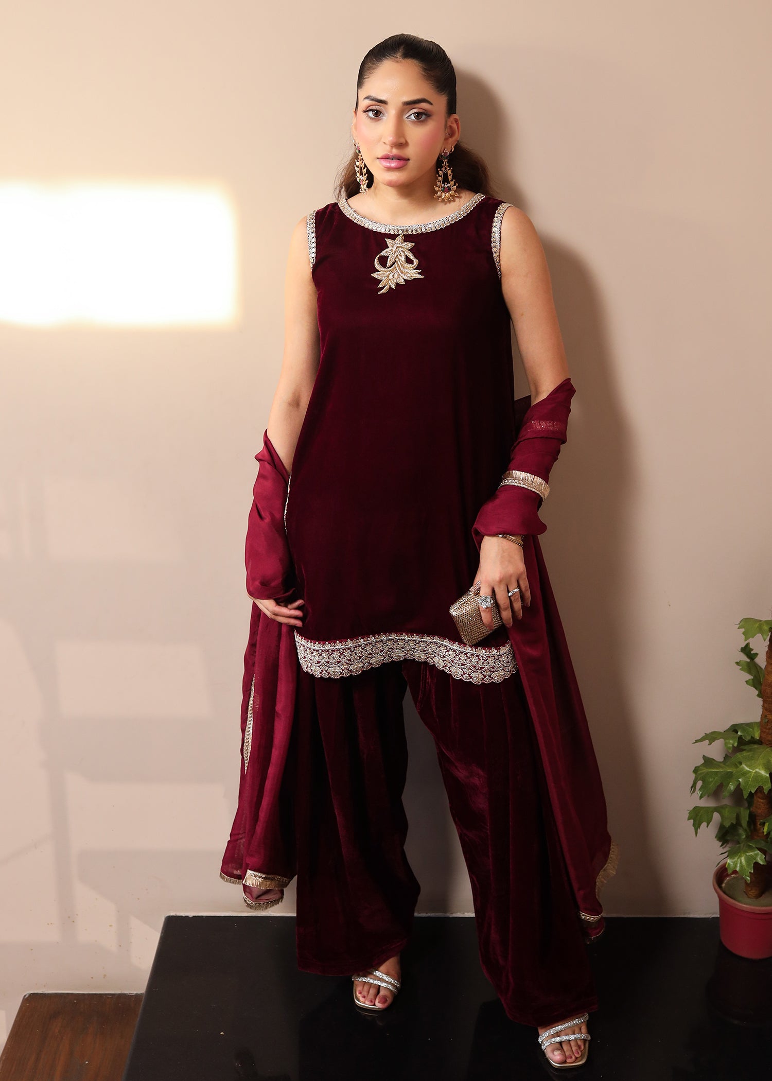 Fabric: Velvet shirt, velvet farshi shalwar, embellished tissue silk dupatta