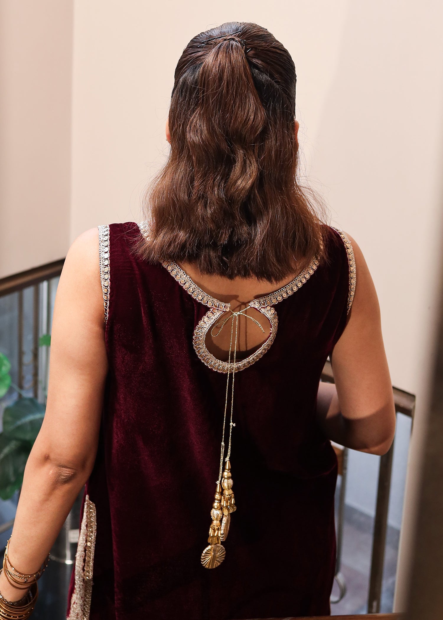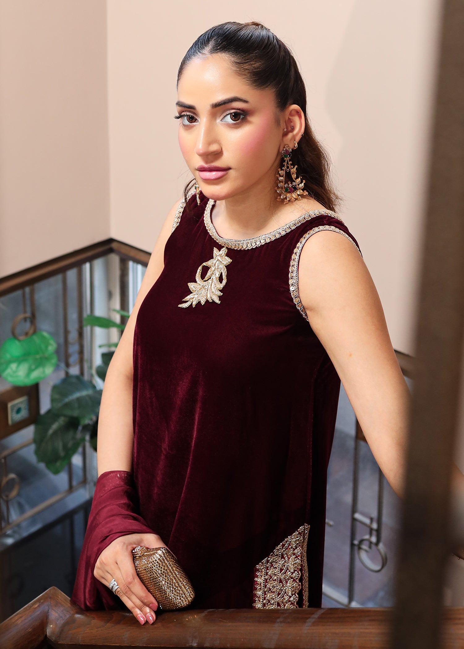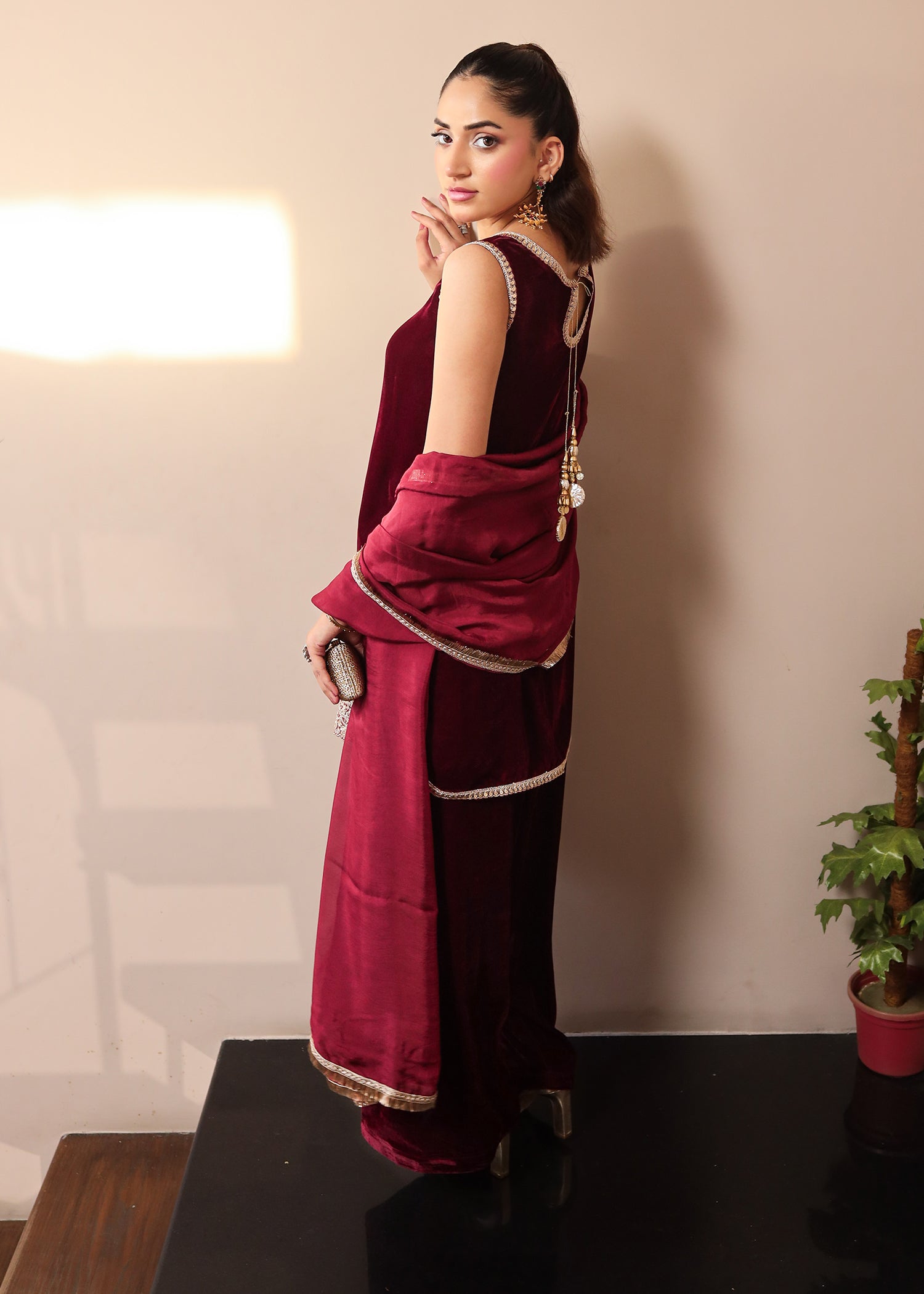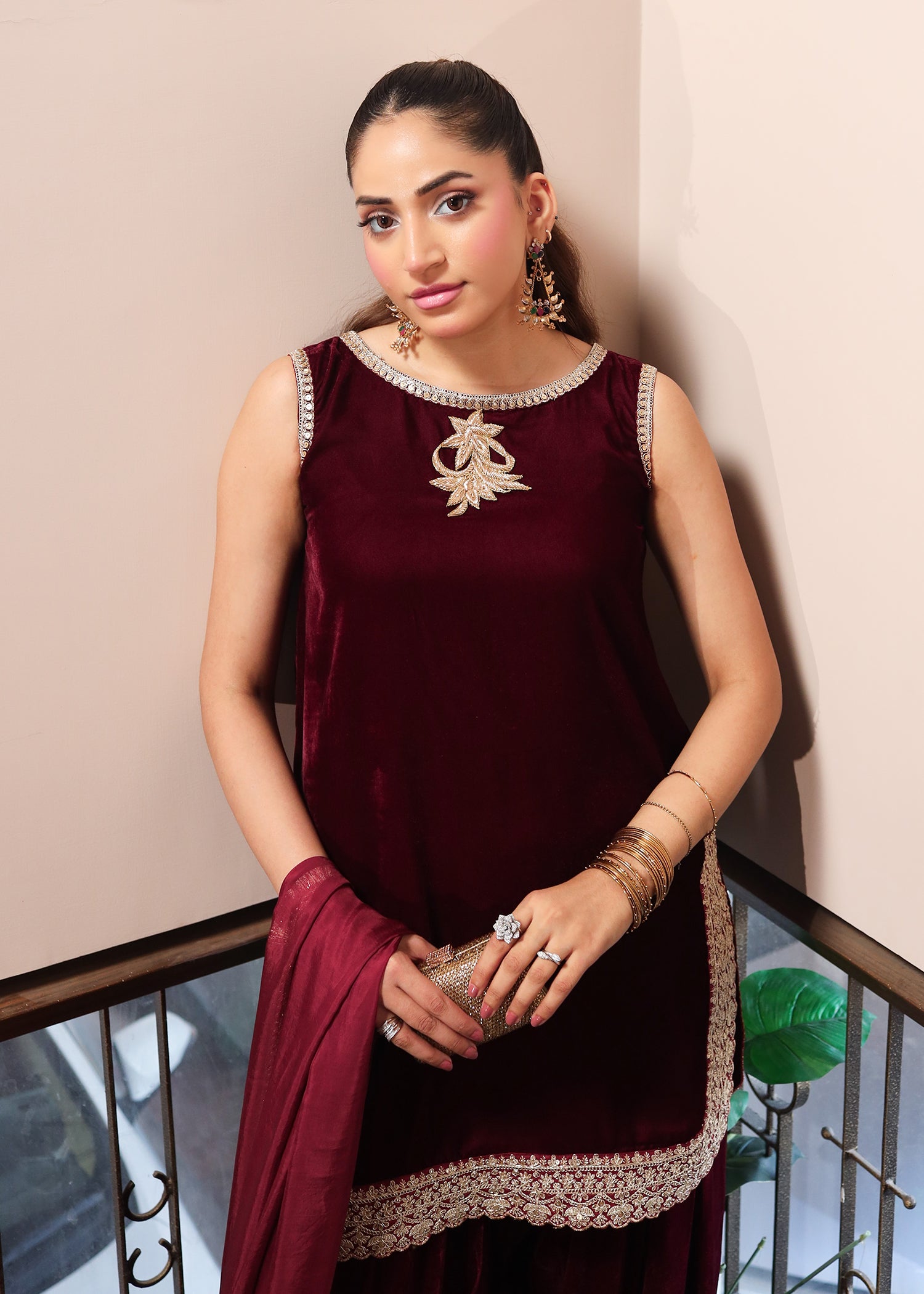 Fabric: Velvet shirt, velvet farshi shalwar, embellished tissue silk dupatta