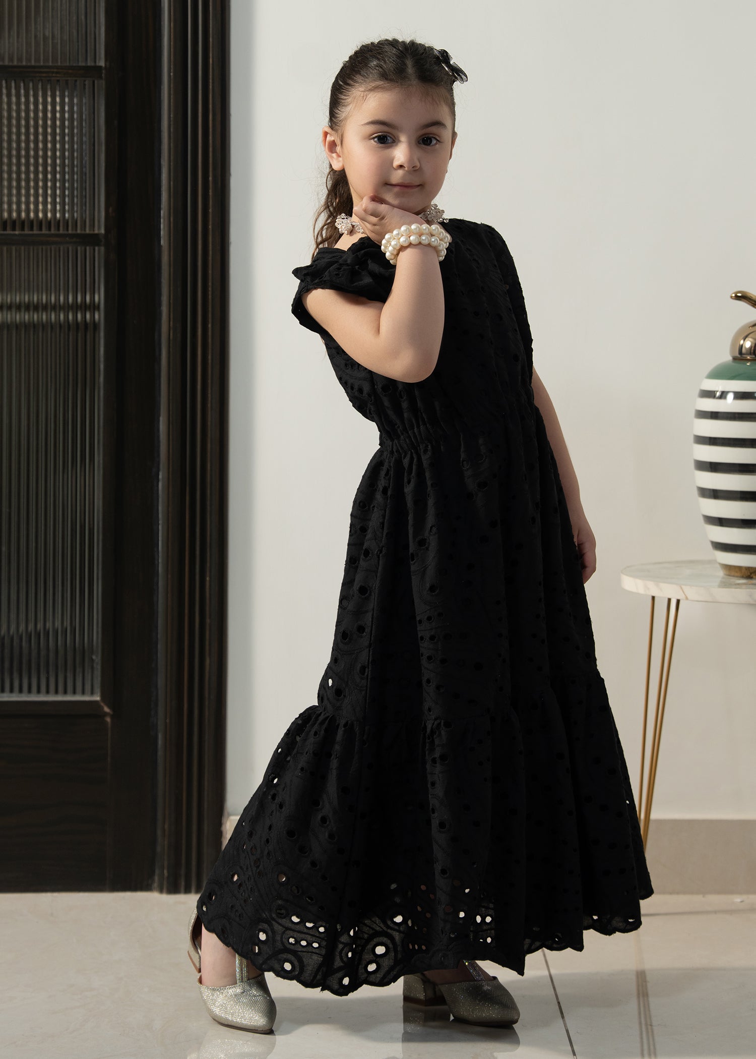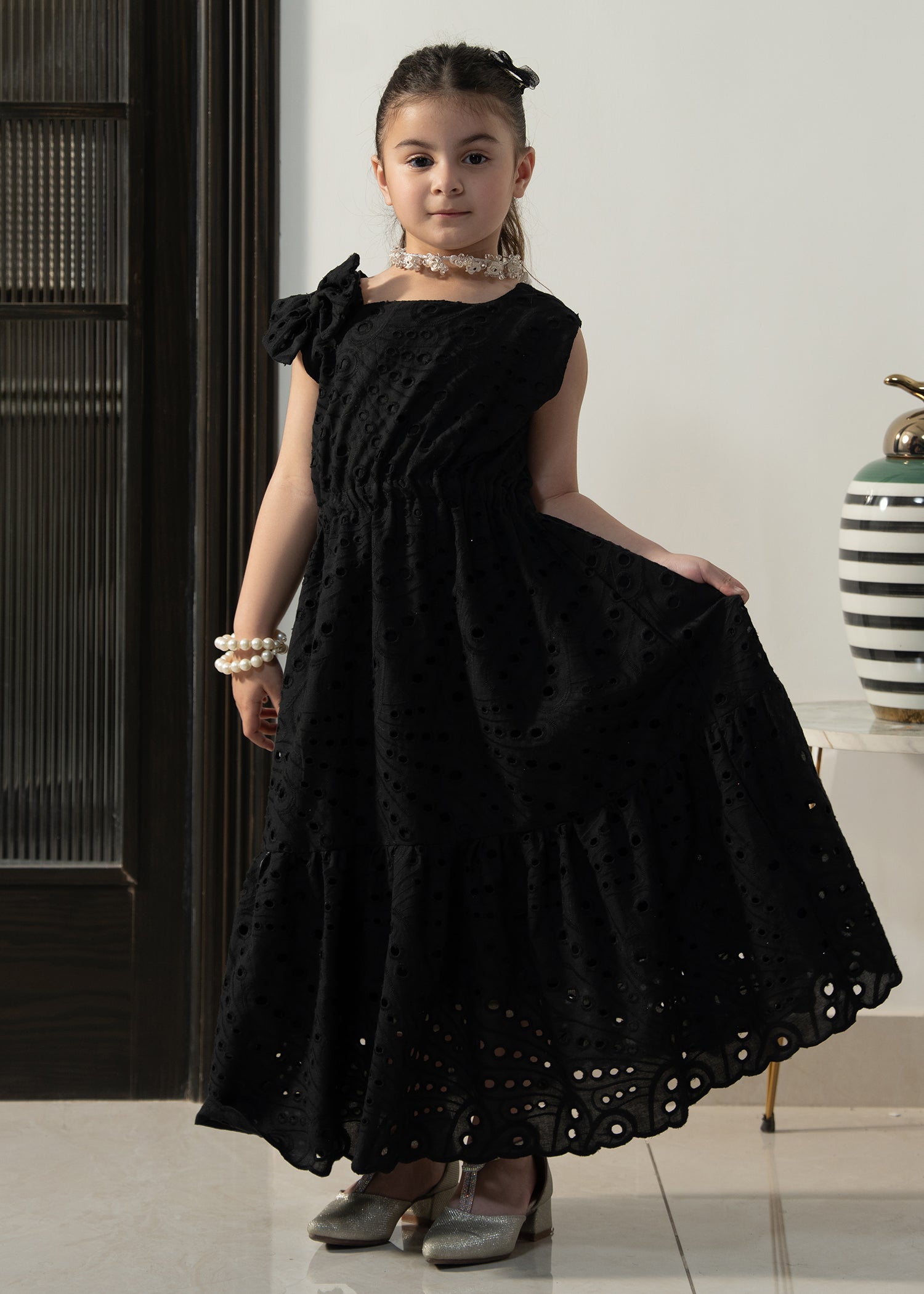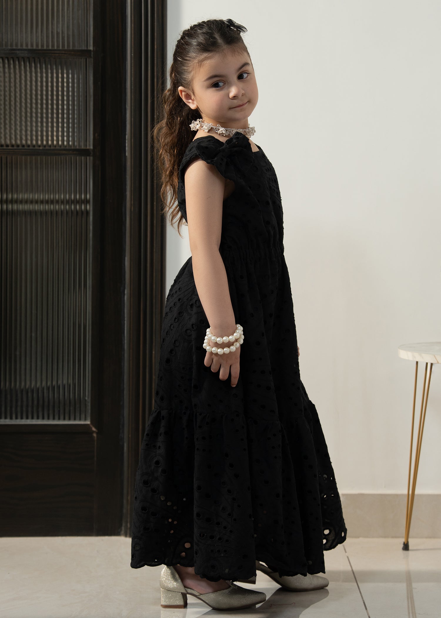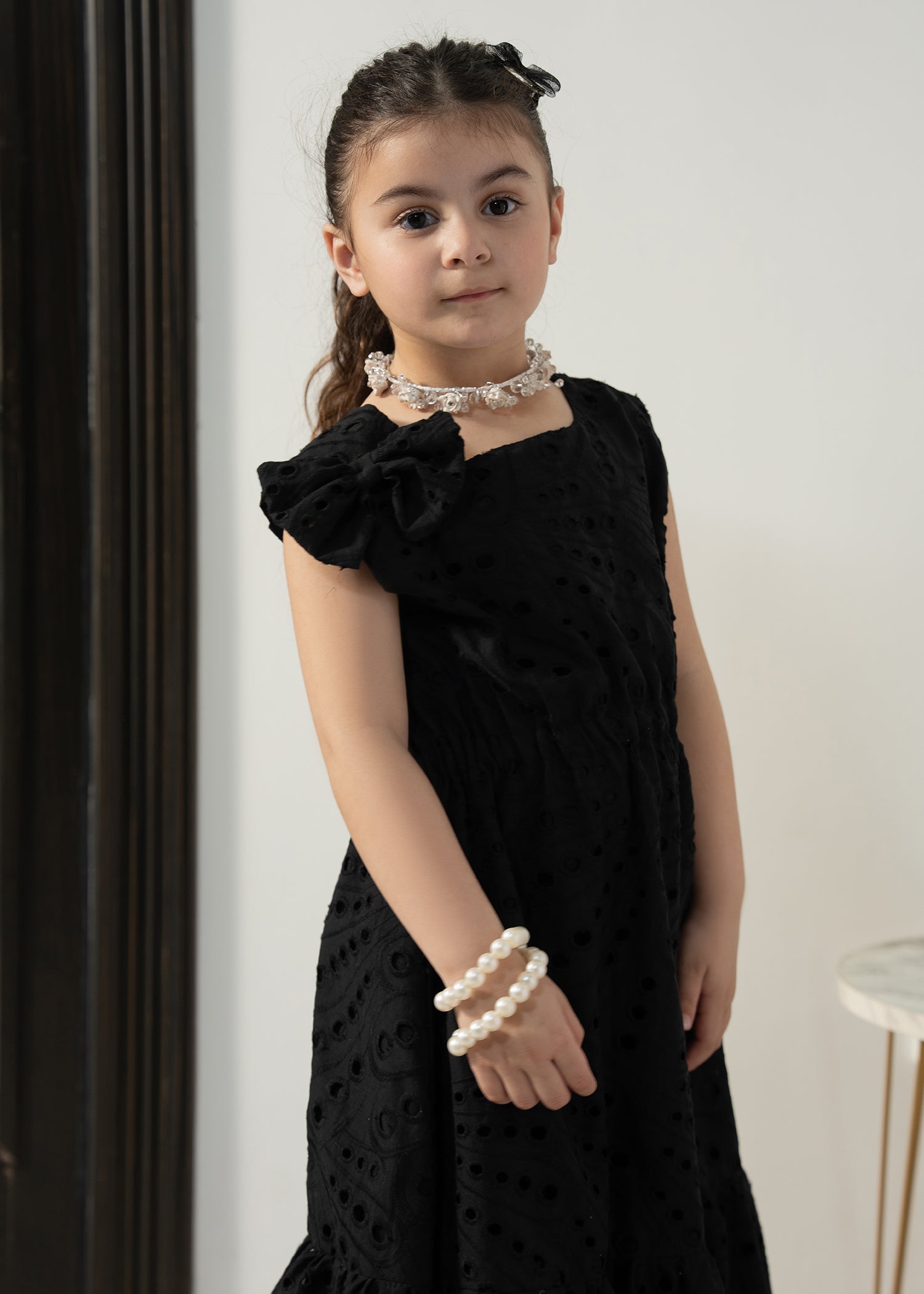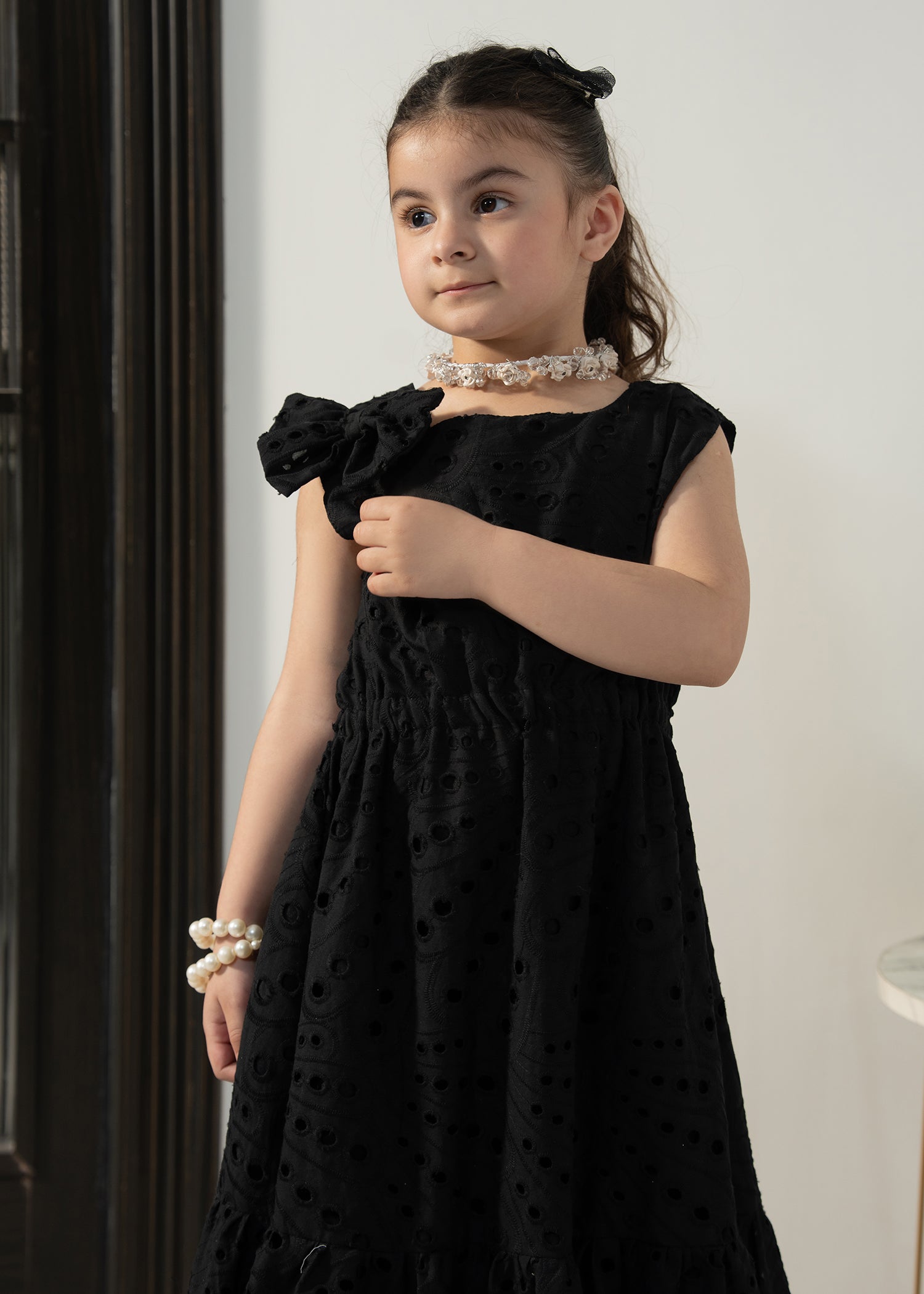Designed in soft eyelet fabric, the Little Midnight Bloom Dress offers a comfortable fit with a graceful flared silhouette. The classic black tone and delicate detailing make it perfect for special outings and twinning moments with mom.
