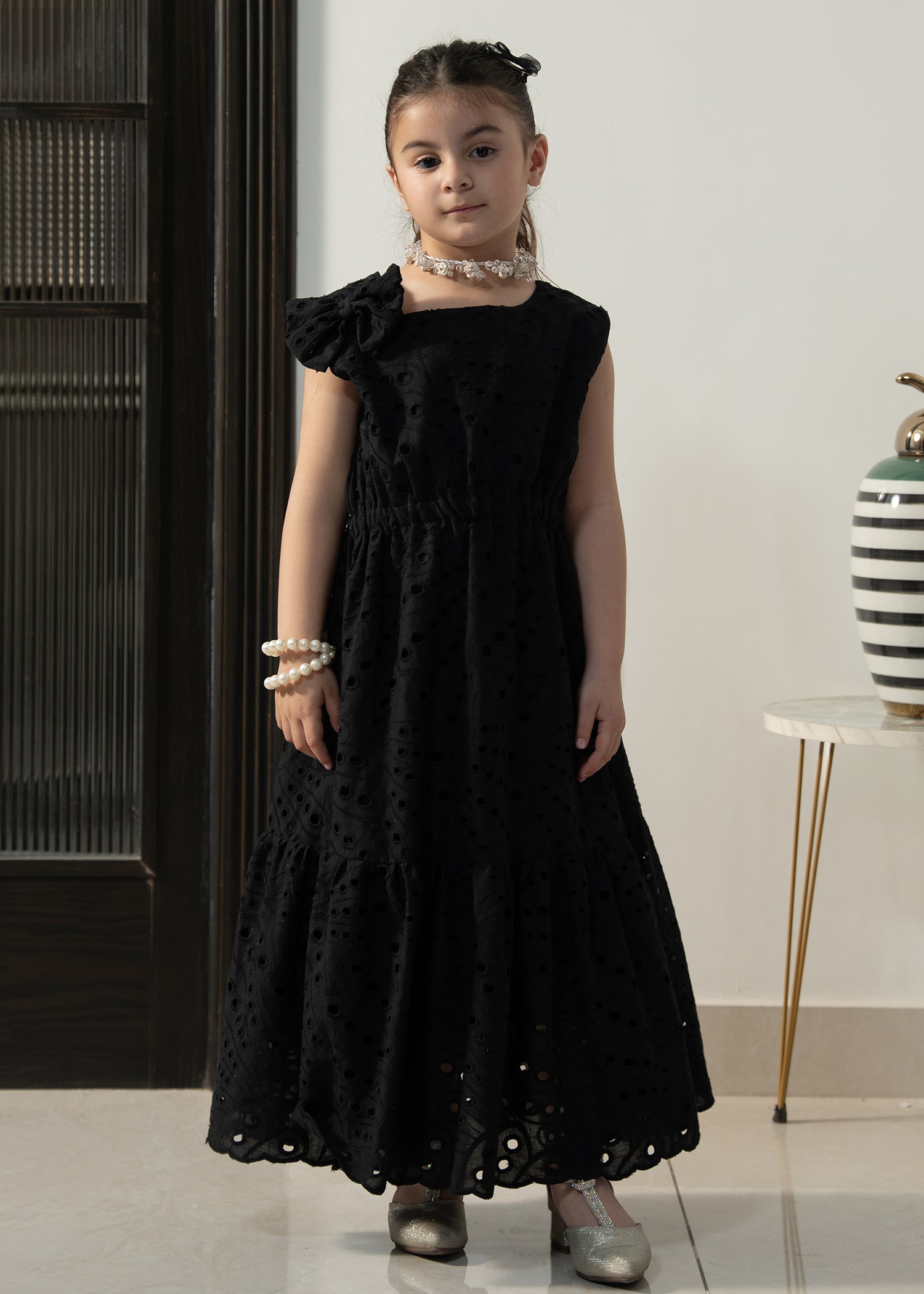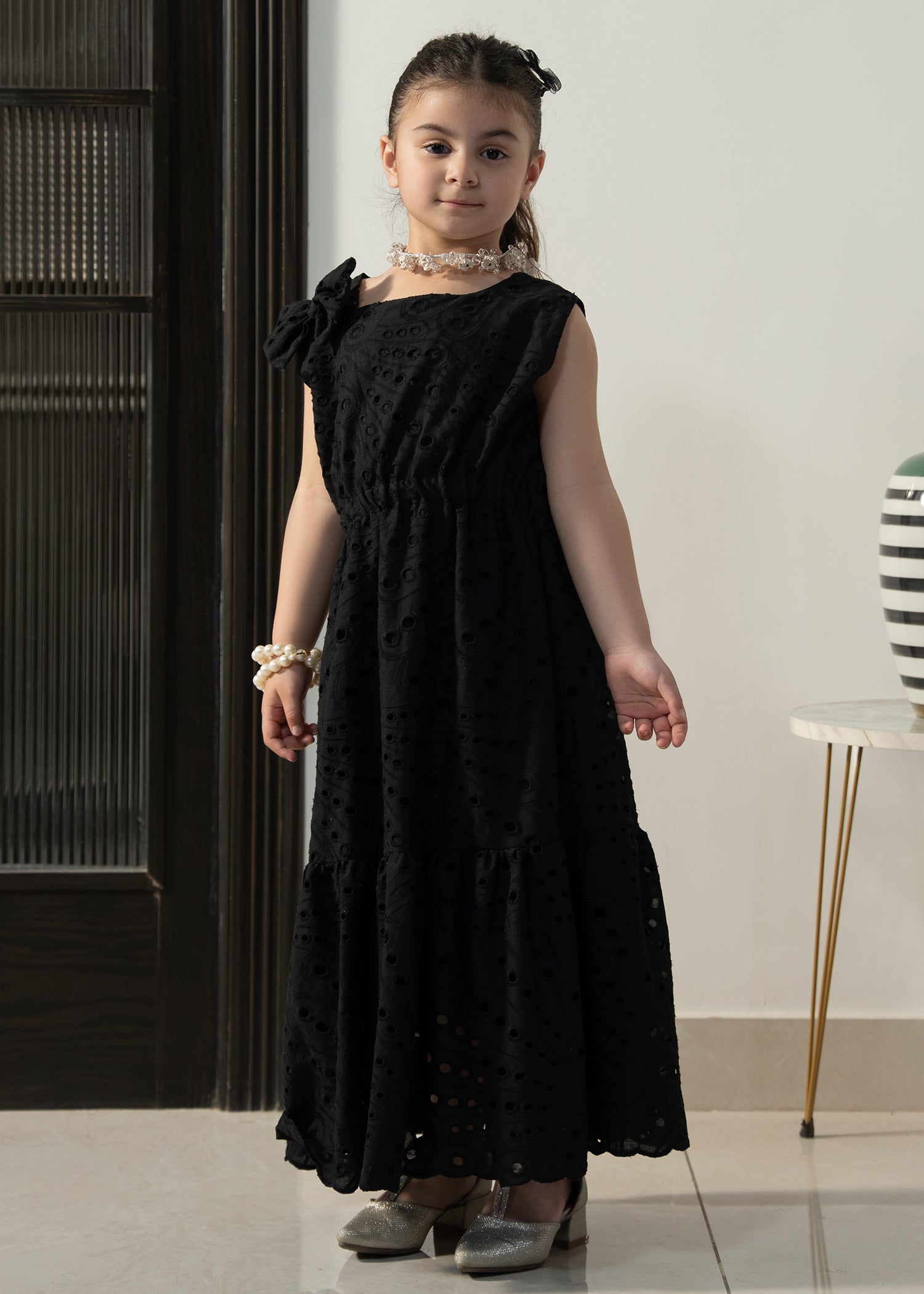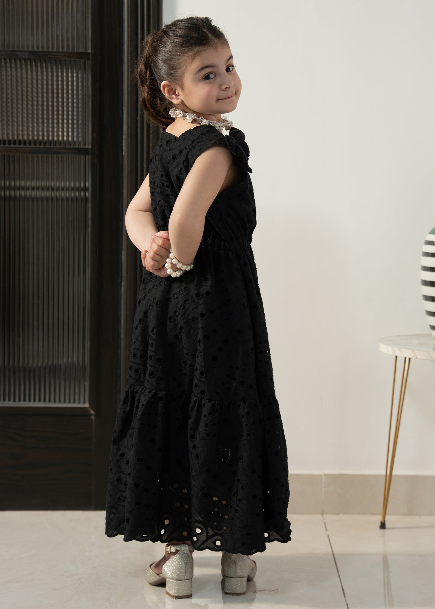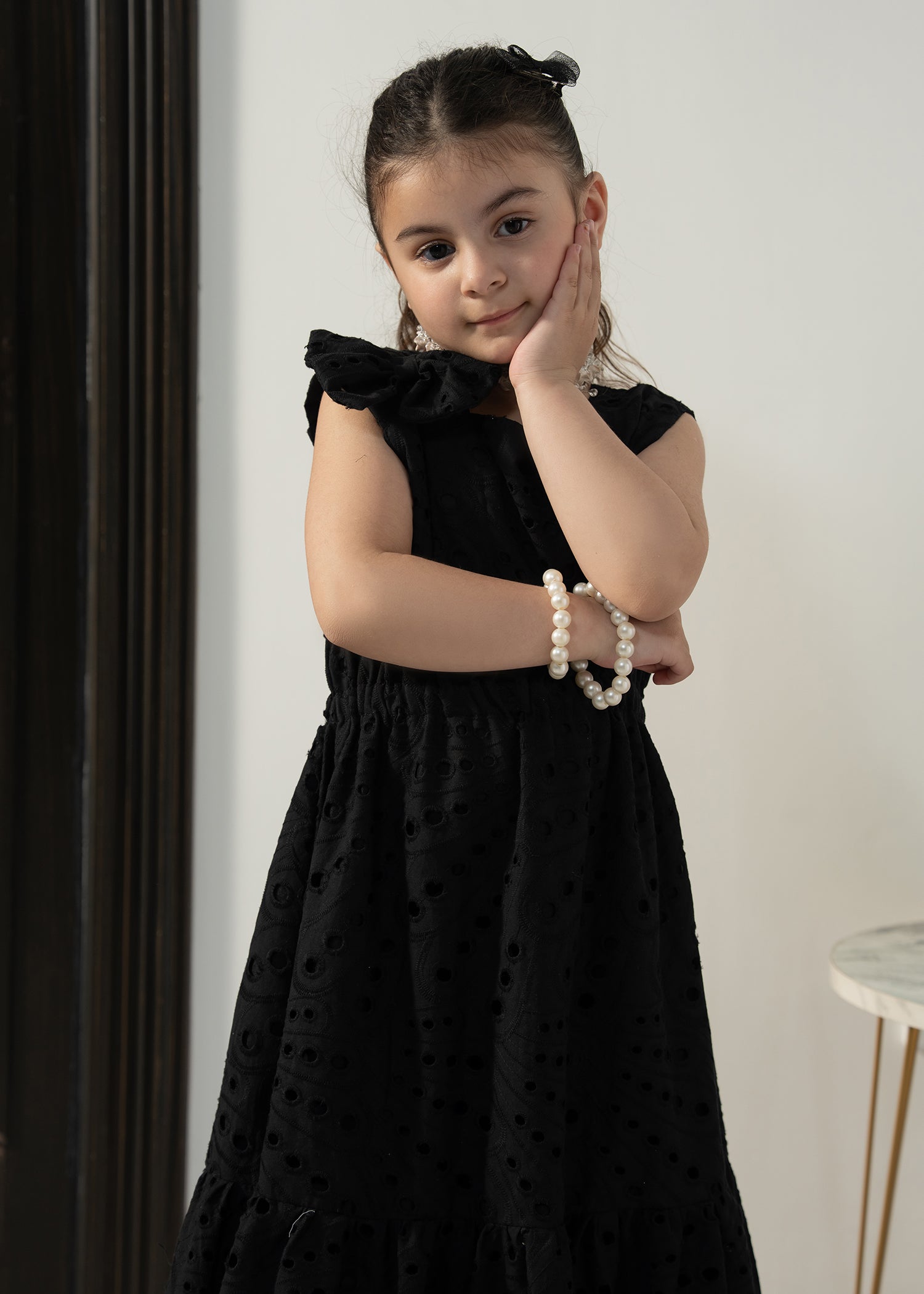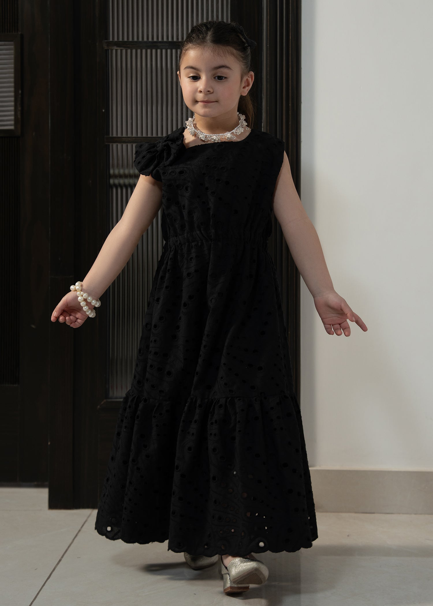 Designed in soft eyelet fabric, the Little Midnight Bloom Dress offers a comfortable fit with a graceful flared silhouette. The classic black tone and delicate detailing make it perfect for special outings and twinning moments with mom.
