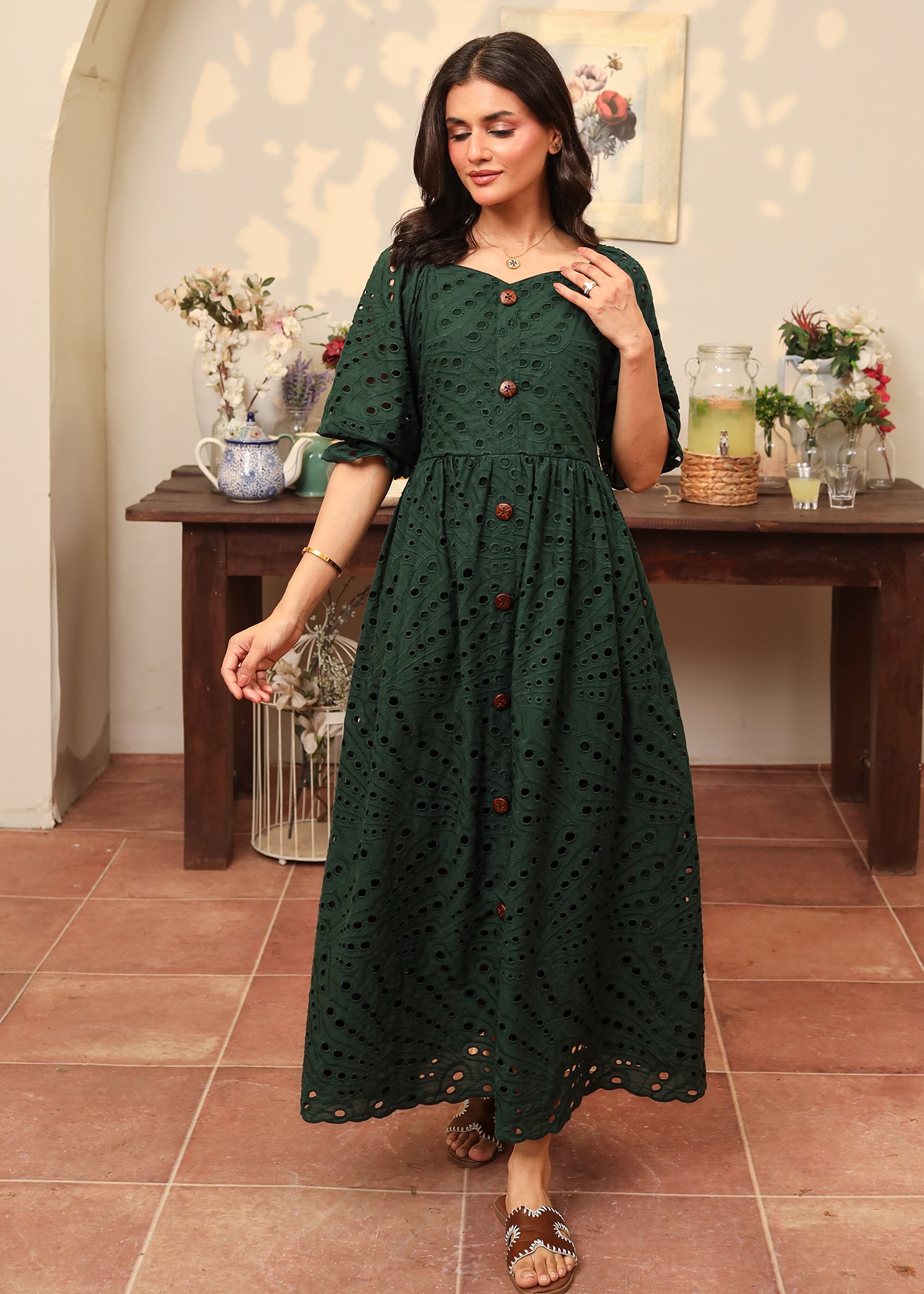 Crafted from flowing emerald green eyelet fabric, this dress features a captivating sweetheart neckline with button details along the length of the dress. Enchanting puffy elastic sleeves add a touch of romance, while the skirt is beautifully finished with intricate scallop edges, adding a dreamy, graceful charm to every step.