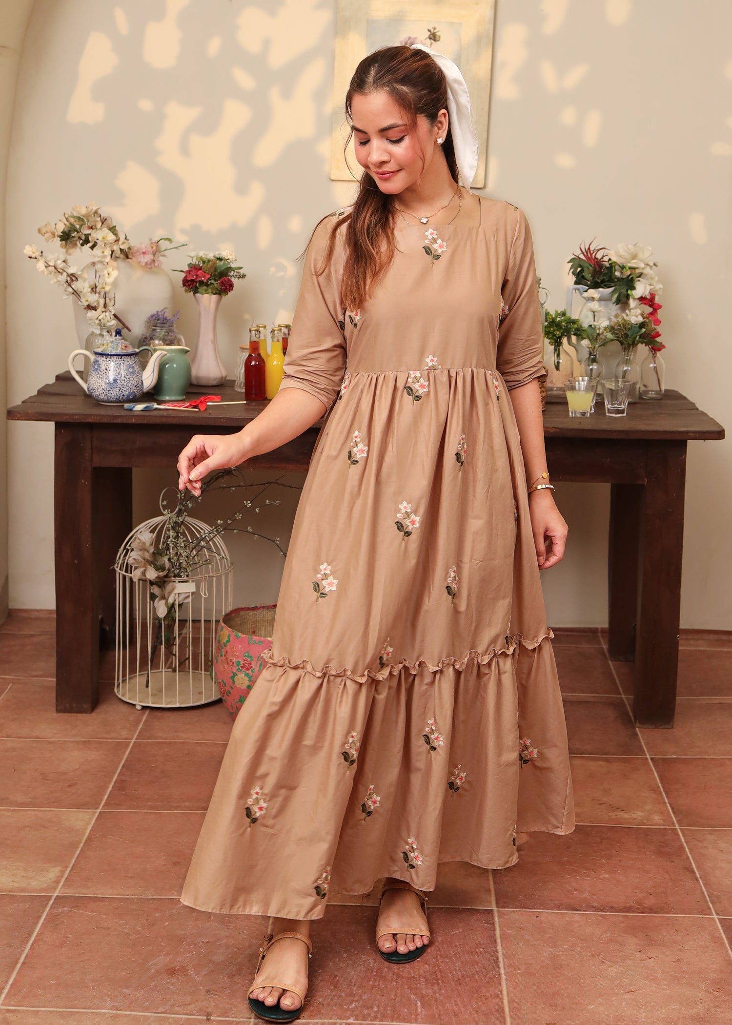 The square cut of the neckline complimented with fitted elbow length sleeves and a long bottom frill make the dress elegant and chic at the same time.This embroidered cotton dress is everything that you need this spring!