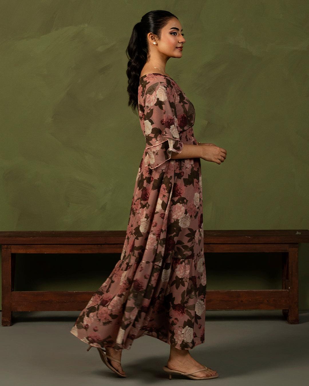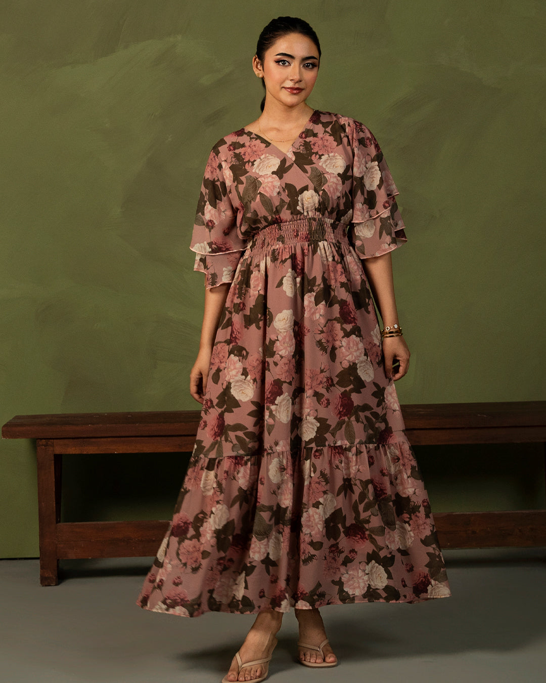 A gorgeous printed dress embellished with our most loved double frilled sleeves, a wrap neckline, and a smocked waistline. The cut and print is further complemented with a long bottom frill.
