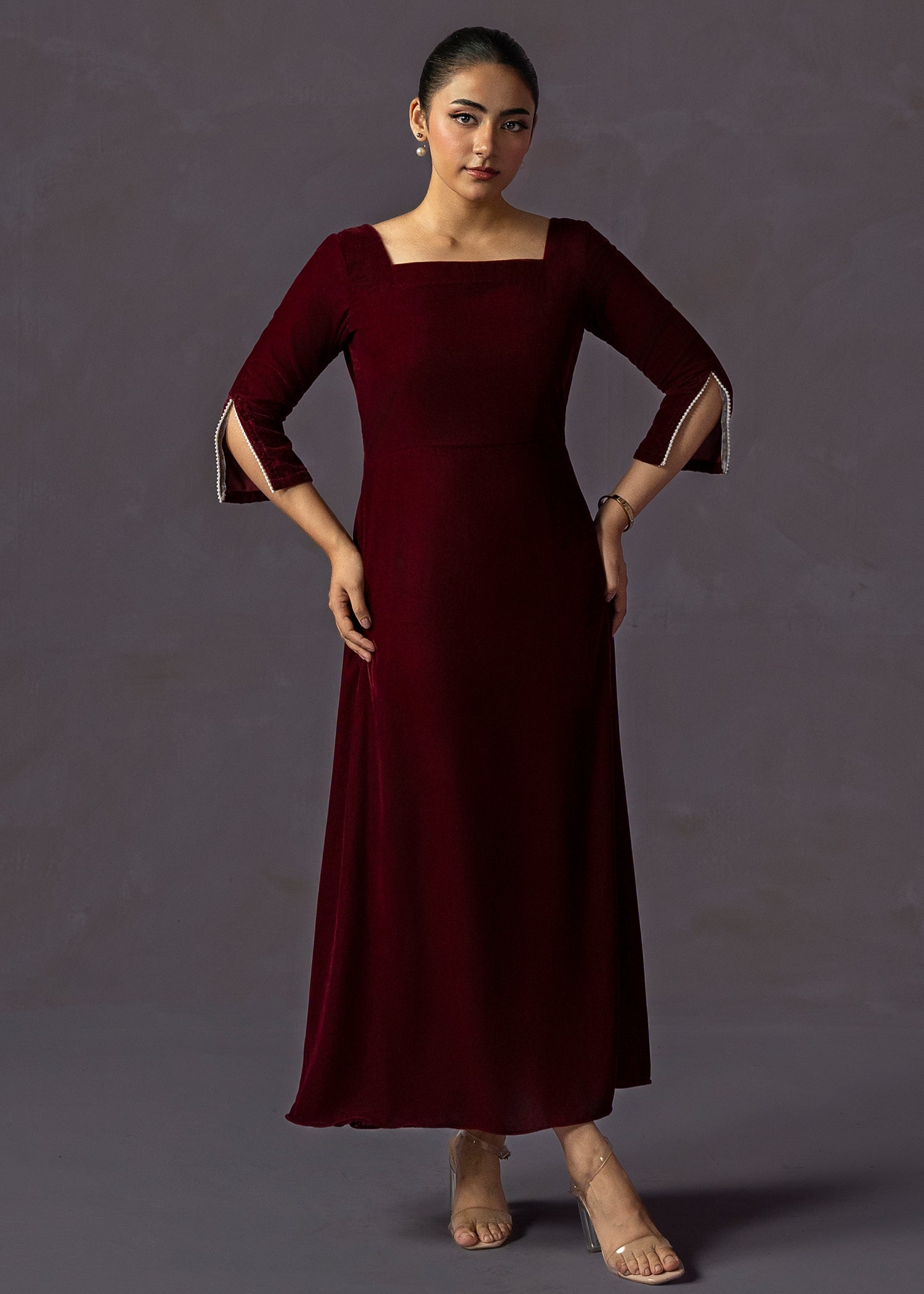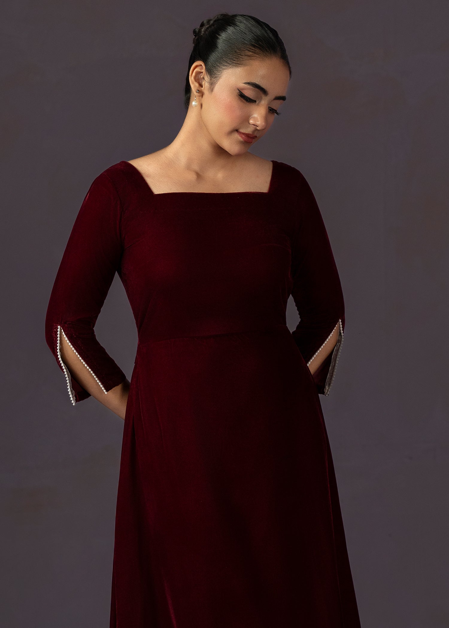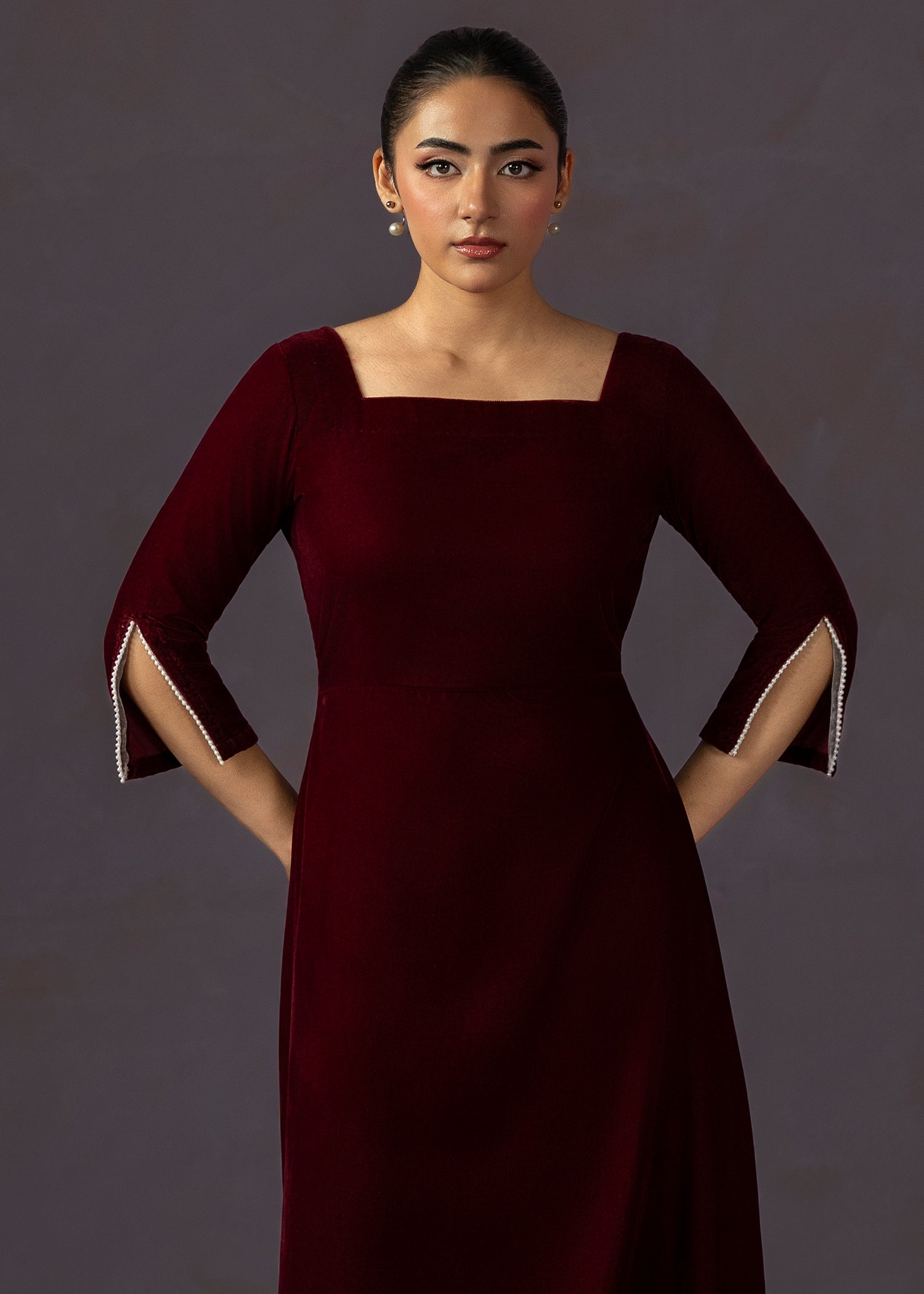 Elegance meets simplicity in this deep maroon velvet dress, designed to flatter with its clean lines and rich texture. The square neckline adds a modern edge, while the three-quarter sleeves feature delicate pearl-trimmed slits for a hint of sophistication. Crafted from plush velvet, this dress flows beautifully to create a refined and graceful silhouette — perfect for evening soirées, formal gatherings, or festive dinners.