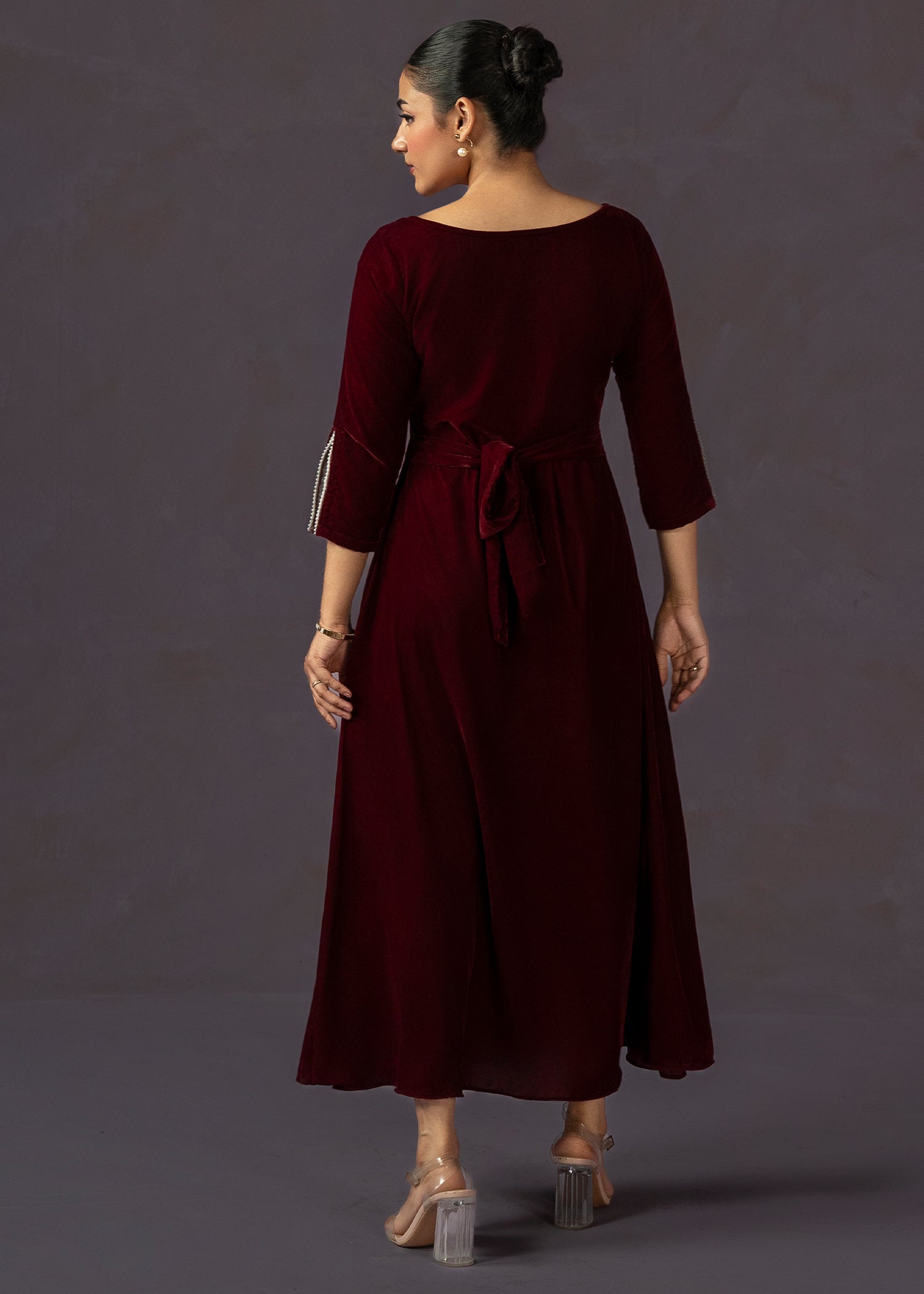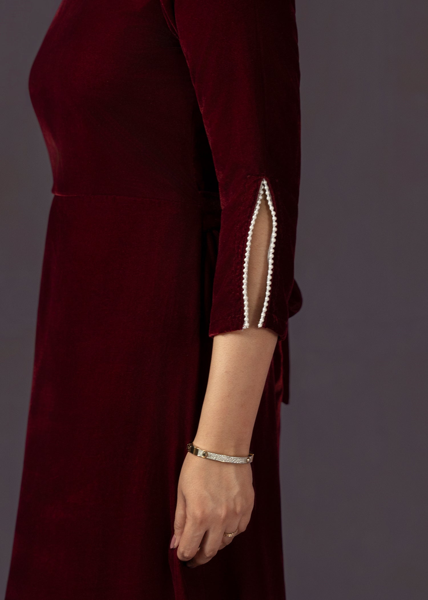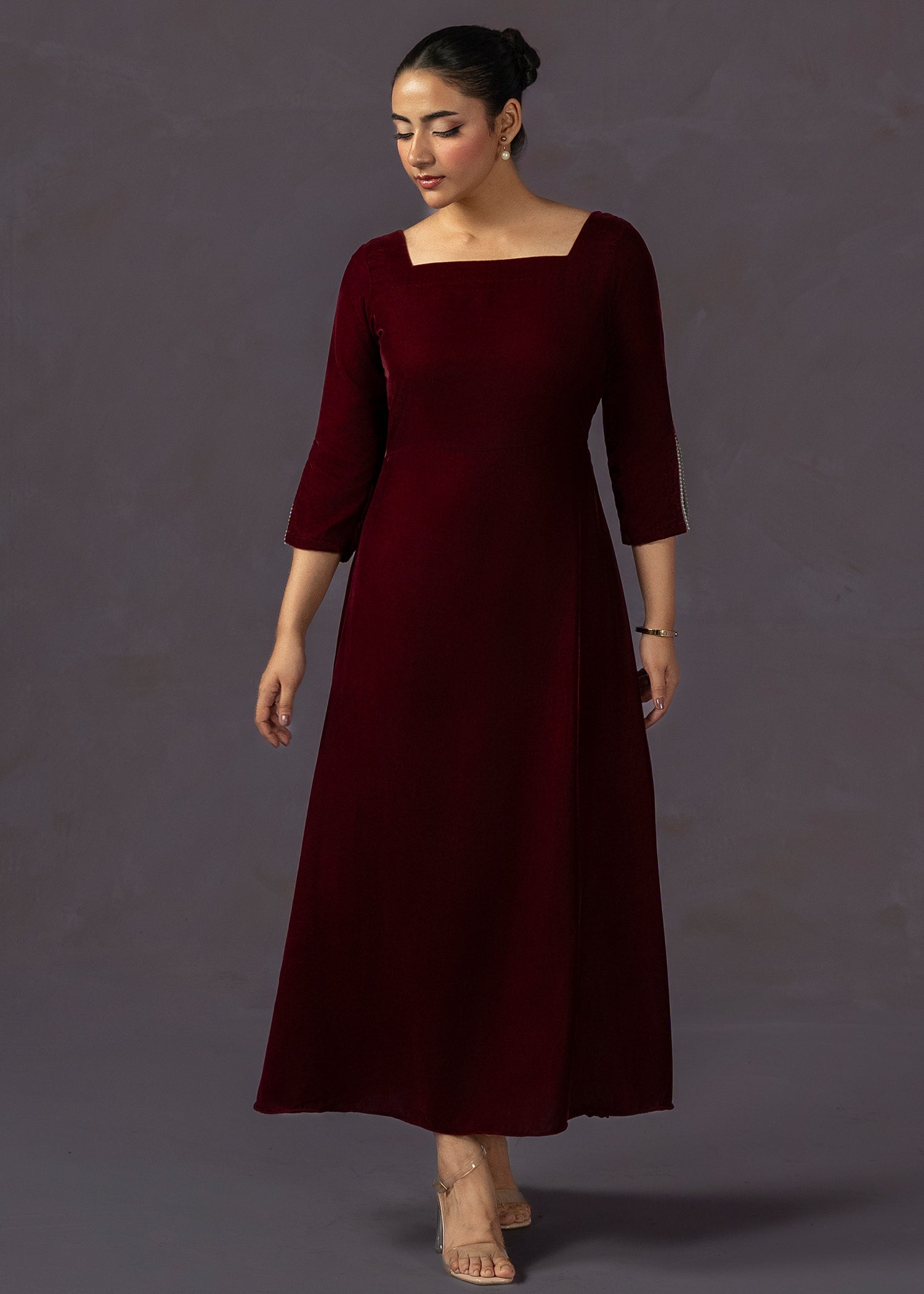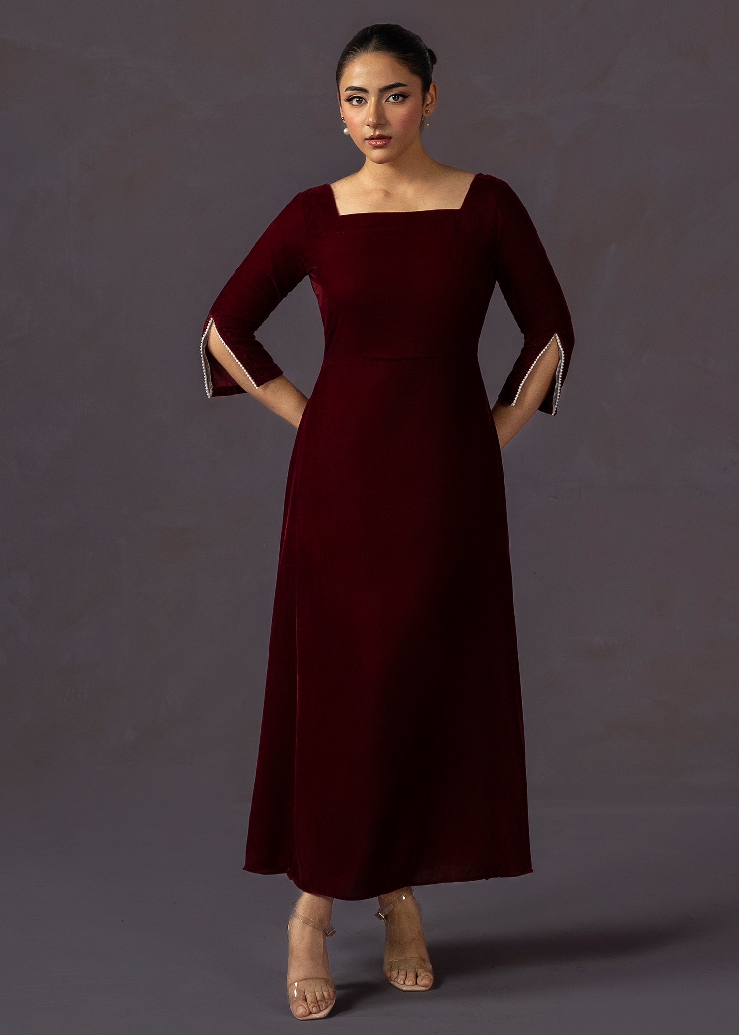 Elegance meets simplicity in this deep maroon velvet dress, designed to flatter with its clean lines and rich texture. The square neckline adds a modern edge, while the three-quarter sleeves feature delicate pearl-trimmed slits for a hint of sophistication. Crafted from plush velvet, this dress flows beautifully to create a refined and graceful silhouette — perfect for evening soirées, formal gatherings, or festive dinners.