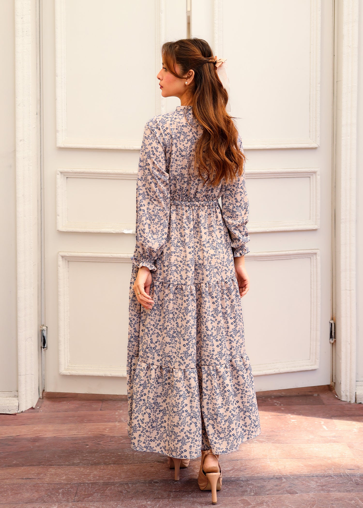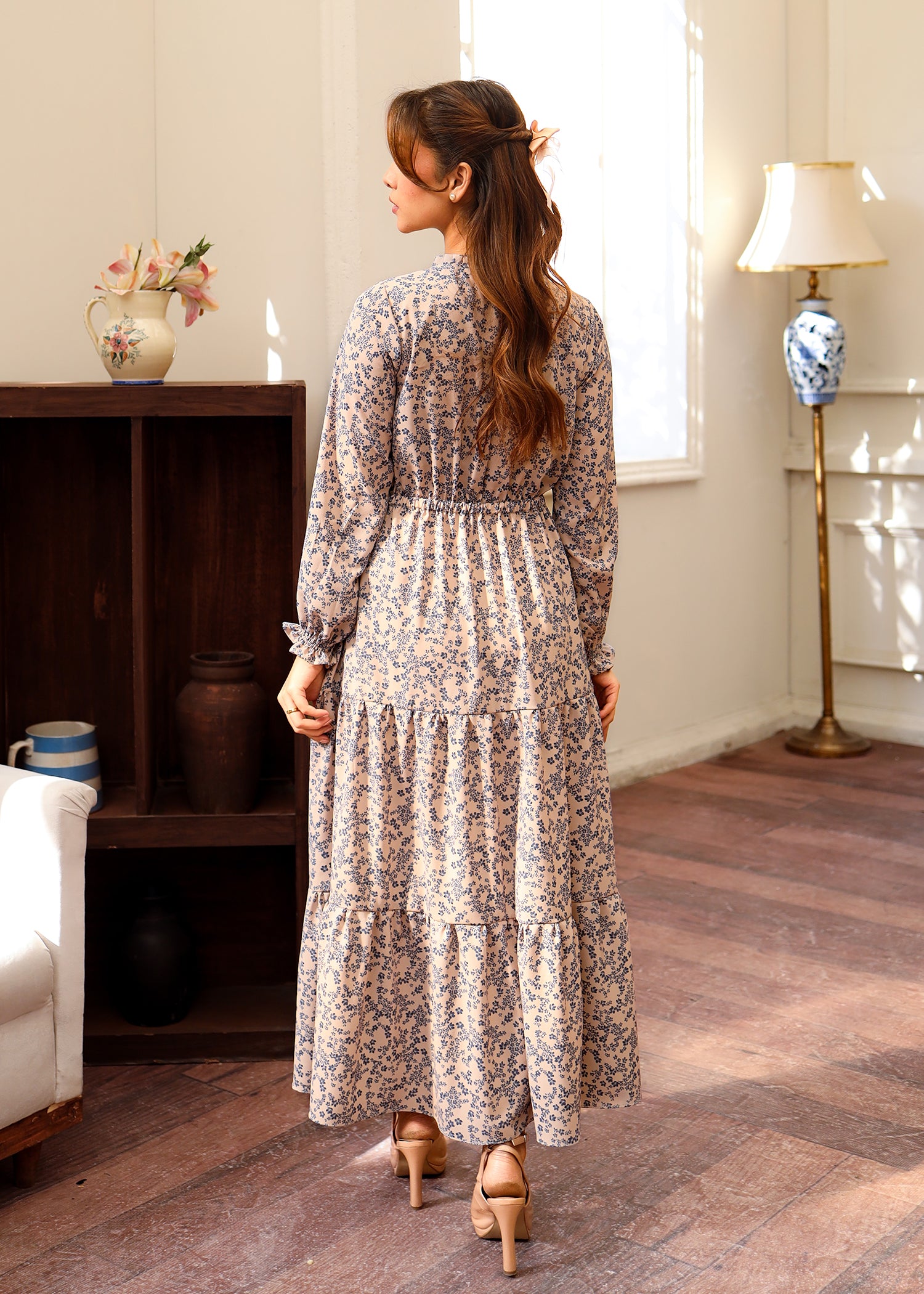 Our Floral Tiered Dress is a stunning blend of femininity and flow. Featuring a floral print, this dress boasts a three-tiered skirt that adds volume and movement. The elastic waistline ensures a flattering fit, while the frill neckline and full loose elastic sleeves bring an effortless, romantic charm. Perfect for any occasion, this dress combines comfort and style in one beautiful piece.