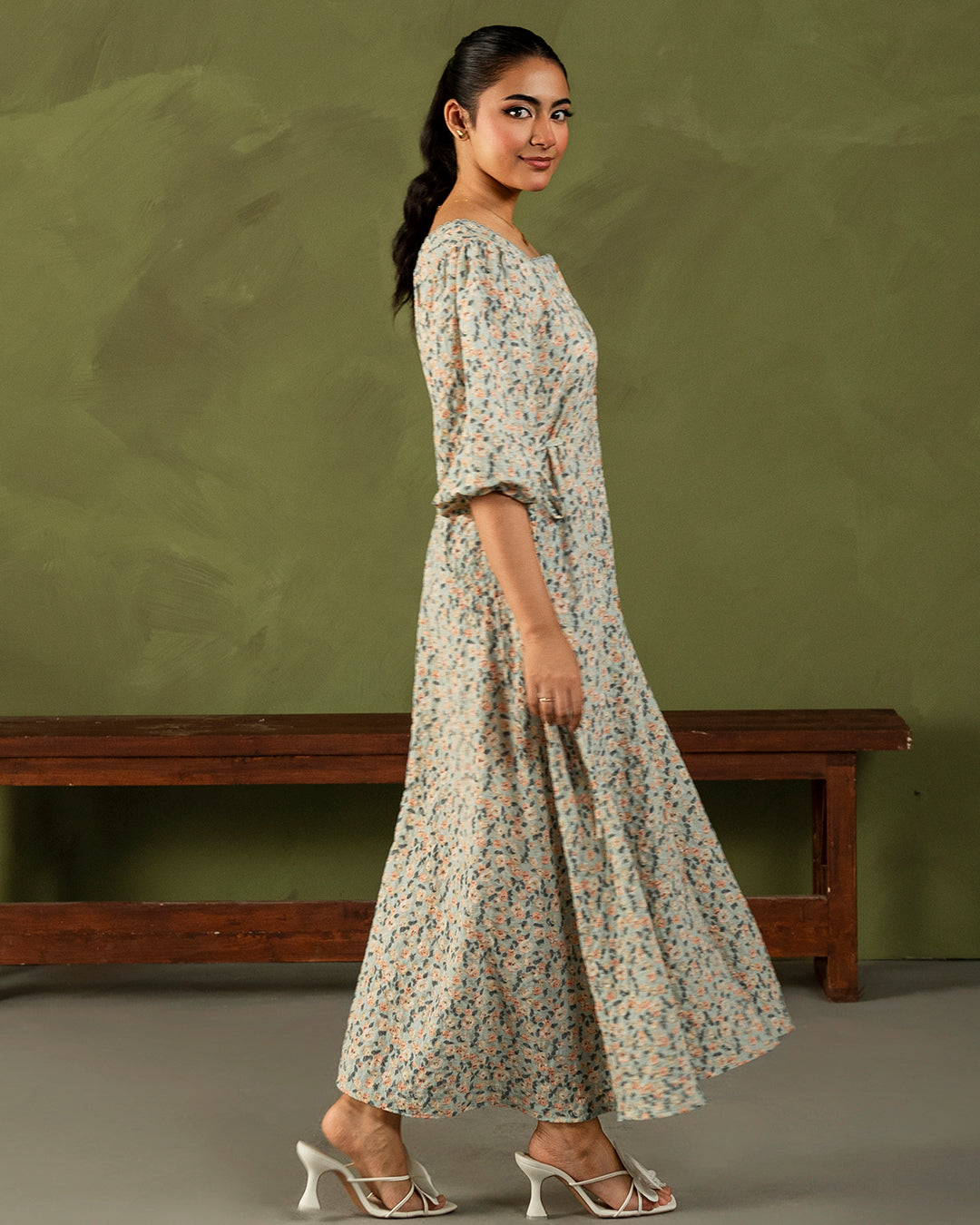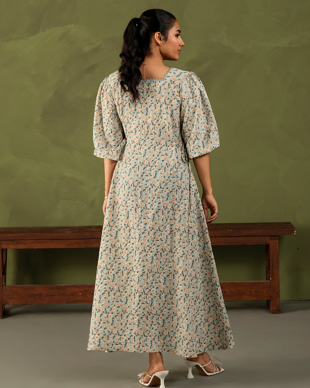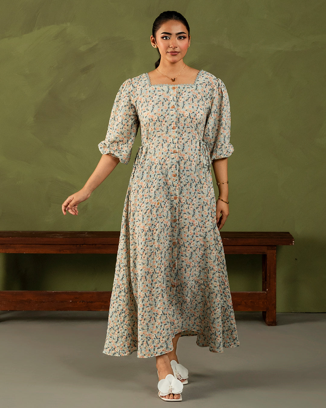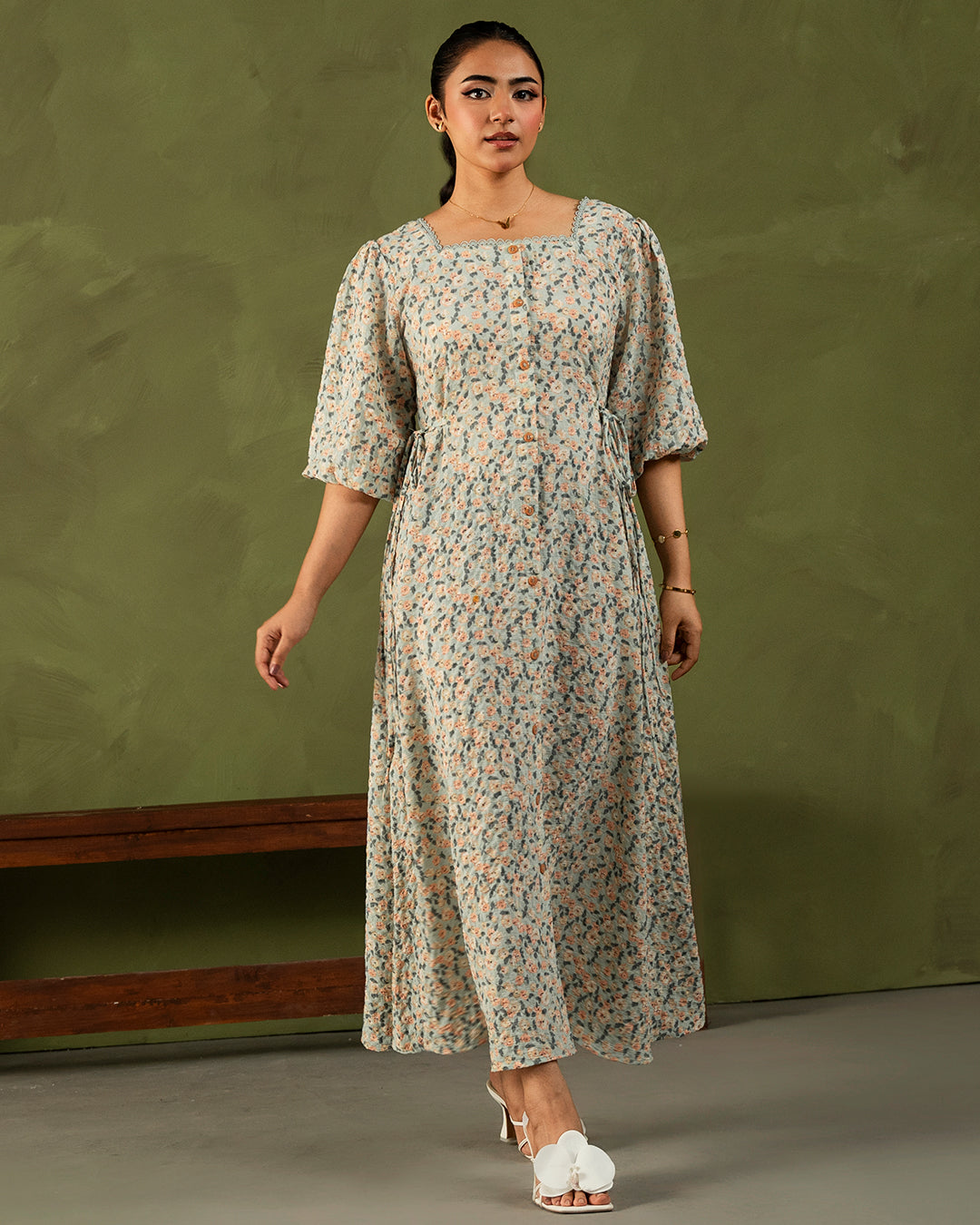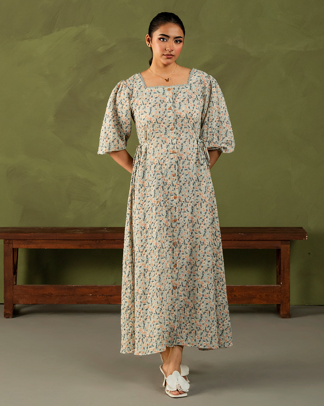 Crafted in a floral print, this dress features a charming square neckline adorned with delicate lace details. A button-down style with dainty floral buttons and adjustable drawstrings on both sides of the bodice ensures a perfectly tailored fit. Finished with our signature puffy elastic sleeves, this dress blends femininity with effortless grace.