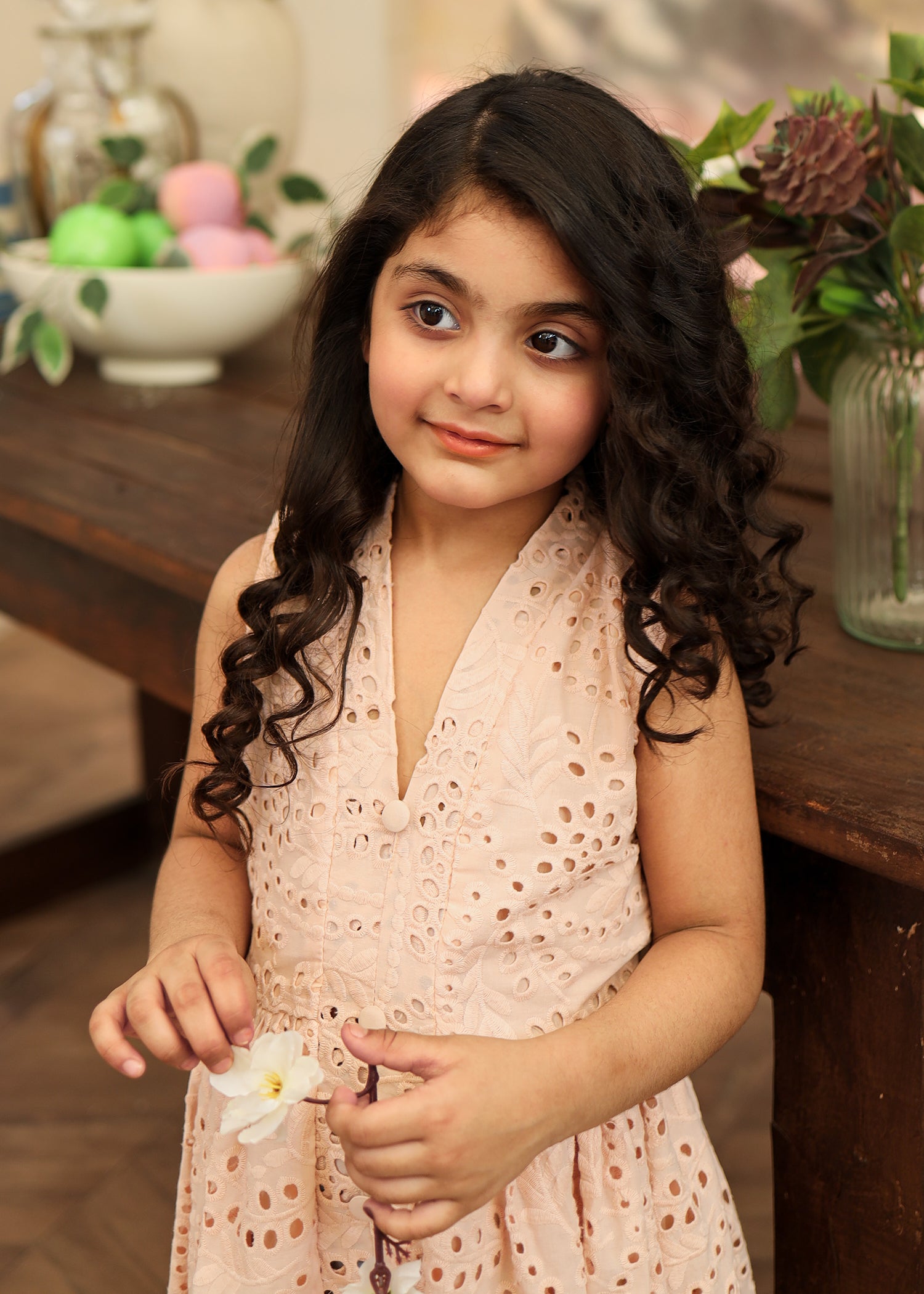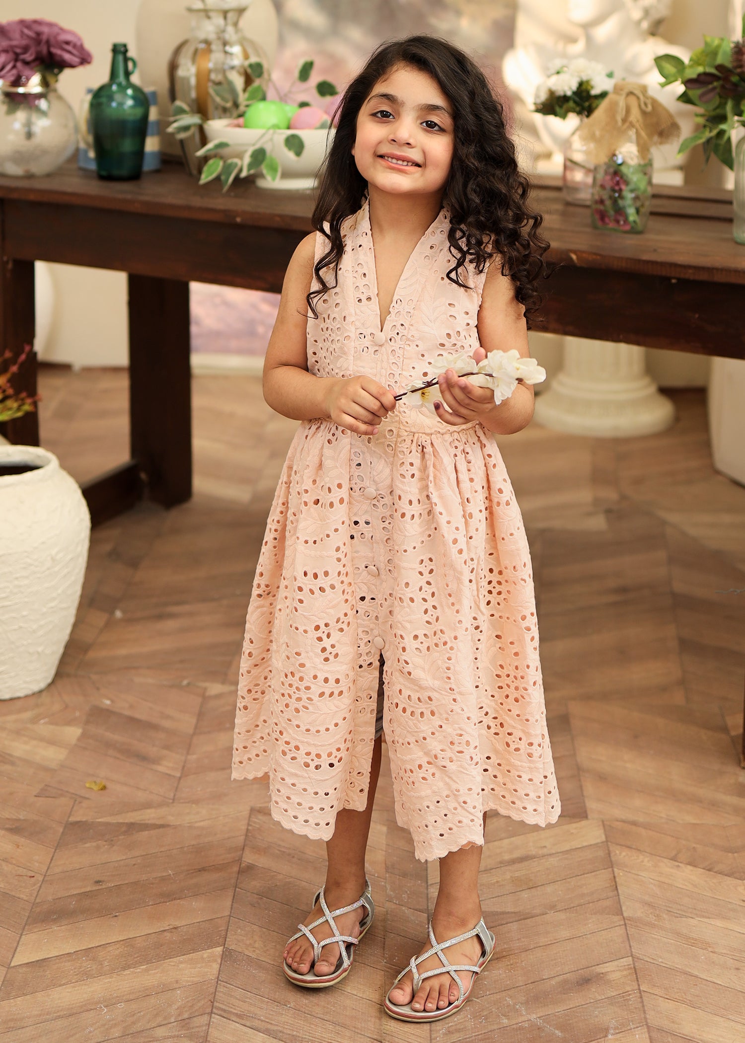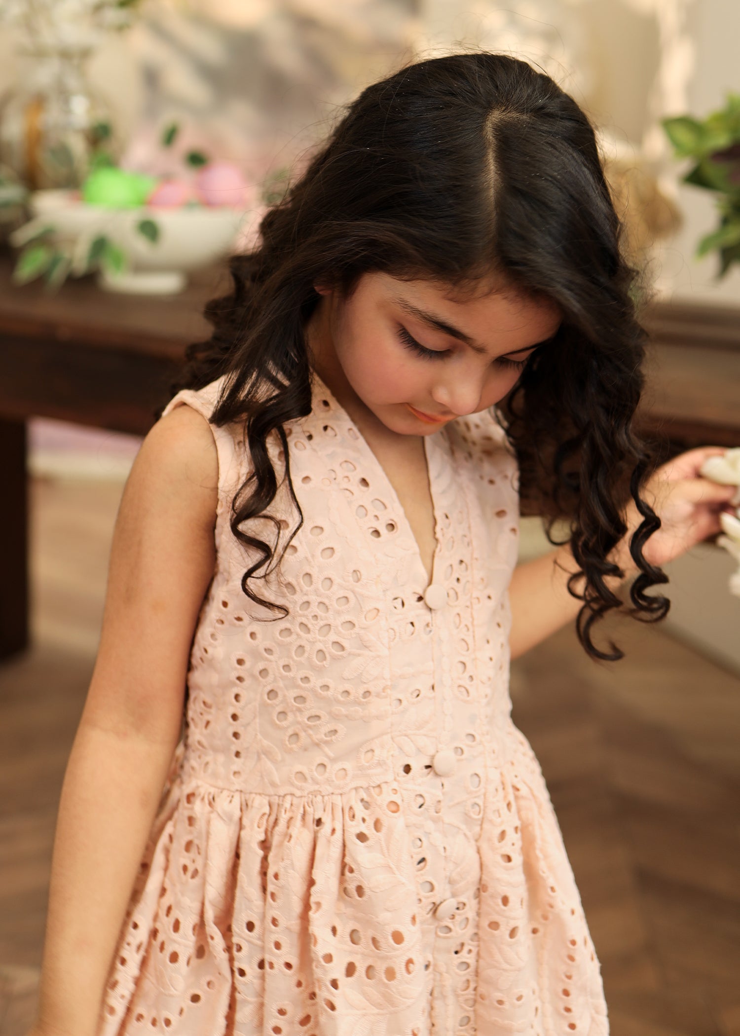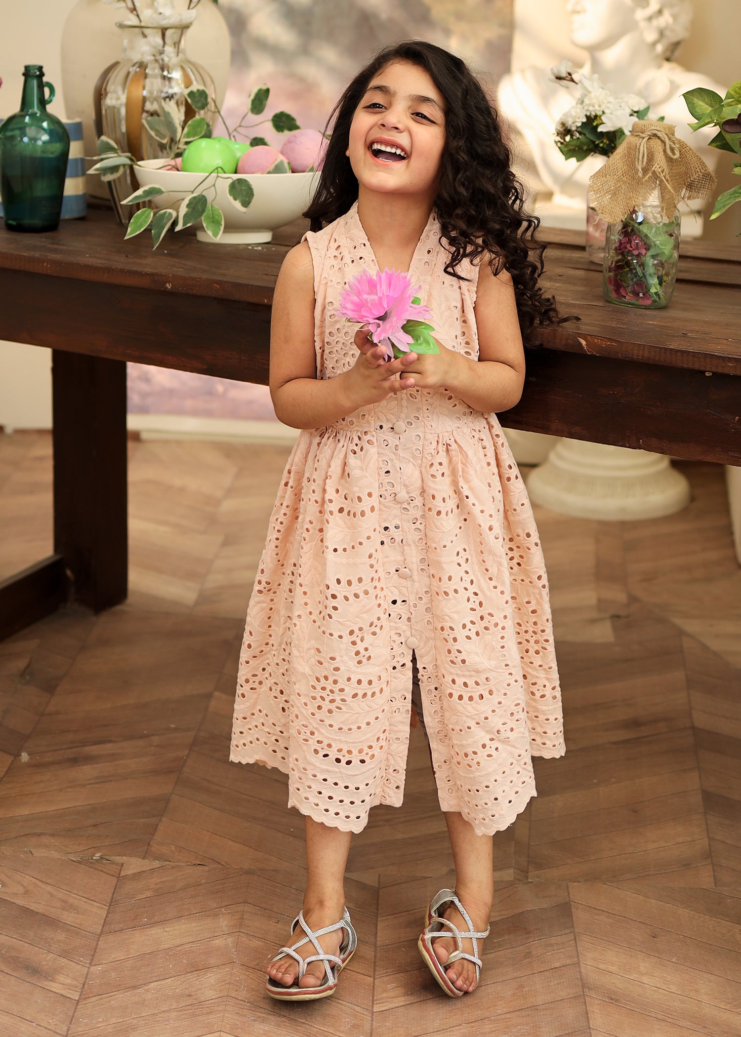 Fabric of the dress is eyelet (chikankari) with an attached lining.