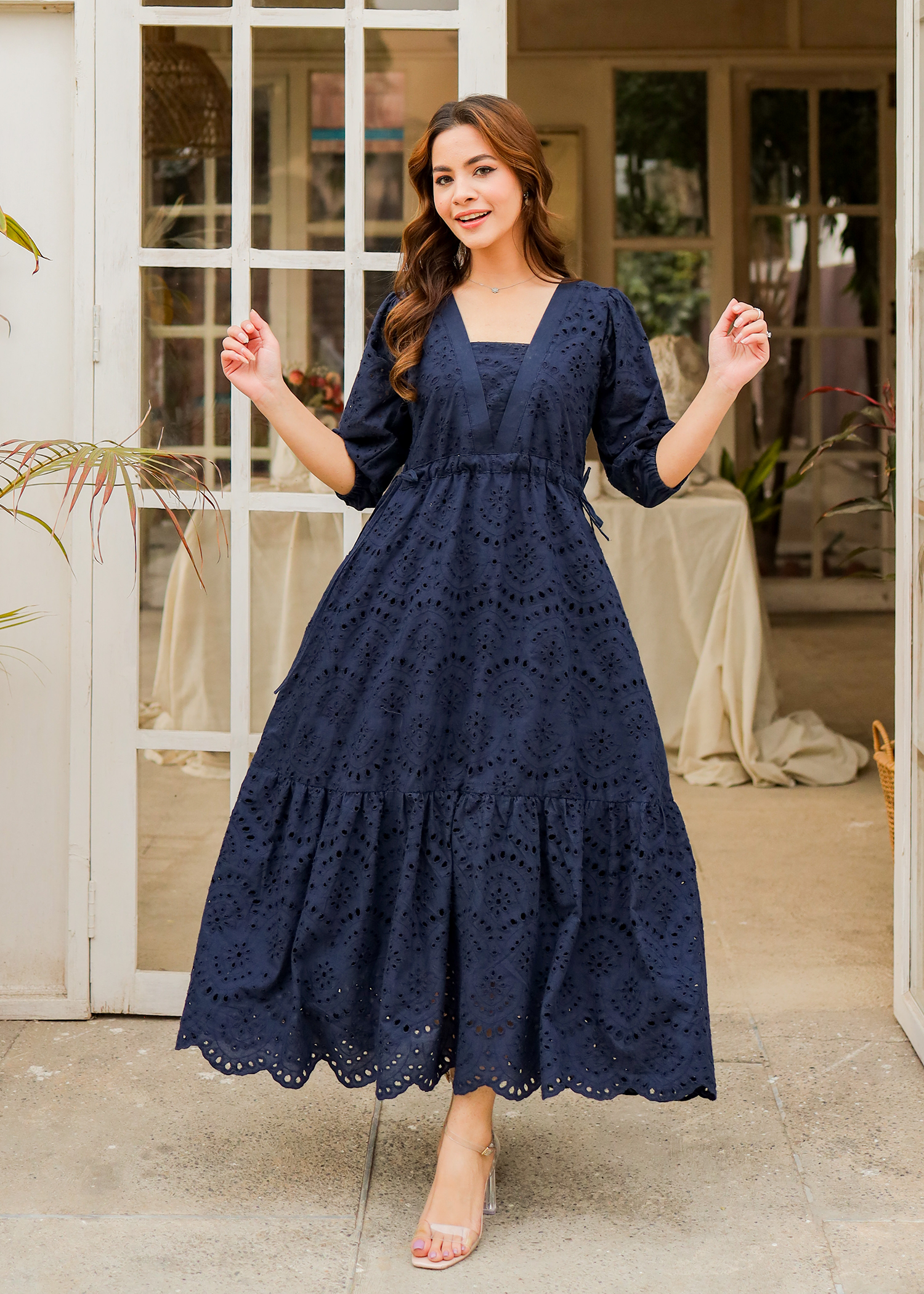 Step into celestial elegance with our Hazel Dress. Crafted from flowing navy blue eyelet fabric, this dress features a captivating V-cut neckline and enchanting puffy elastic sleeves. The long bottom frill with gorgeous scallops adds whimsical movement, while fixable drawstrings allow you to tailor the waist to your preference. Embrace effortless sophistication with every step in our Hazel dress!