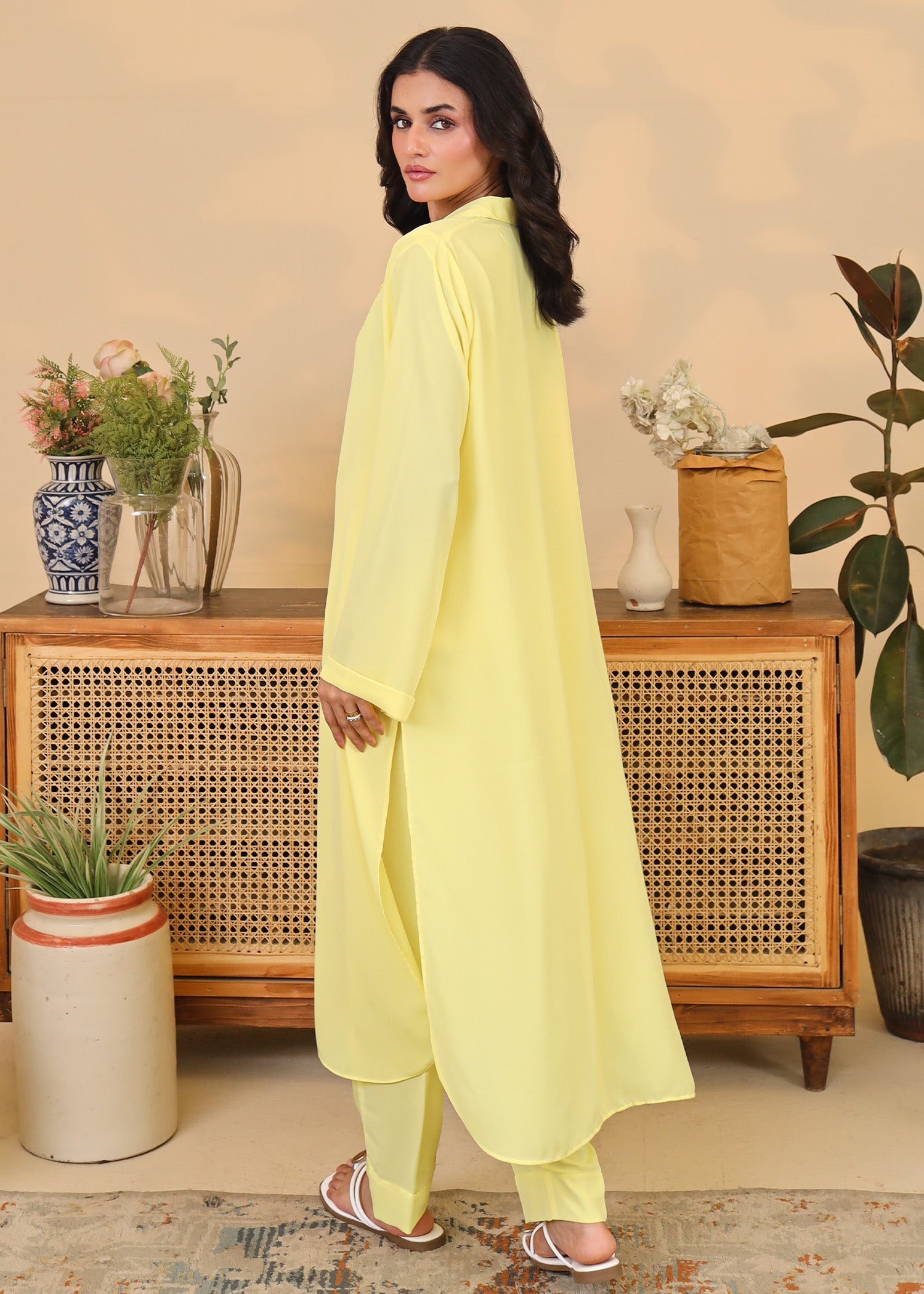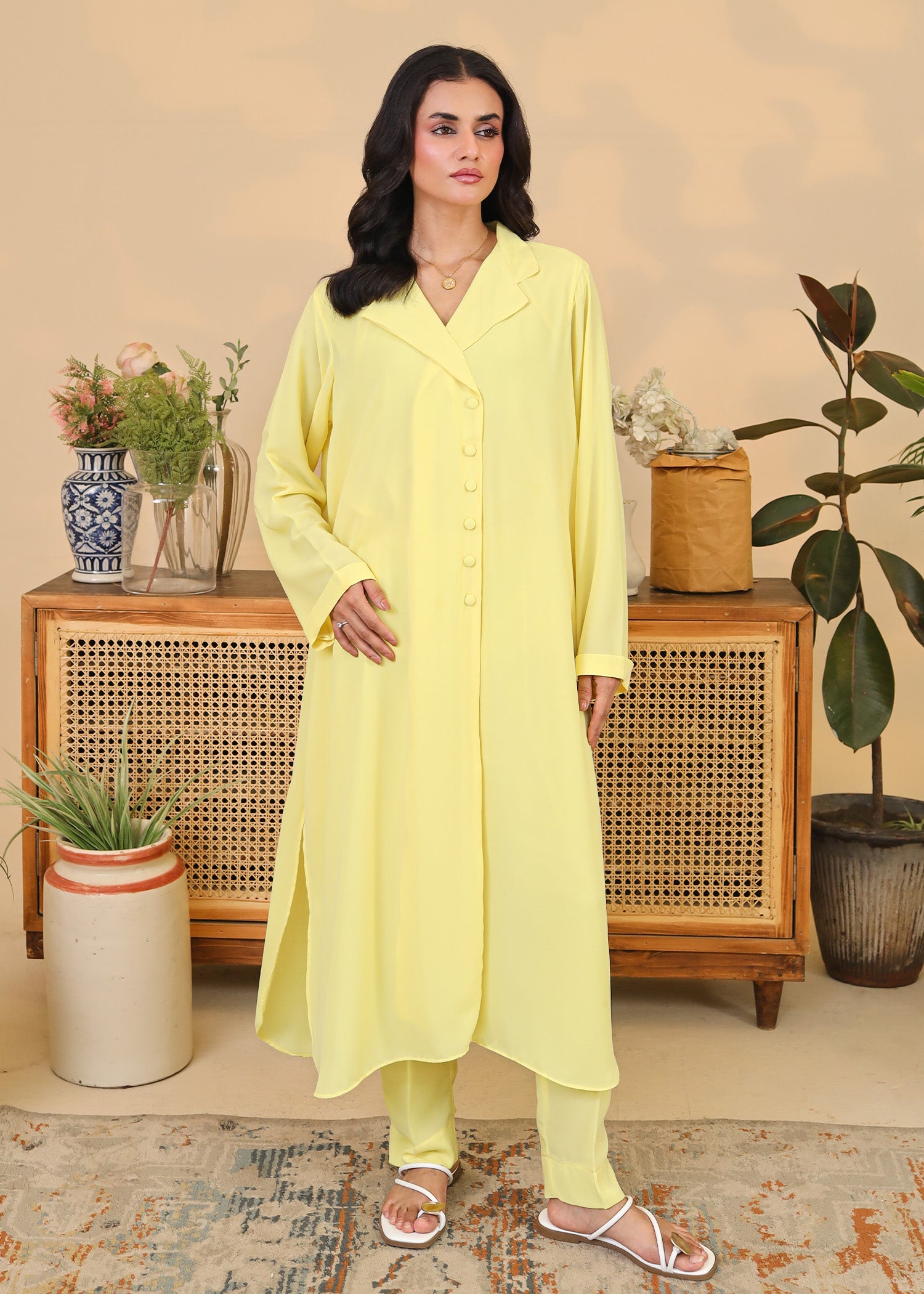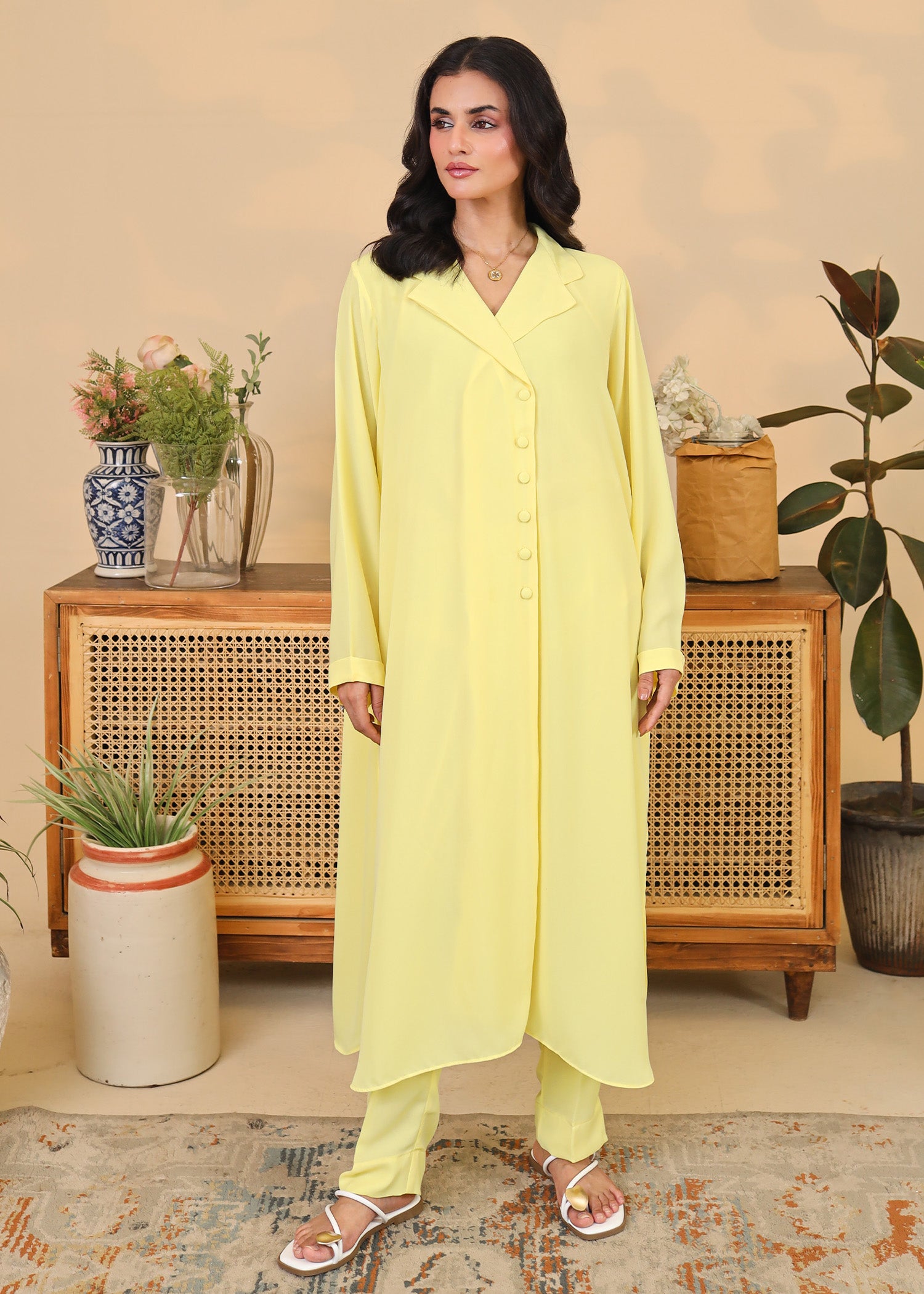 This 2-piece outfit features a straight-cut long shirt with a notched collar, front button detailing, and long sleeves. Paired with slim-fit trousers in the same cheerful hue, this ensemble is perfect for daytime outings, summer brunches, or festive casuals. The flowy, breathable fabric ensures comfort without compromising on elegance.