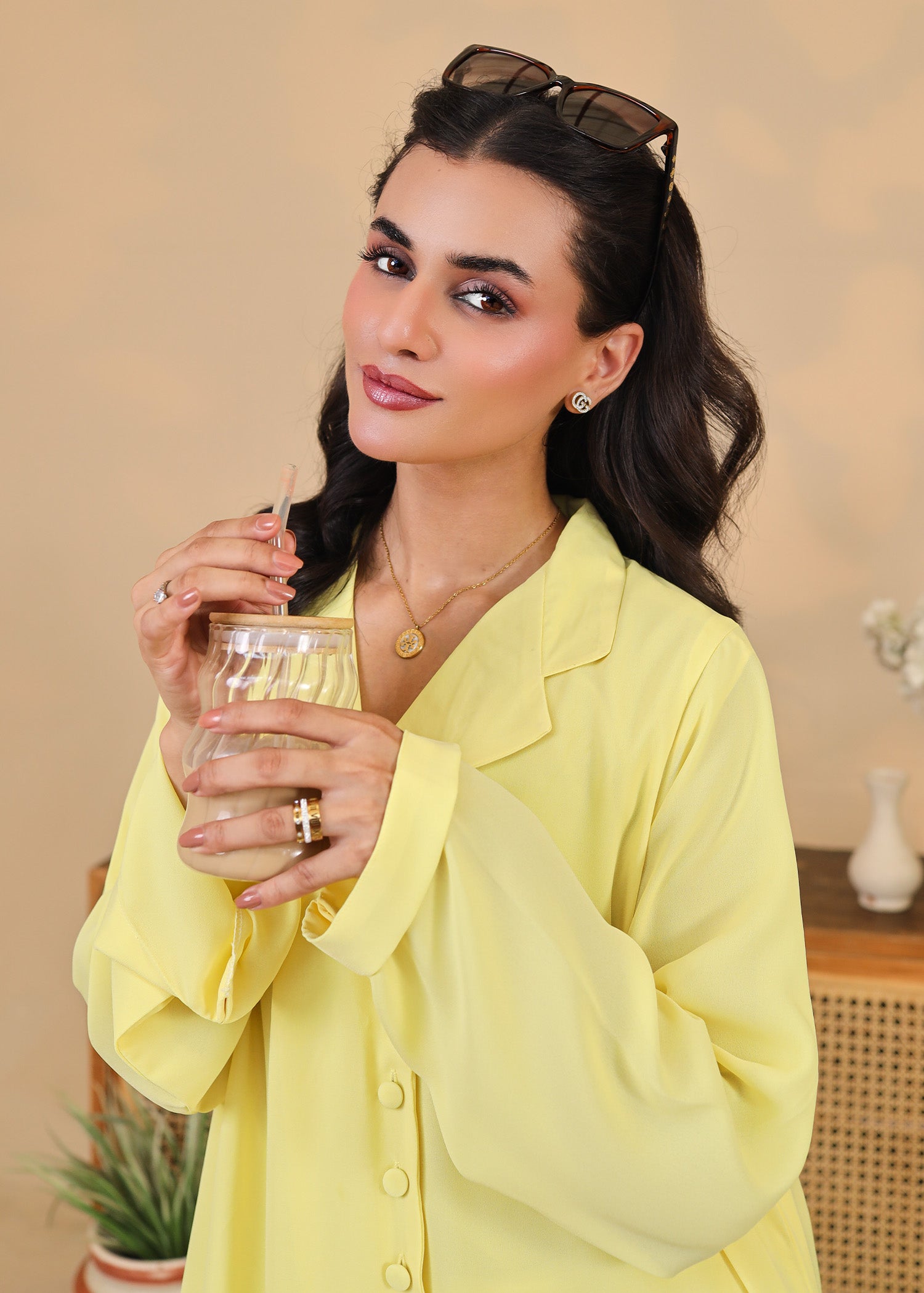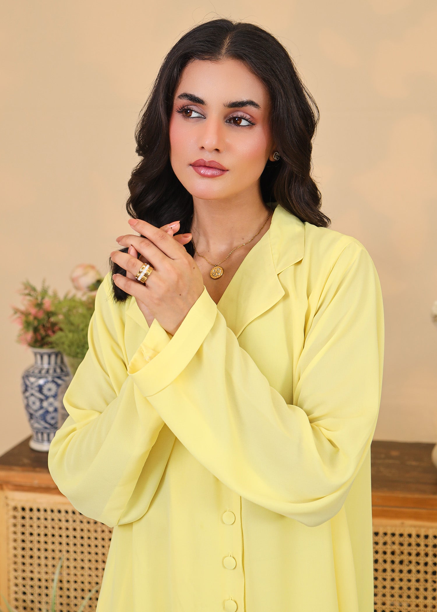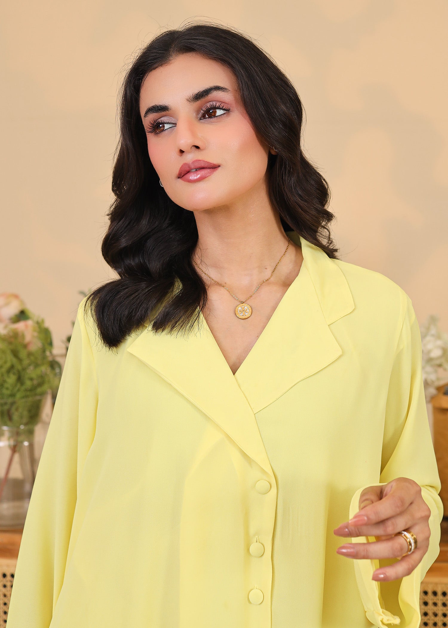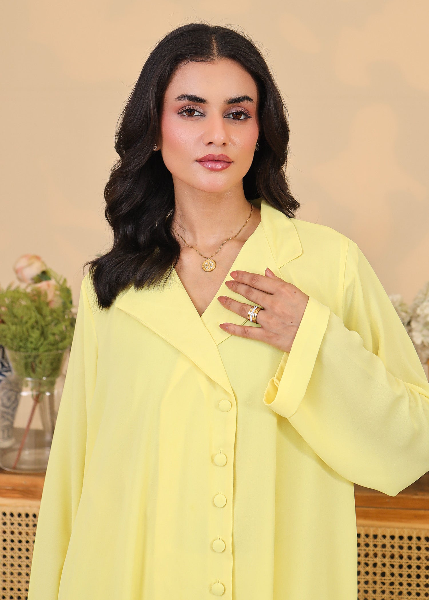 This 2-piece outfit features a straight-cut long shirt with a notched collar, front button detailing, and long sleeves. Paired with slim-fit trousers in the same cheerful hue, this ensemble is perfect for daytime outings, summer brunches, or festive casuals. The flowy, breathable fabric ensures comfort without compromising on elegance.