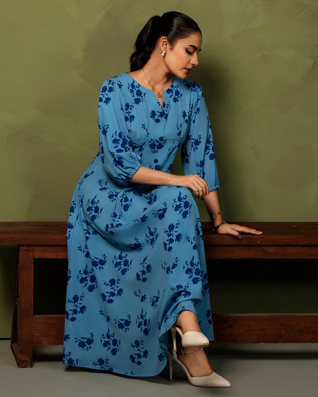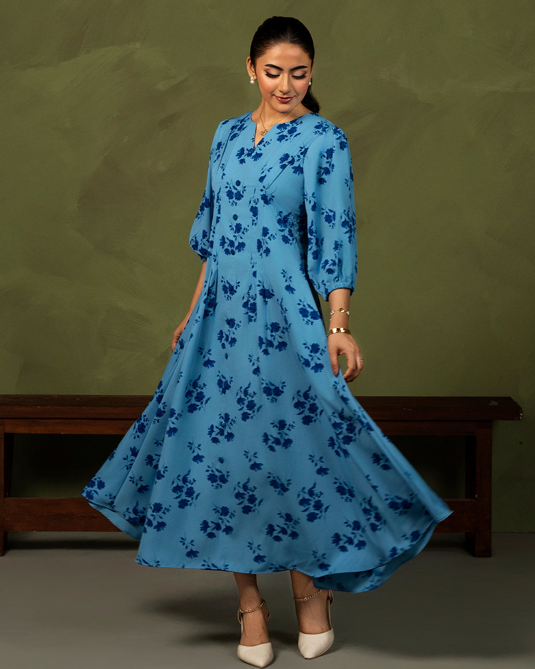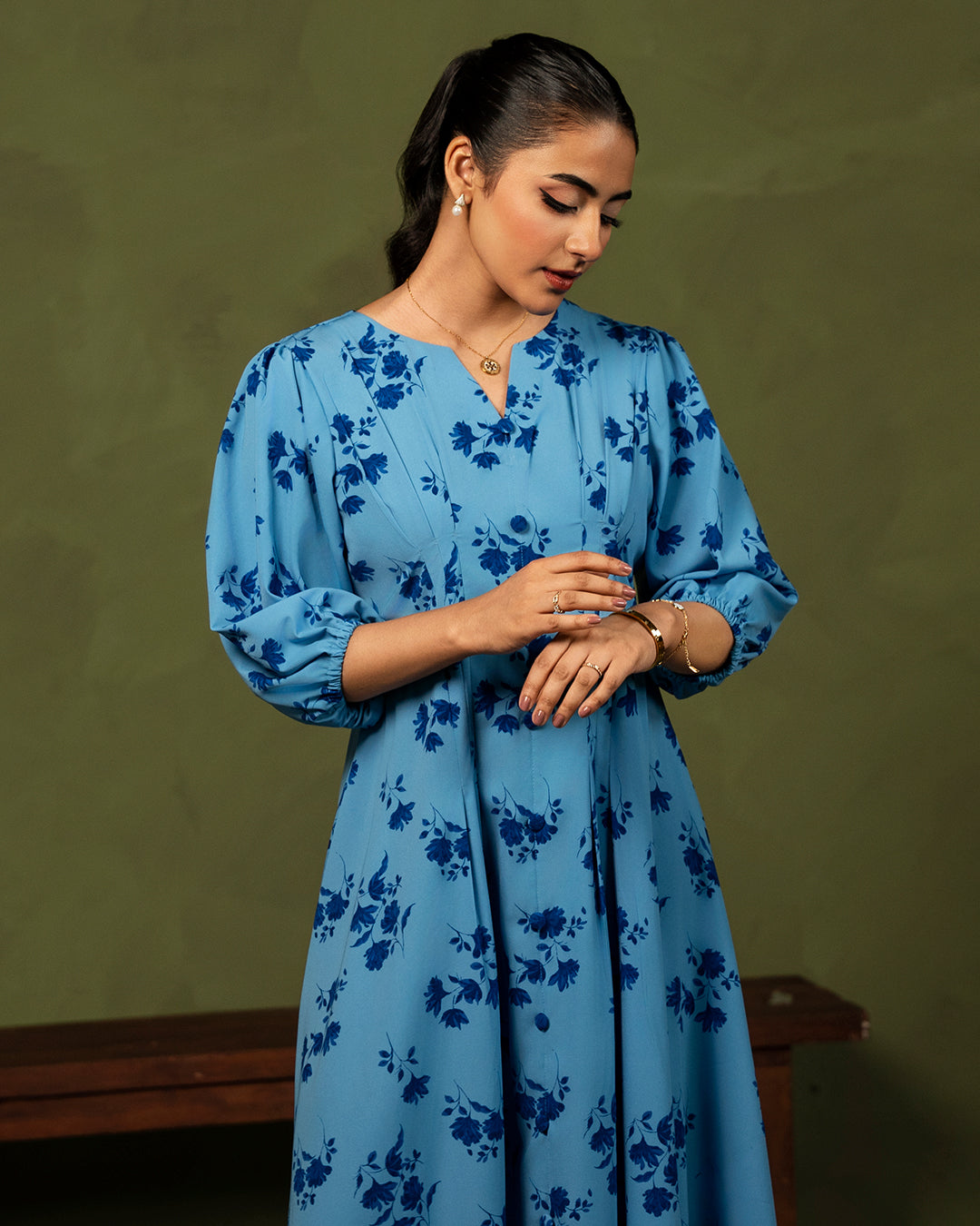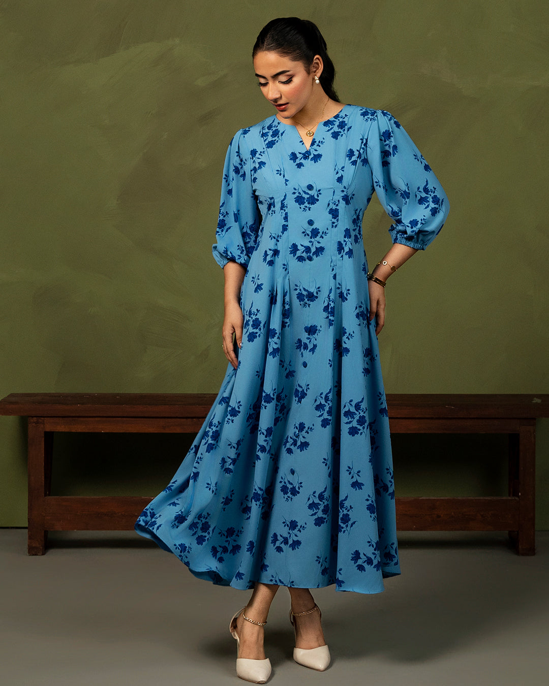 Marena is a gorgeous blue floral print dress featuring elaborate pleated details, buttons, and puffy sleeves.