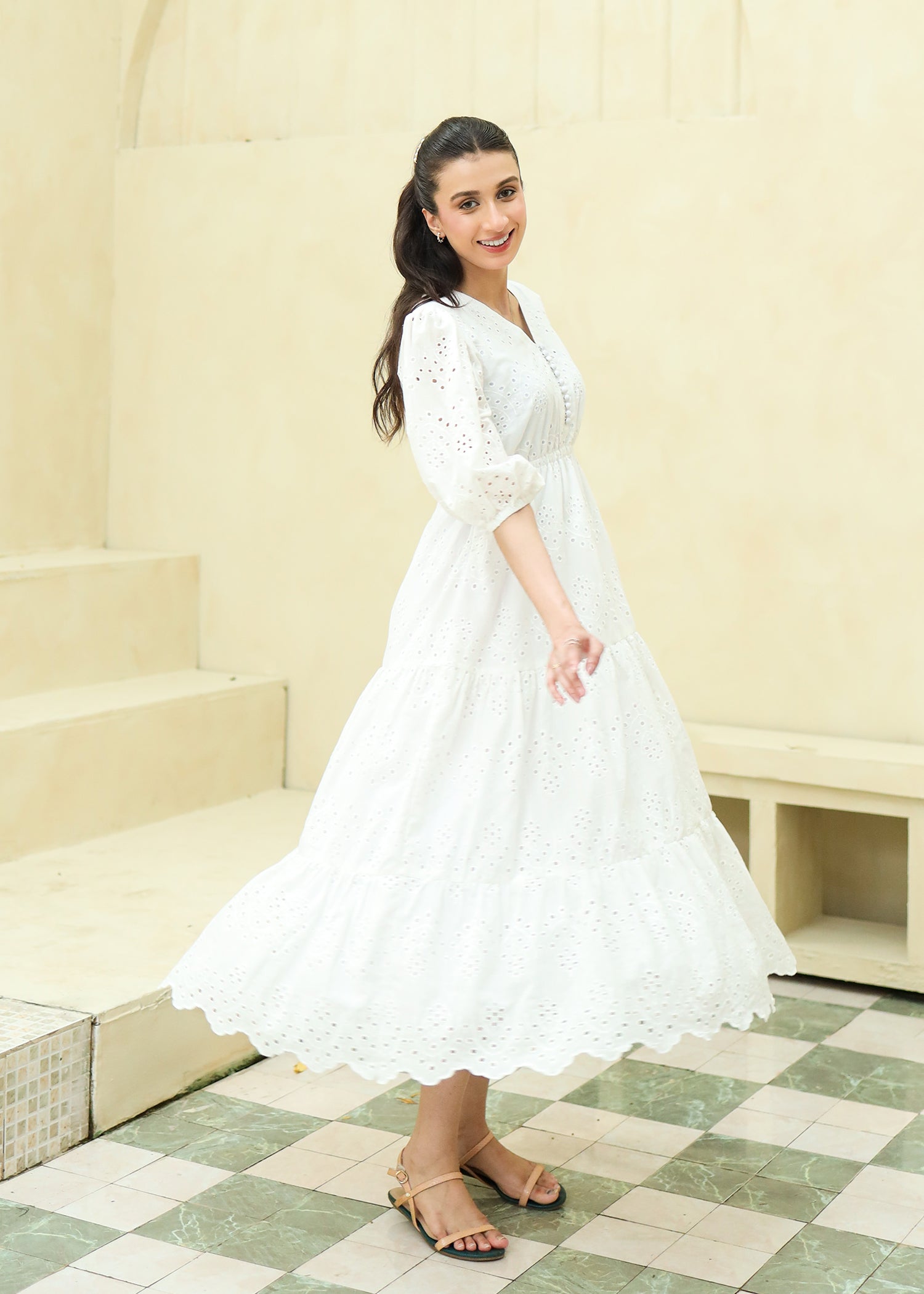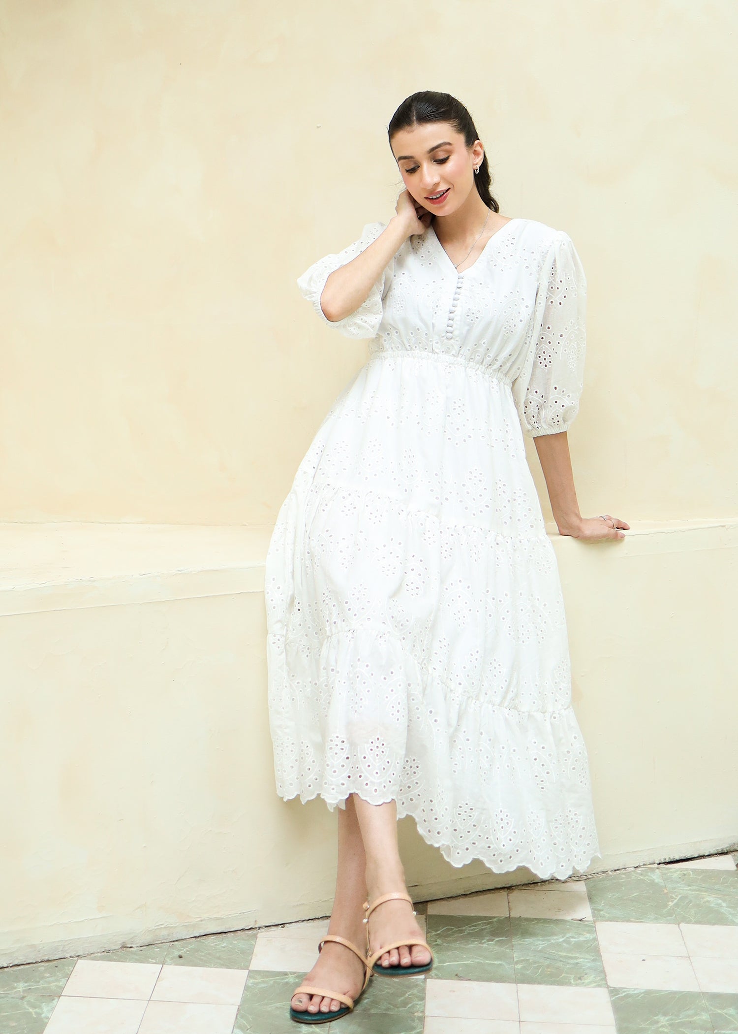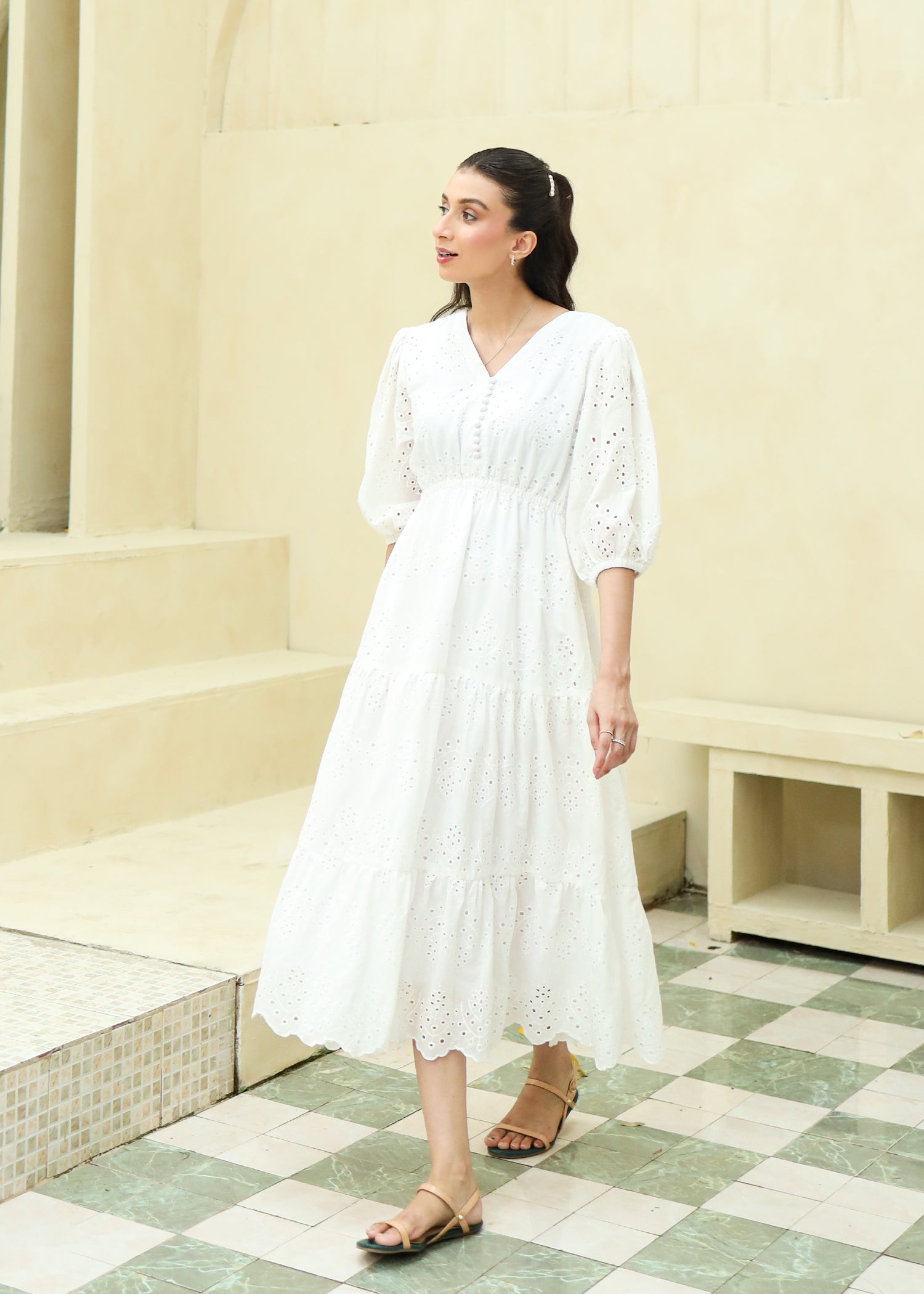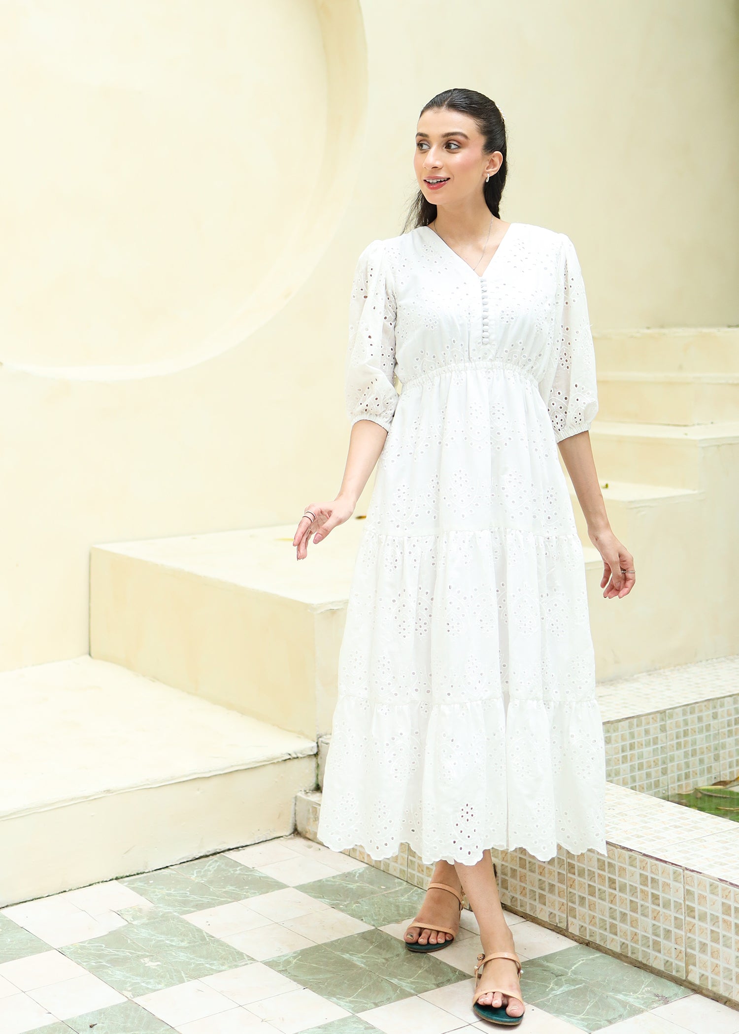 A gorgeous pristine white dress featuring a V neckline with button details, a three tiered dress skirt and elastic in the waistline that adds a perfect shape to the dress.