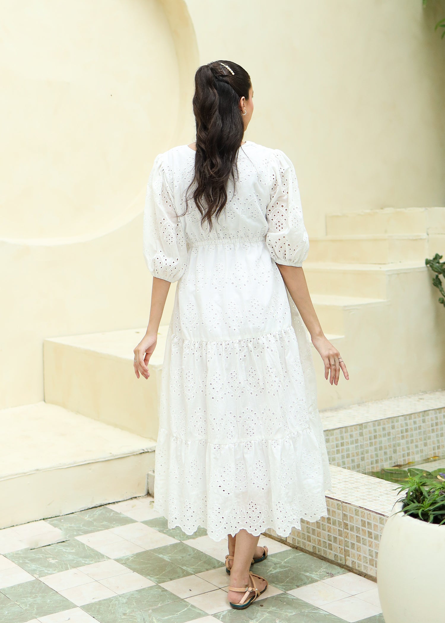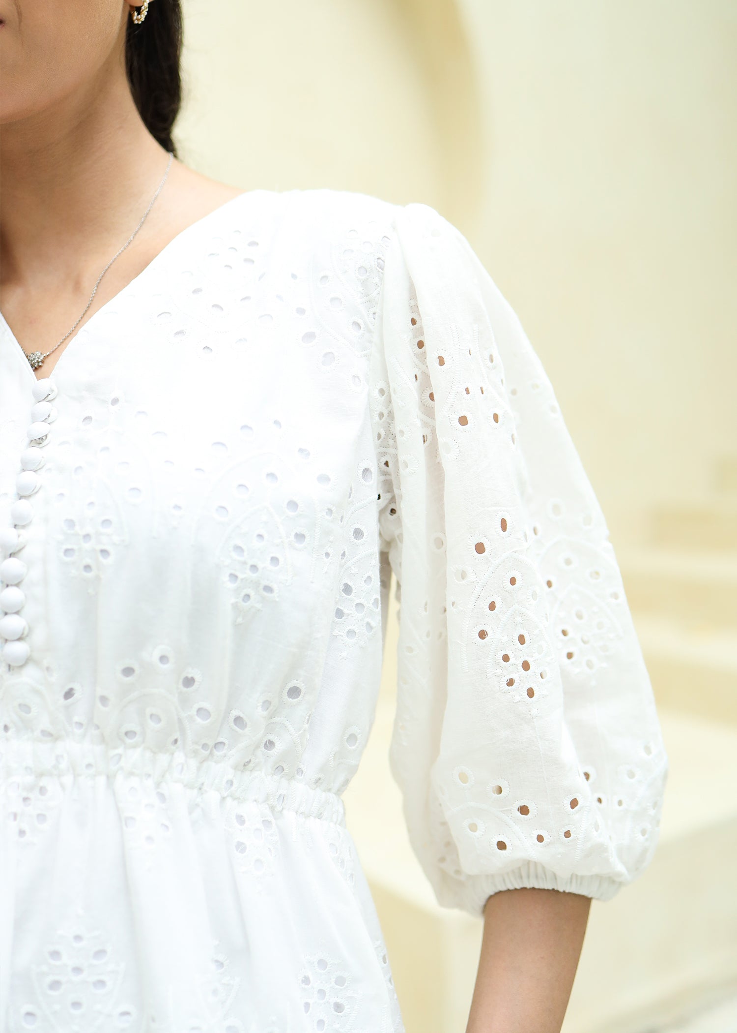 Fabric of the dress is eyelet (chikankari) with attached lining.