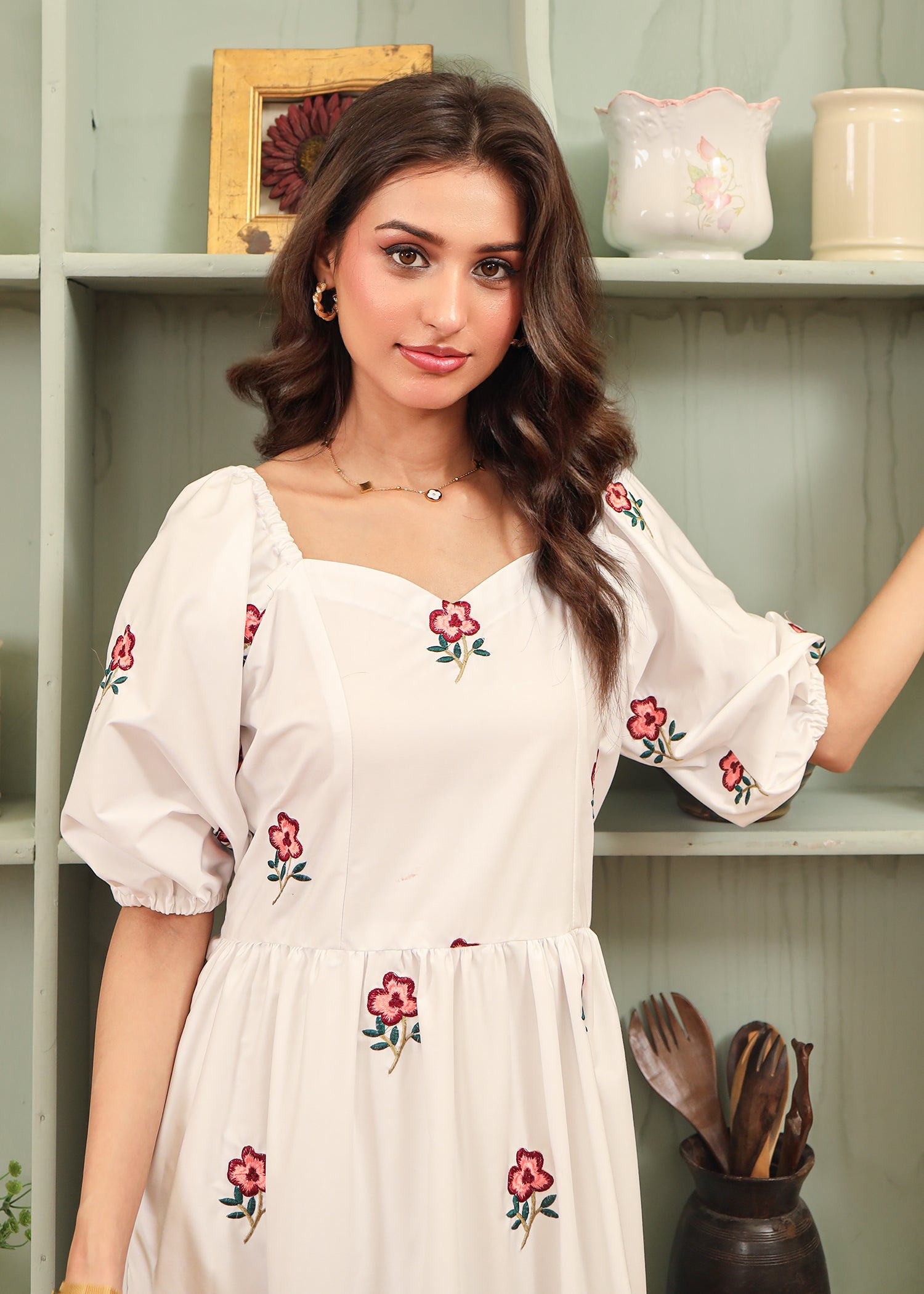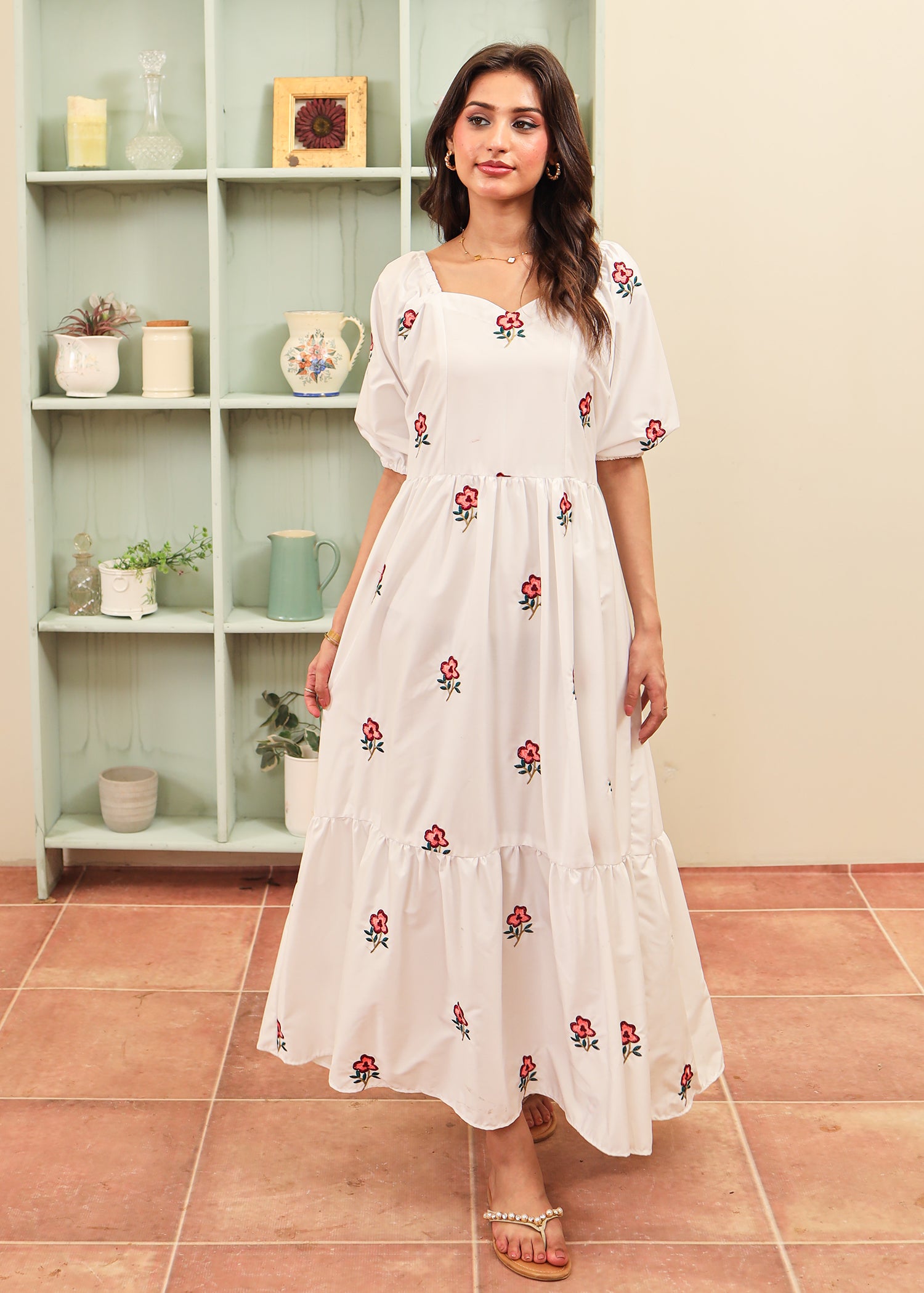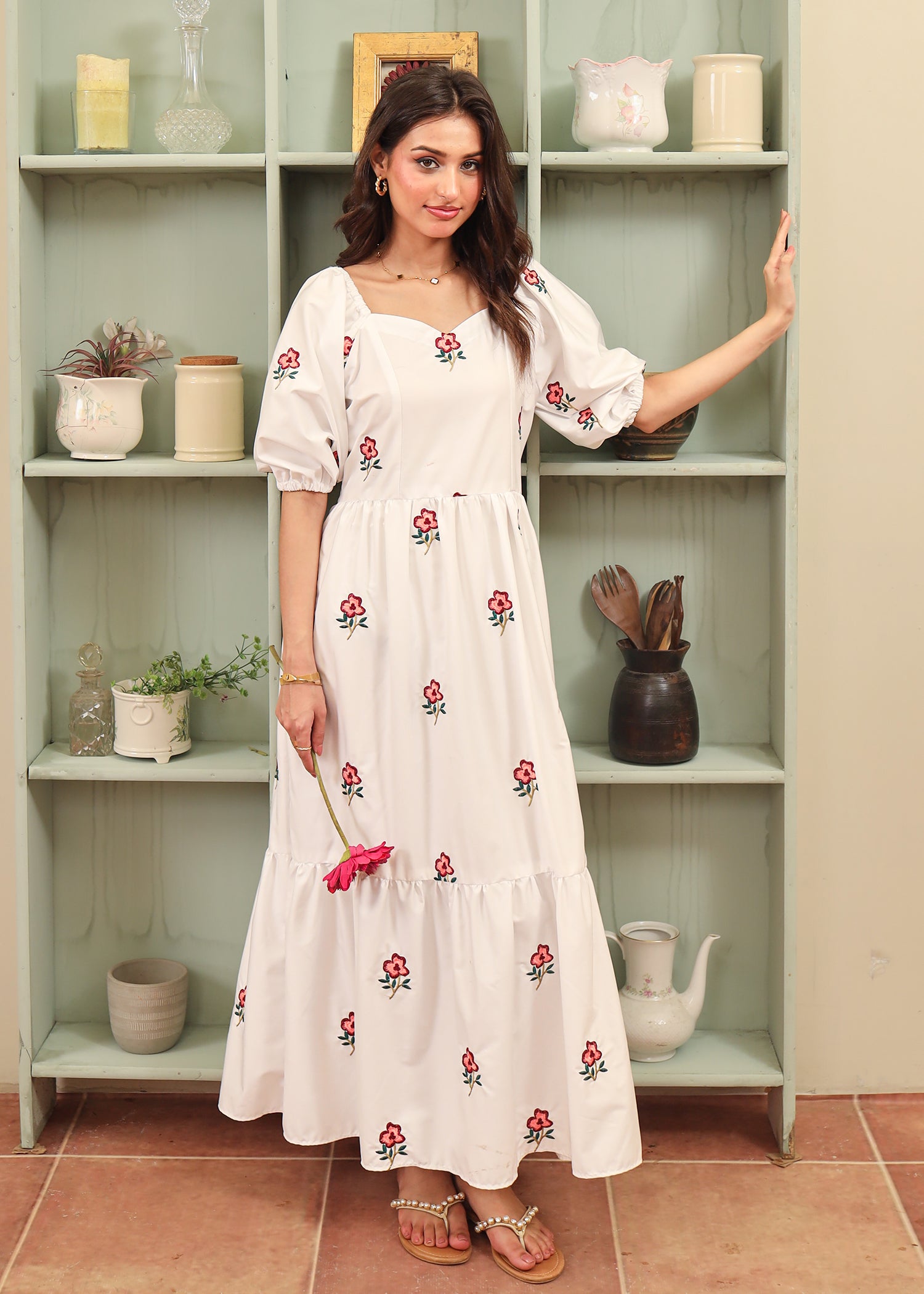 Mariposa features a sweetheart neckline complimented with puffy elastic sleeves and a long bottom frill. This embroidered cotton dress is everything that you need this spring!