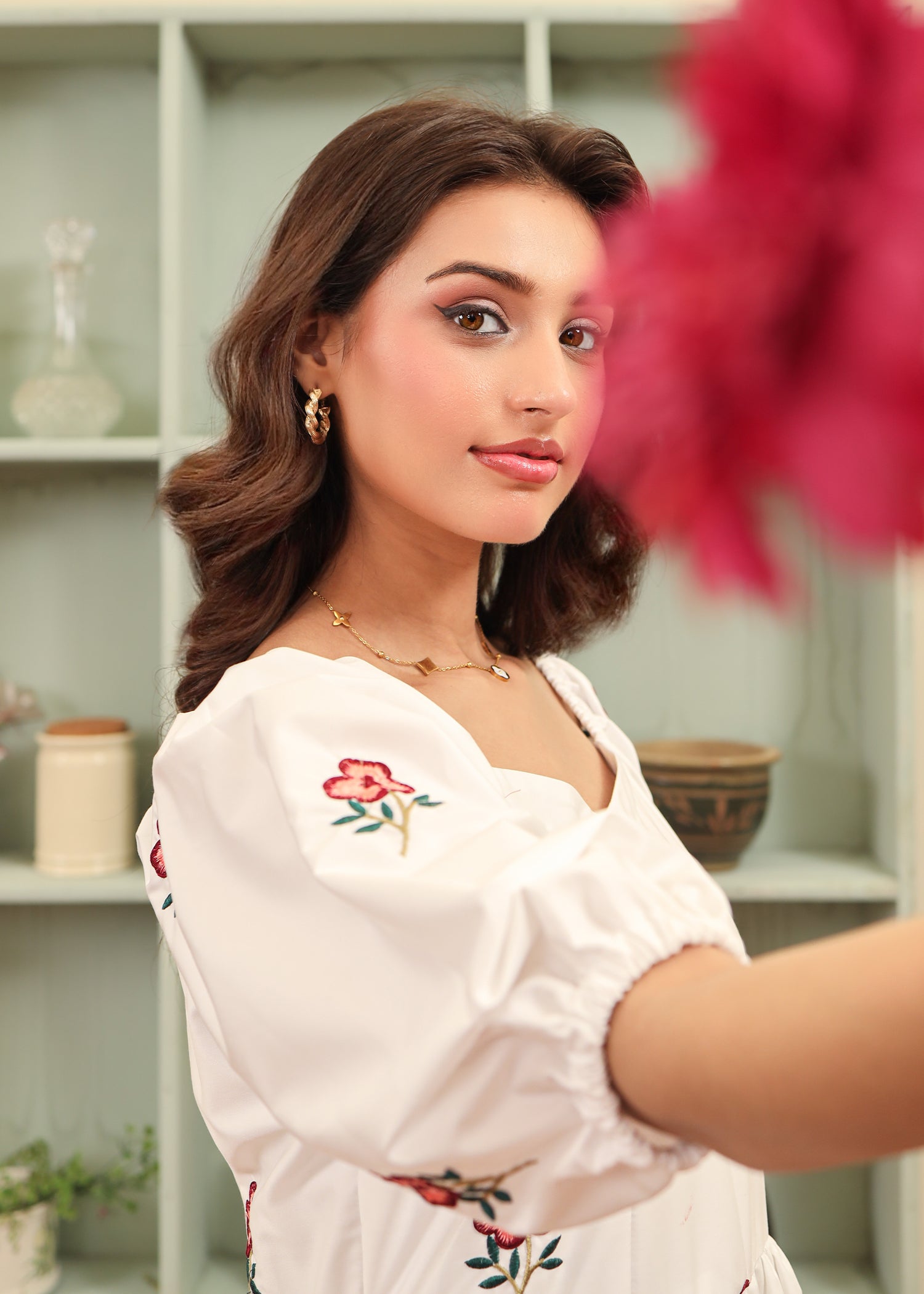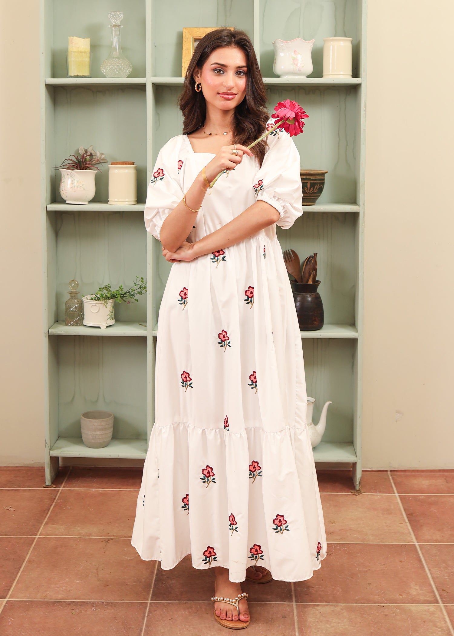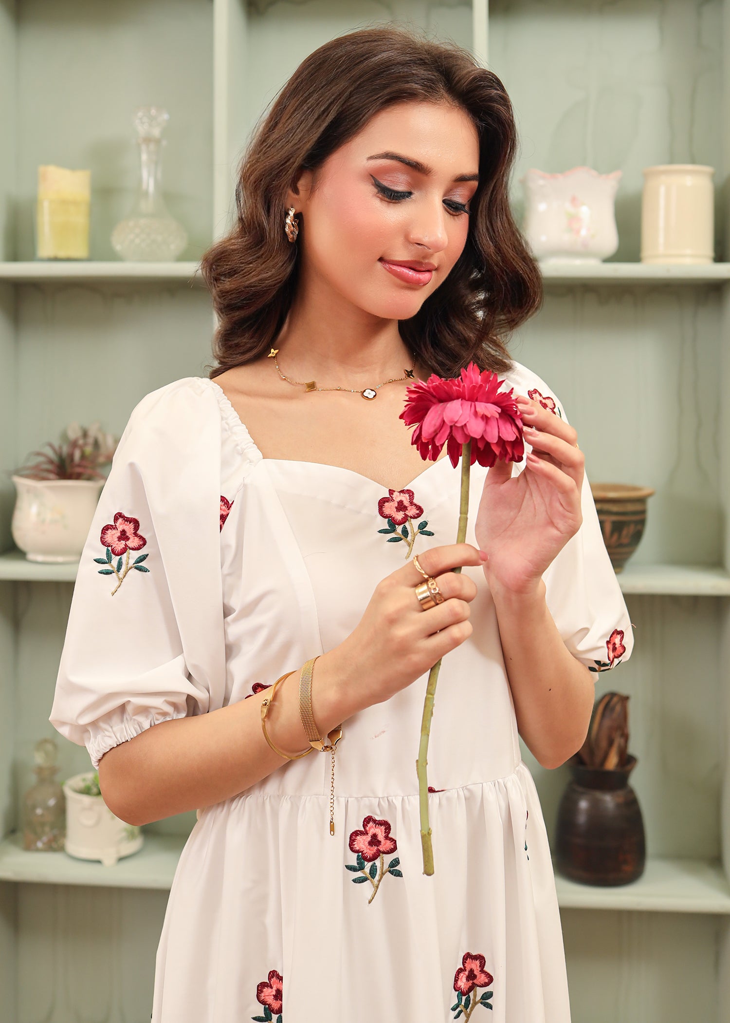 Mariposa features a sweetheart neckline complimented with puffy elastic sleeves and a long bottom frill. This embroidered cotton dress is everything that you need this spring!