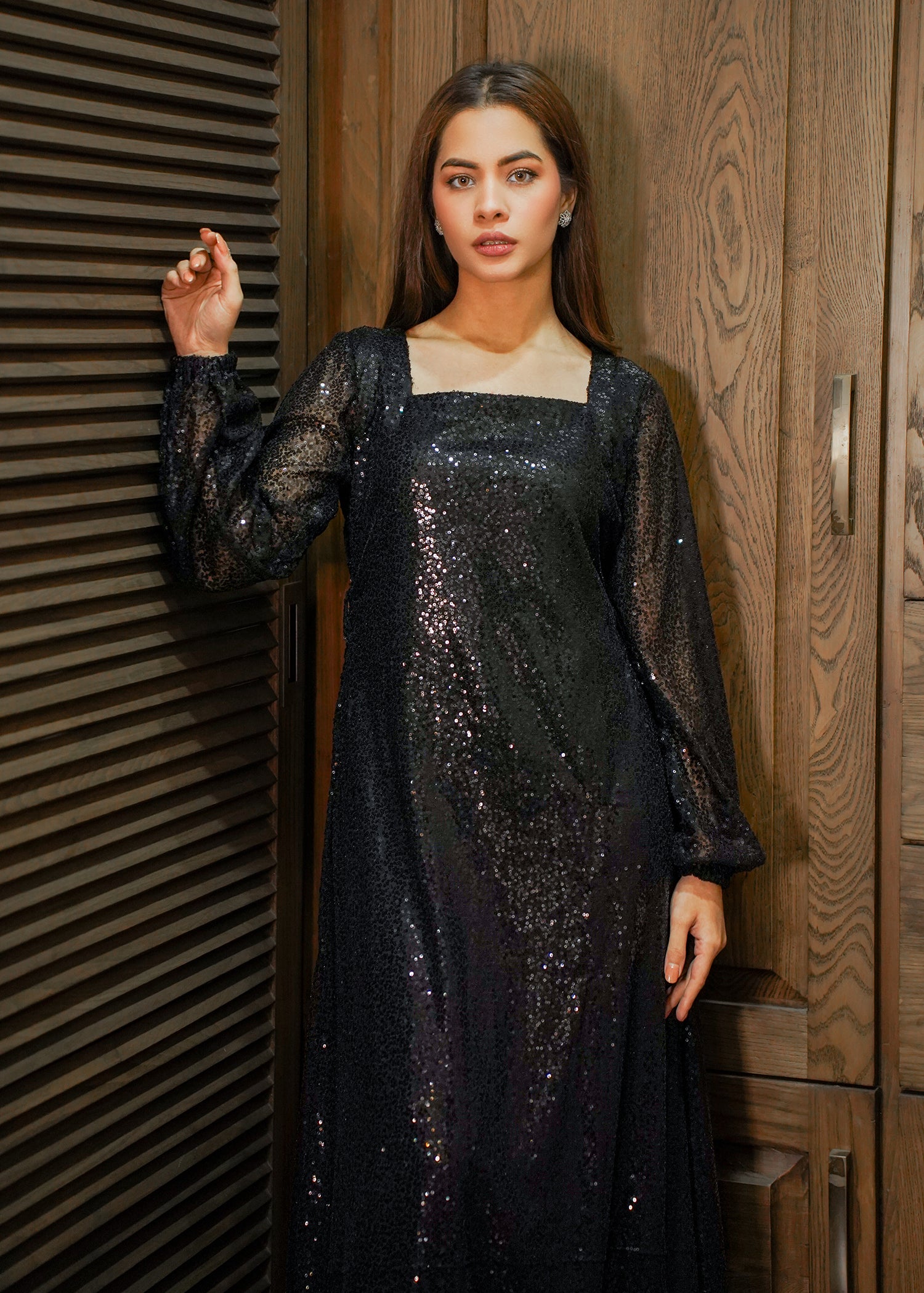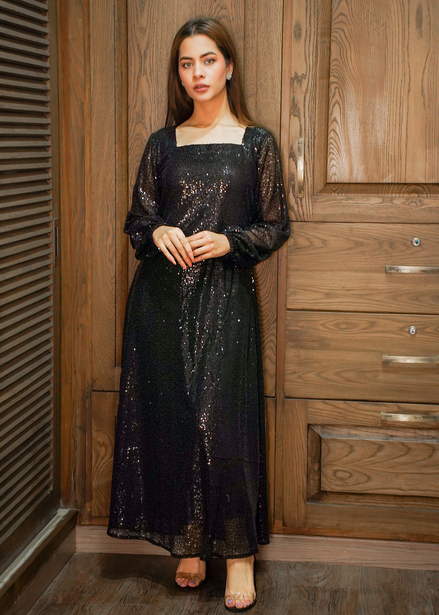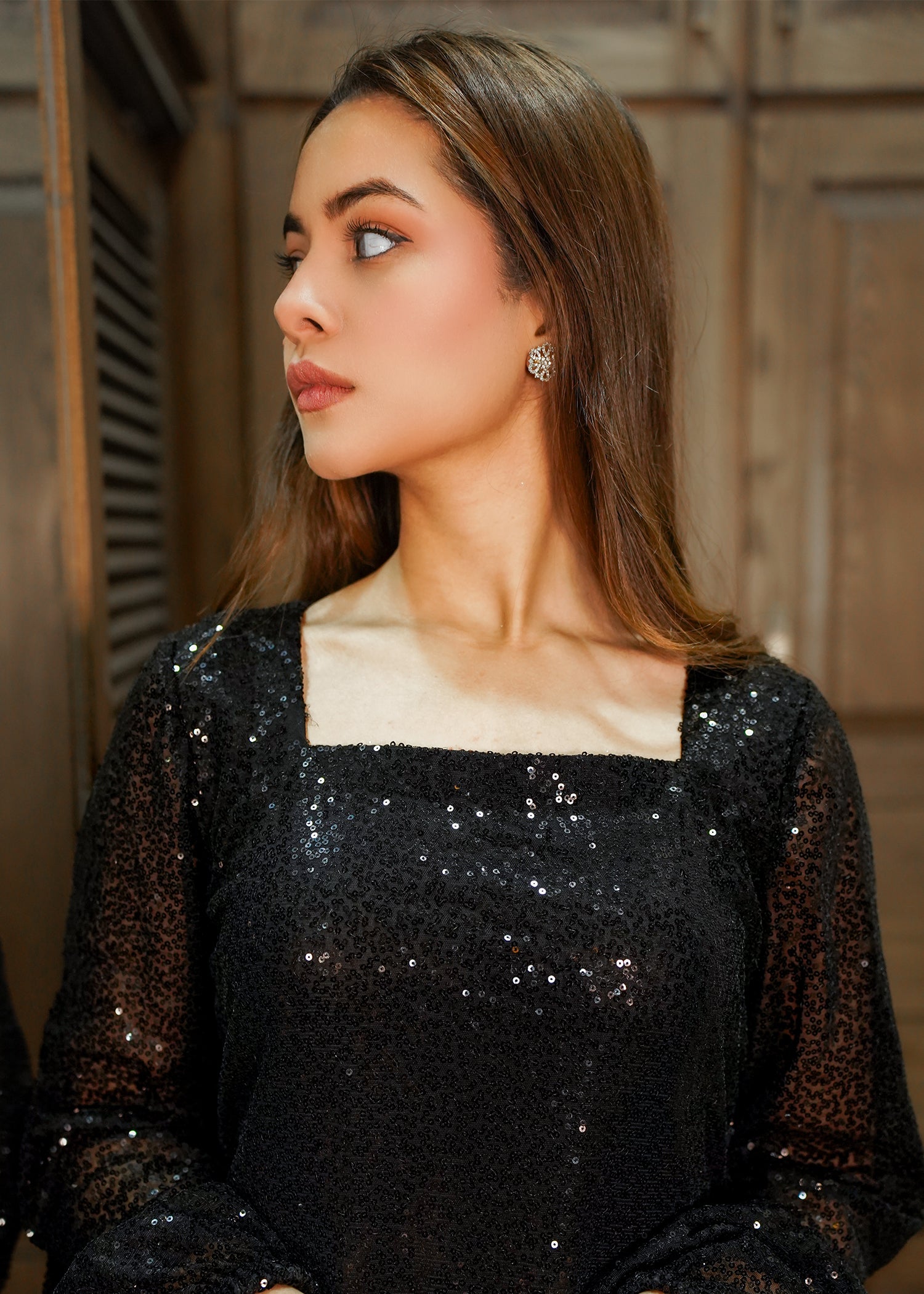 A stunning black sequin dress with a square neckline and puffy elastic sleeves.
