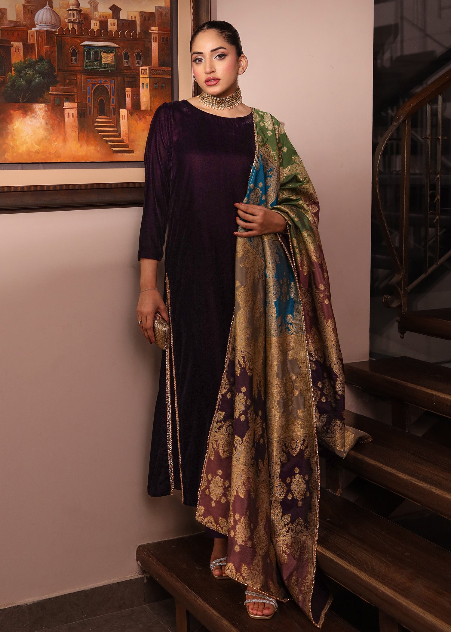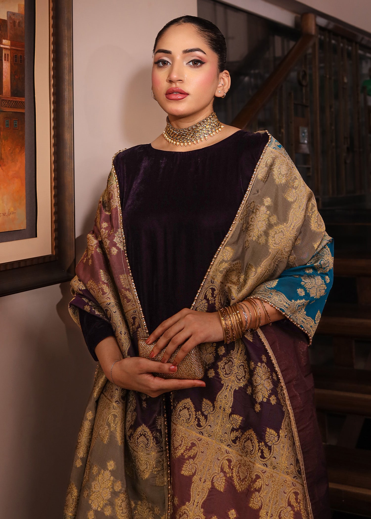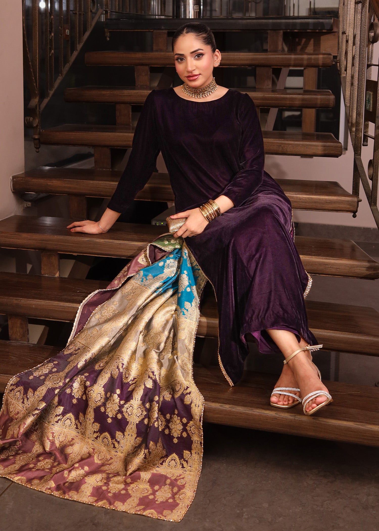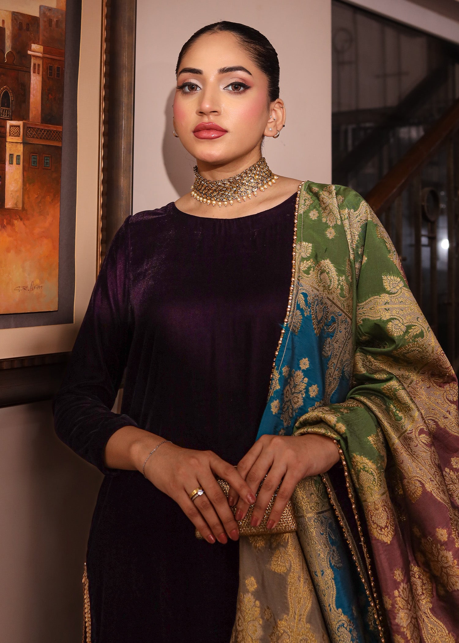 A deep plum velvet canvas paired with a regal Banarsi shawl — where tradition meets modern sophistication. The velvet shirt is adorned with intricate cutwork lace detailing on the chowks, adding richness and refinement to its timeless silhouette. Paired with straight tusser silk pants and a luxurious Banarsi shawl, this ensemble is perfect for winter soirées and family gatherings, blending opulence with understated grace.
