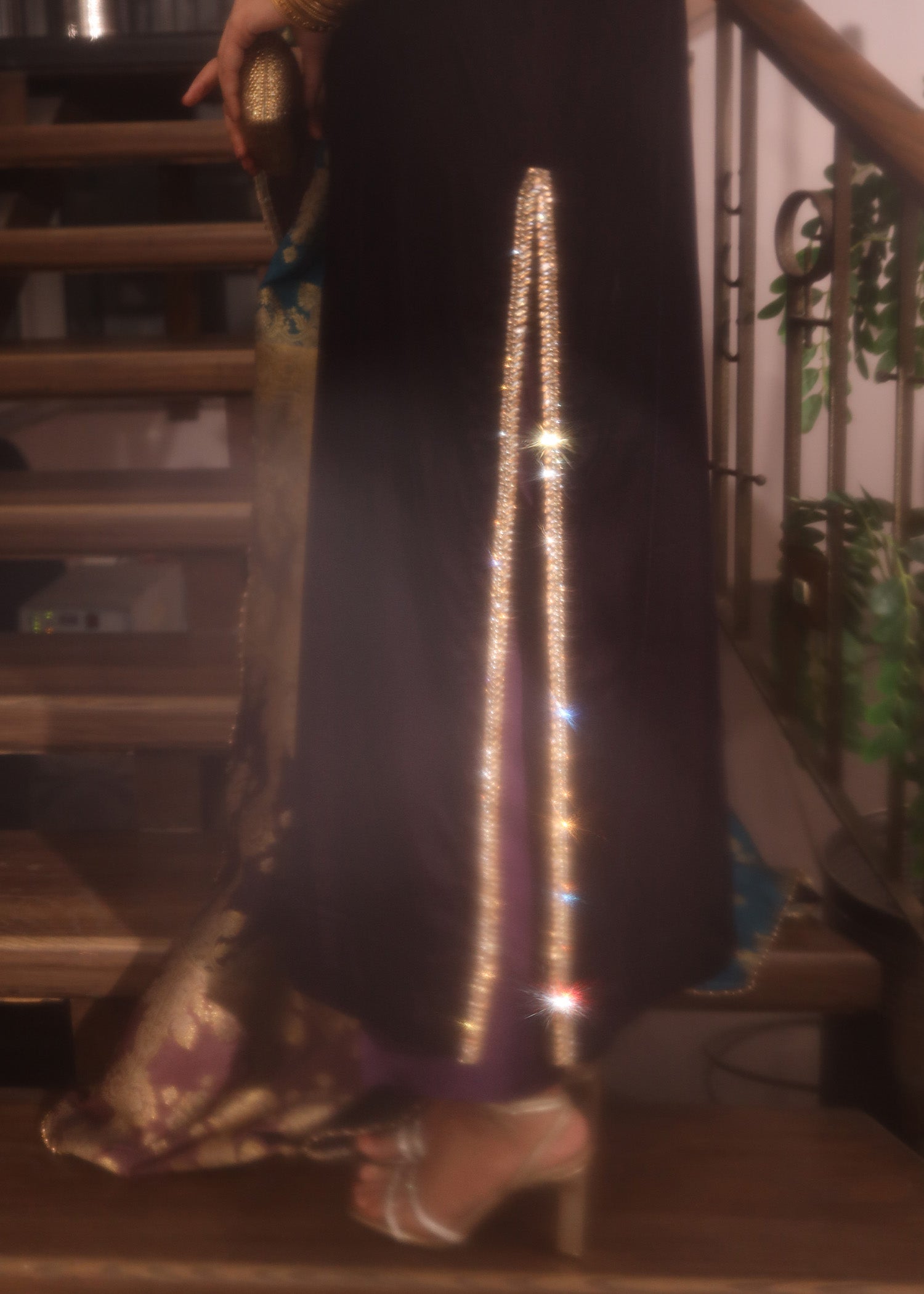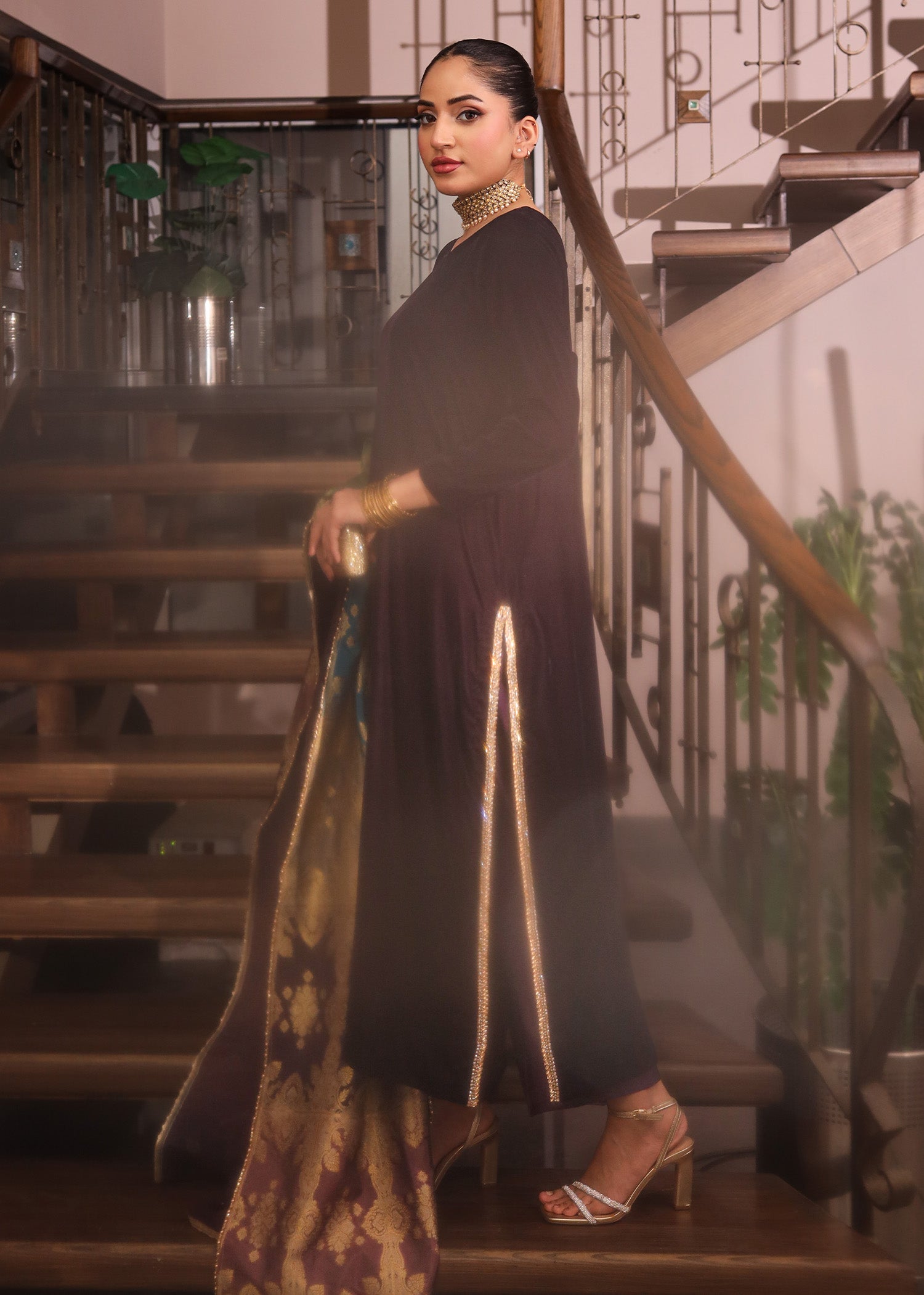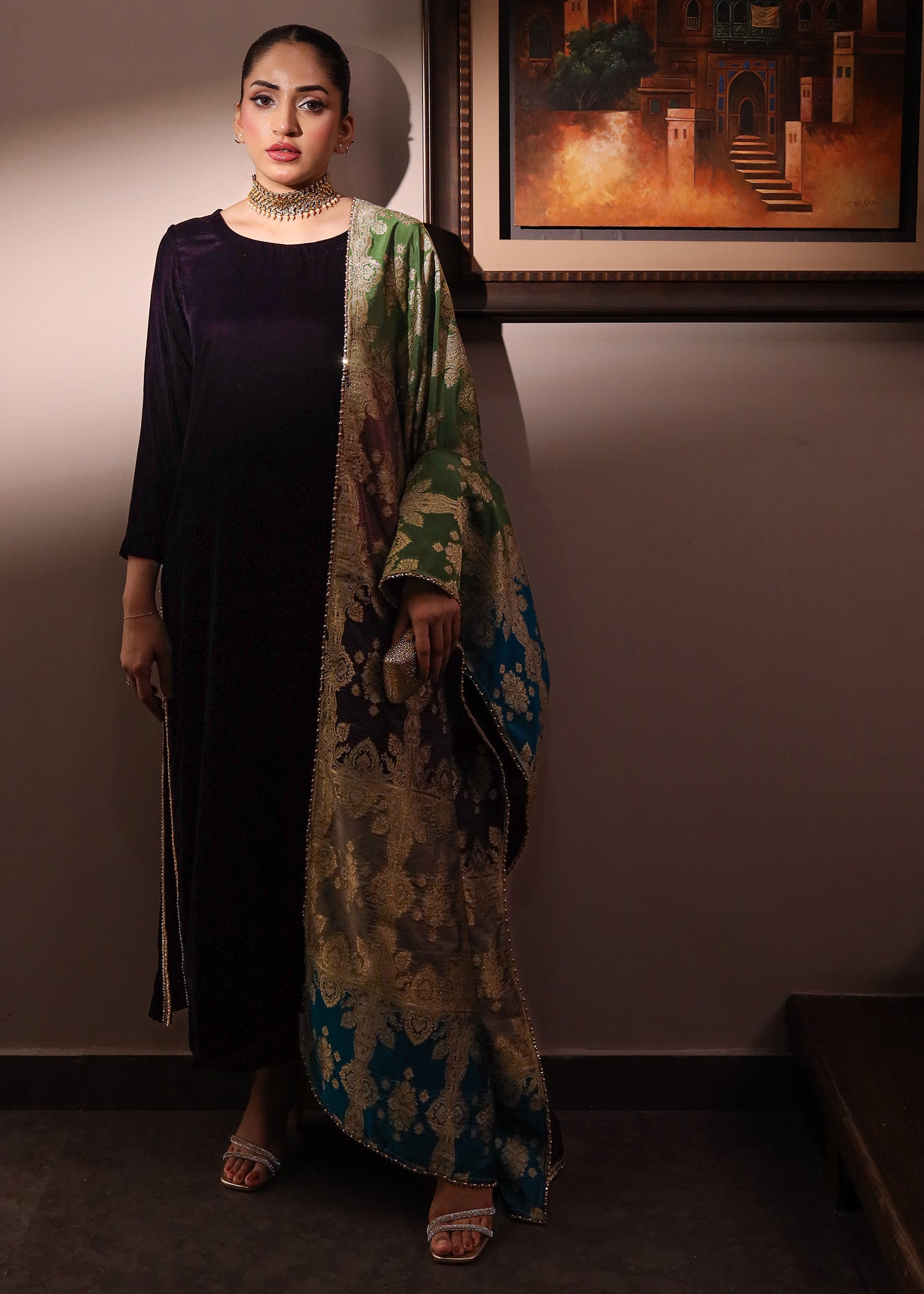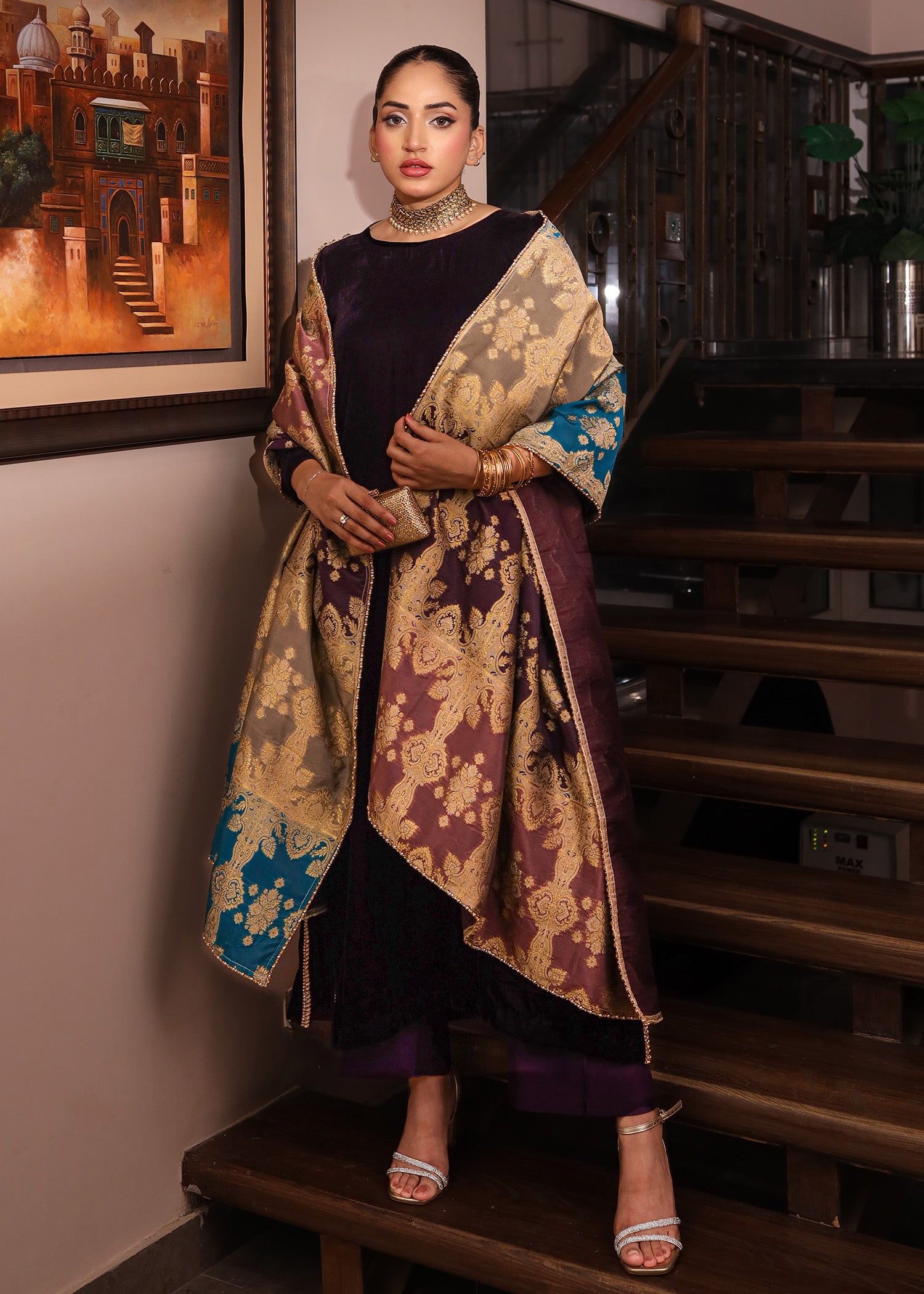 A deep plum velvet canvas paired with a regal Banarsi shawl — where tradition meets modern sophistication. The velvet shirt is adorned with intricate cutwork lace detailing on the chowks, adding richness and refinement to its timeless silhouette. Paired with straight tusser silk pants and a luxurious Banarsi shawl, this ensemble is perfect for winter soirées and family gatherings, blending opulence with understated grace.