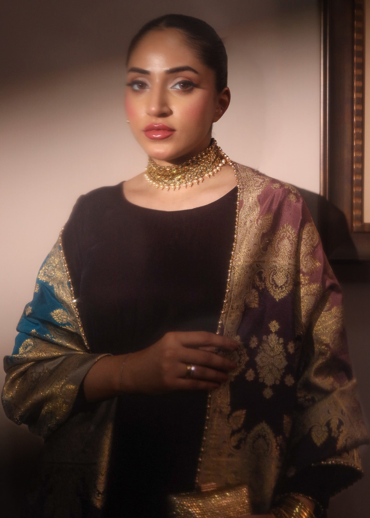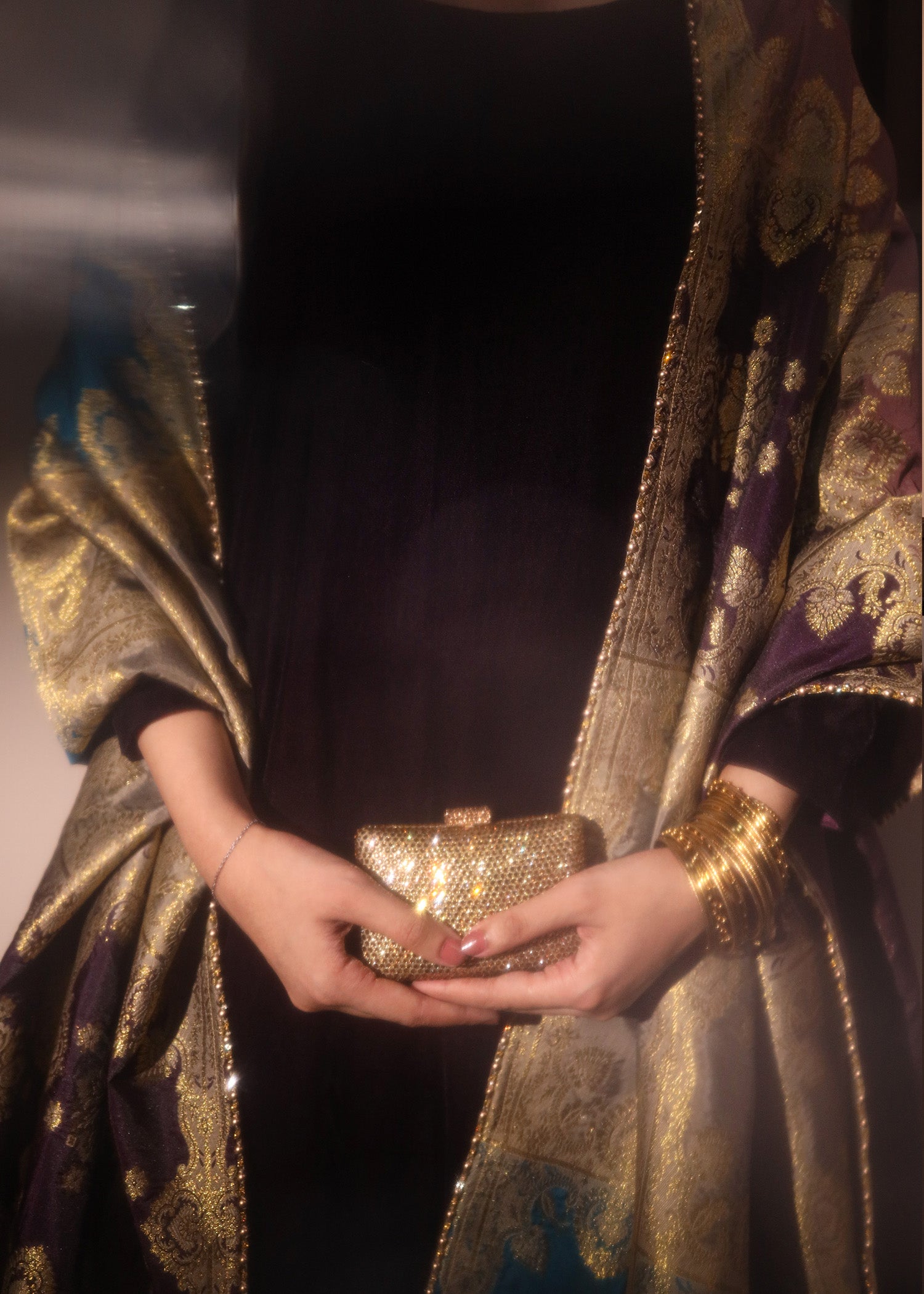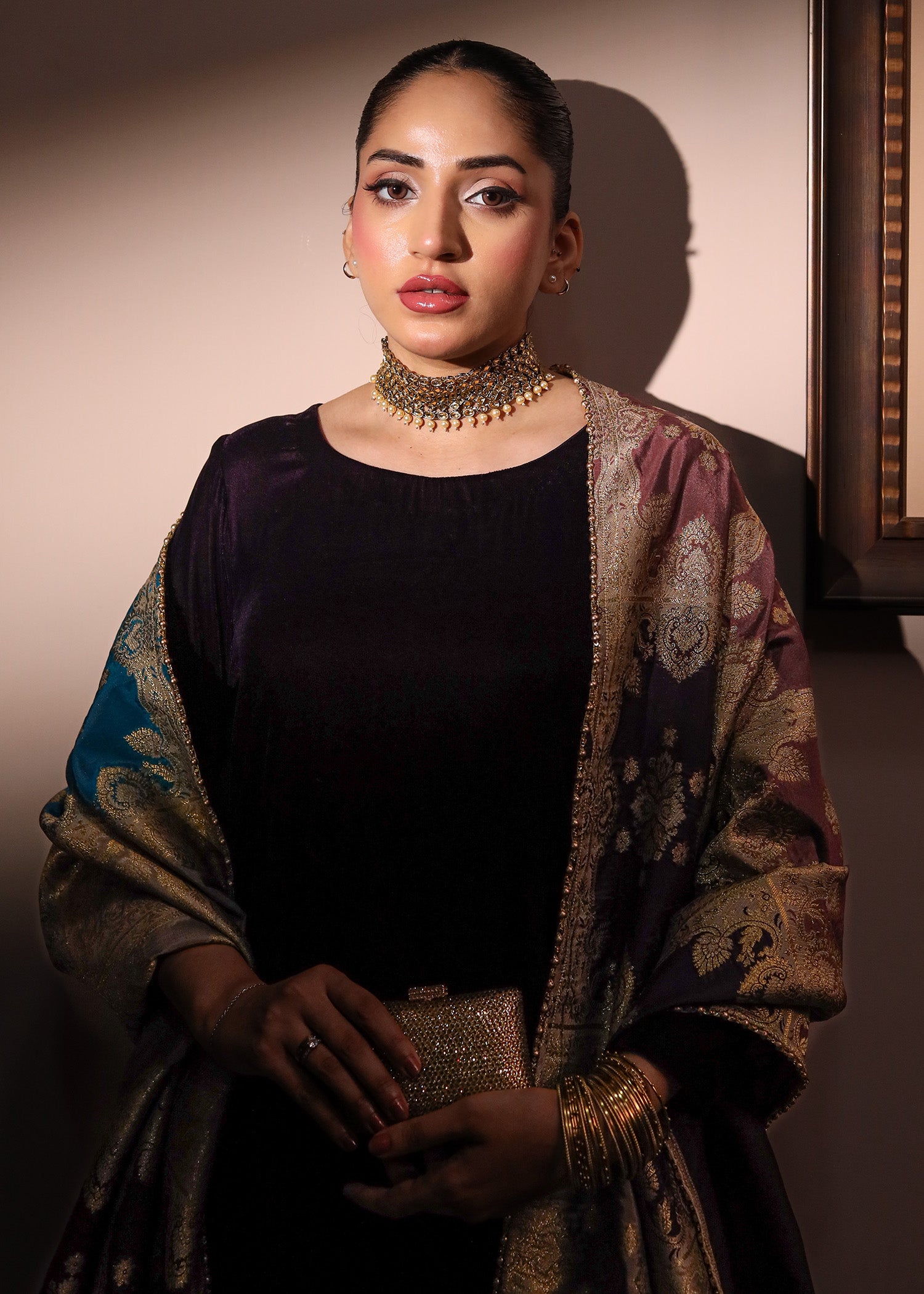 Fabric: Velvet shirt, tusser silk pants, intricate banarsi shawl with lacework