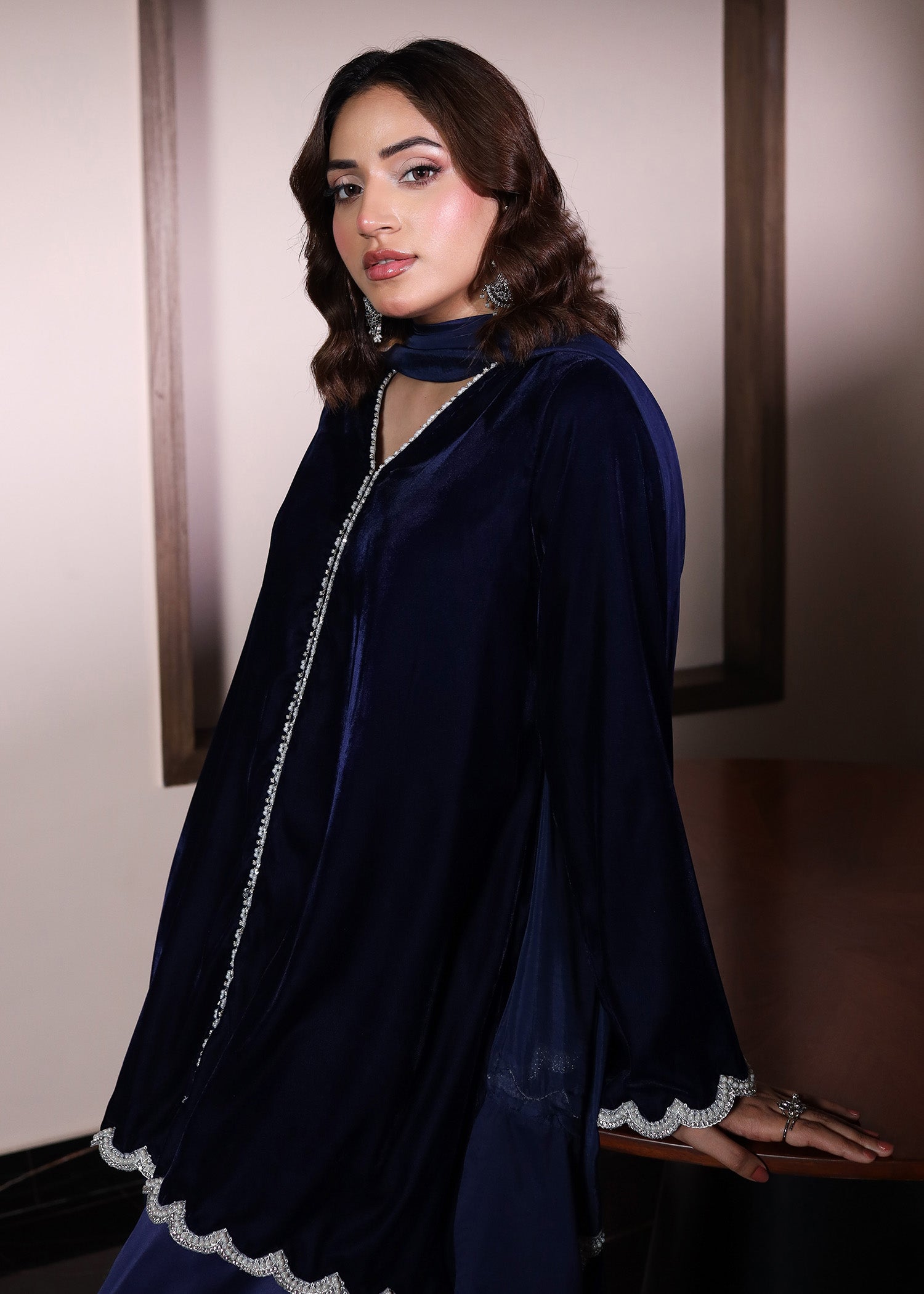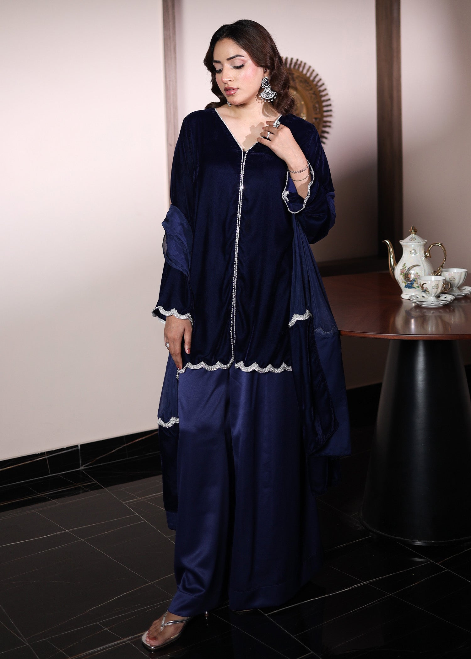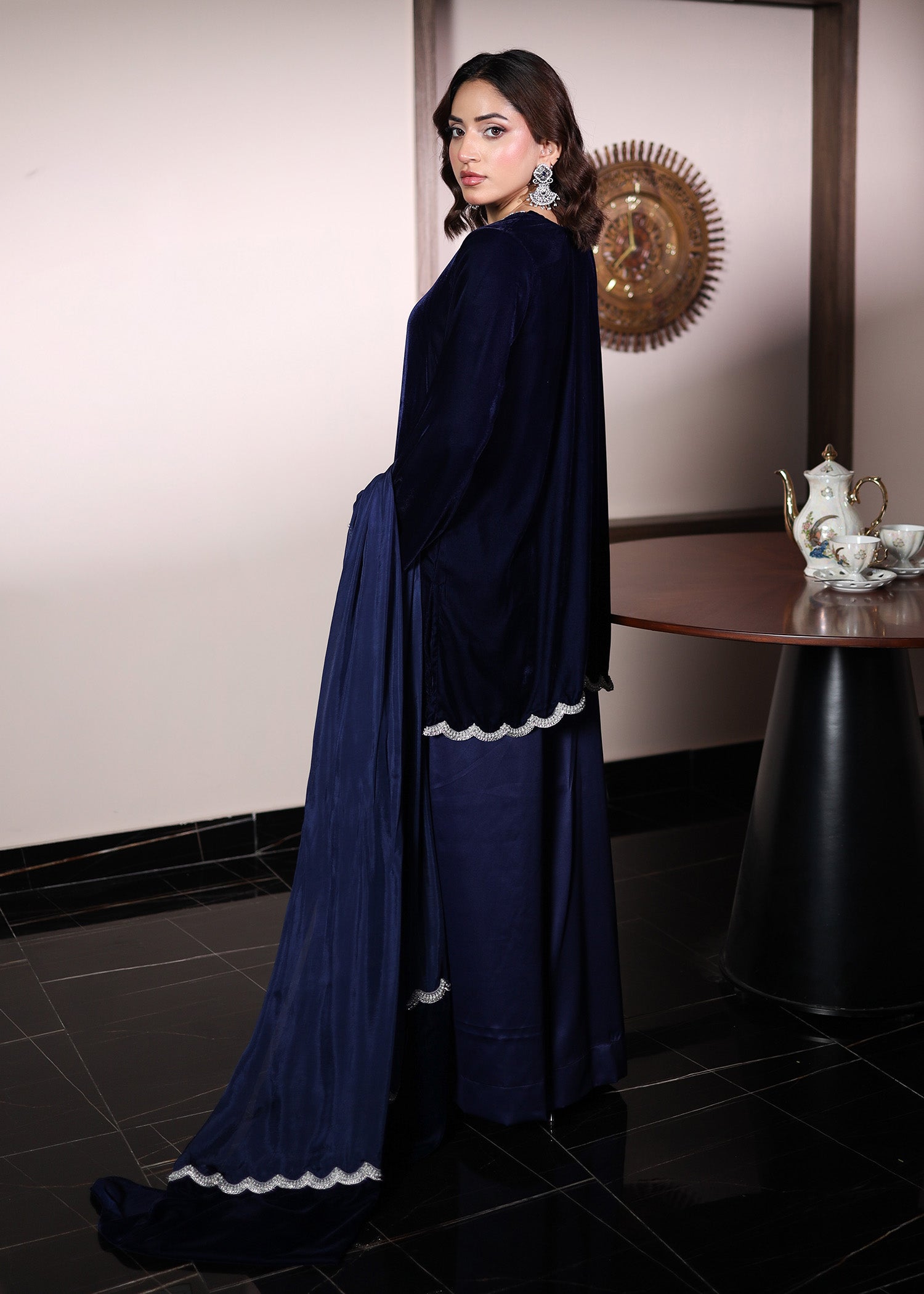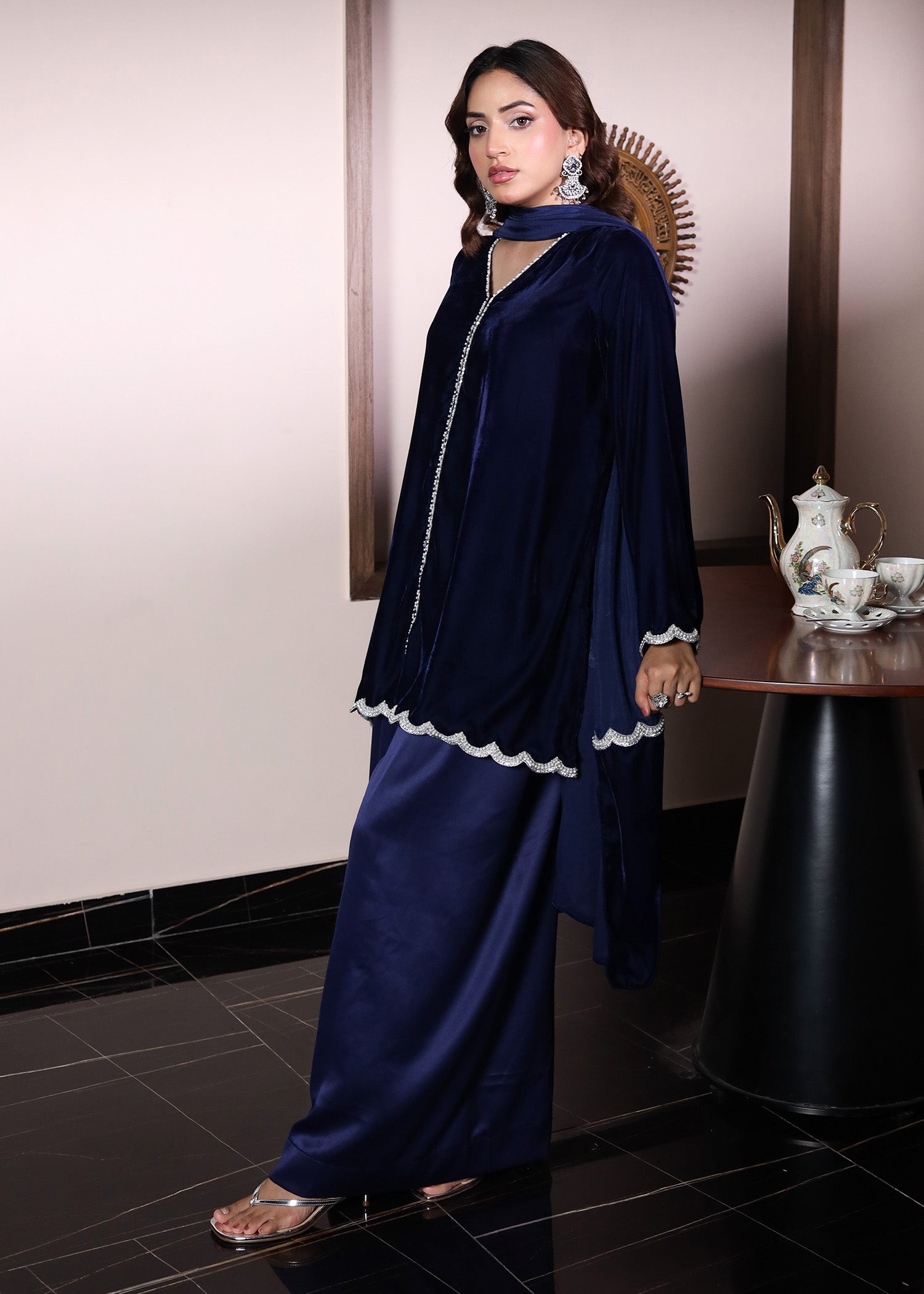 Command attention in the effortlessly regal Midnight Muse Ensemble from Candy Closet’s Luxe Collection. Tailored from plush navy velvet, the top features a flowing silhouette with delicate silver lace detailing along the neckline, hem, and sleeves. Paired with rich silk palazzos and a matching dupatta, this look strikes the perfect balance between opulence and grace. Ideal for formal dinners or winter festivities, this ensemble is your go-to for making a bold, sophisticated statement.