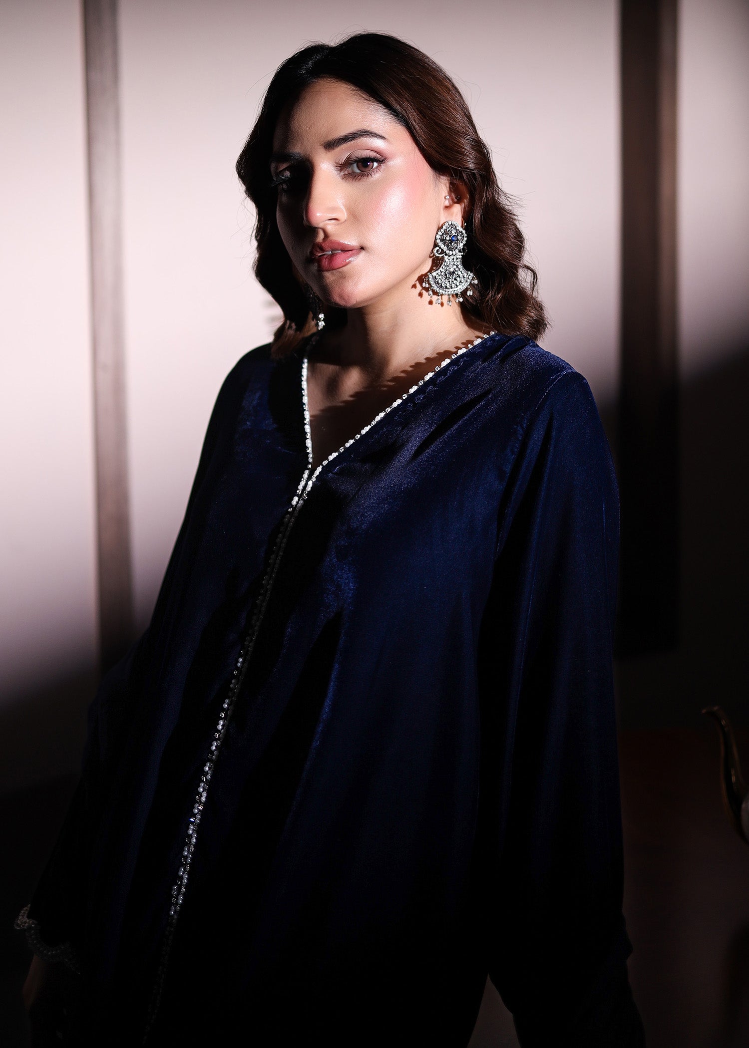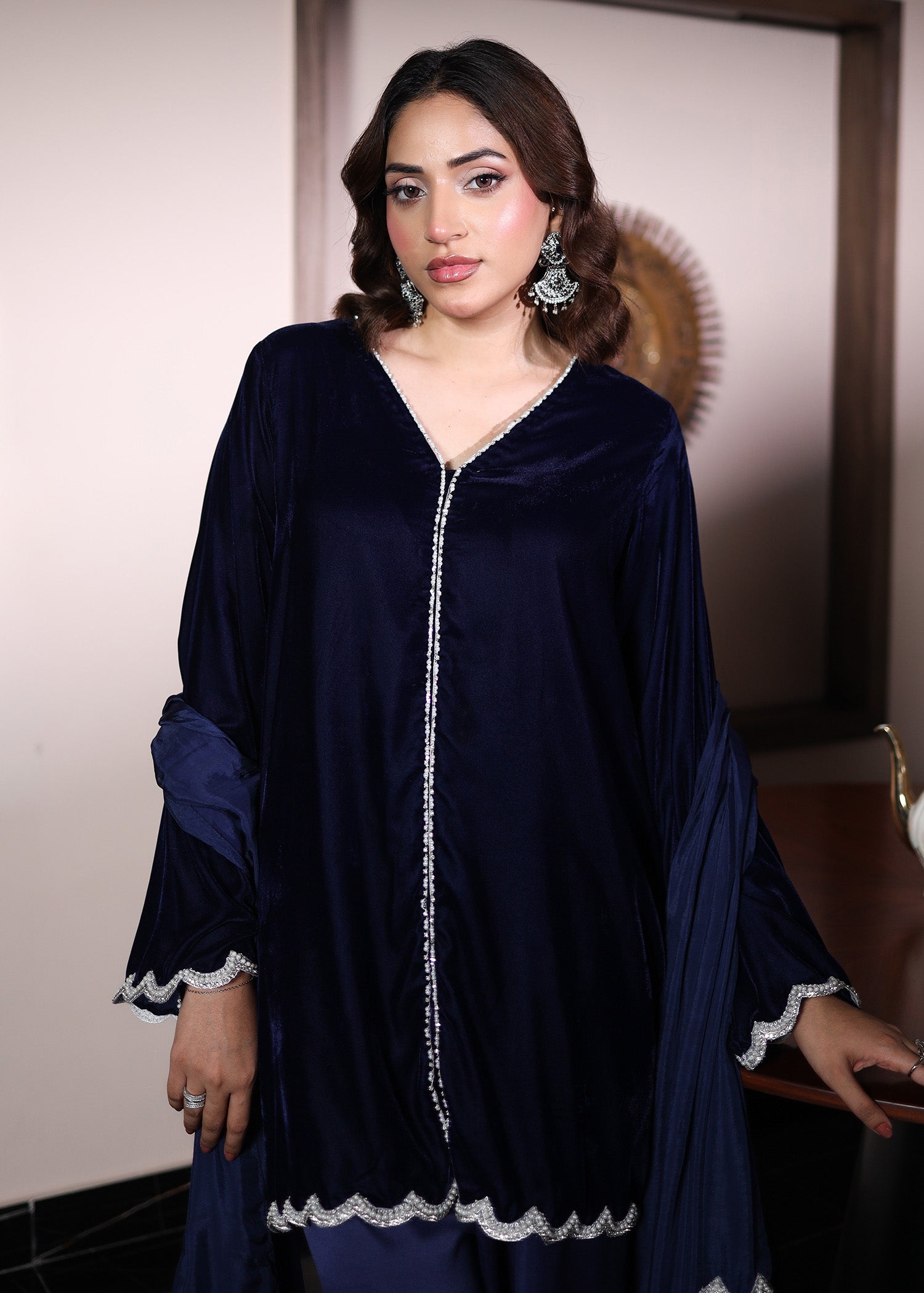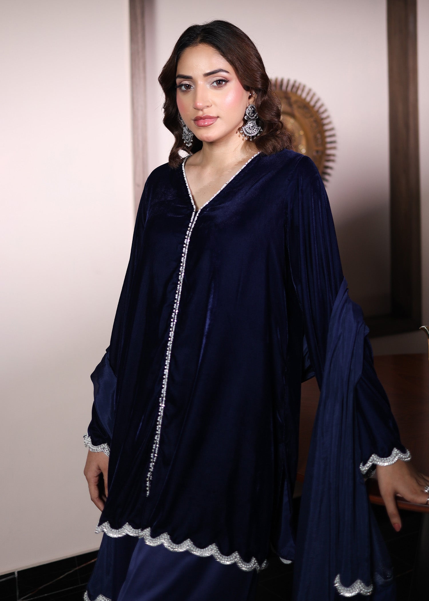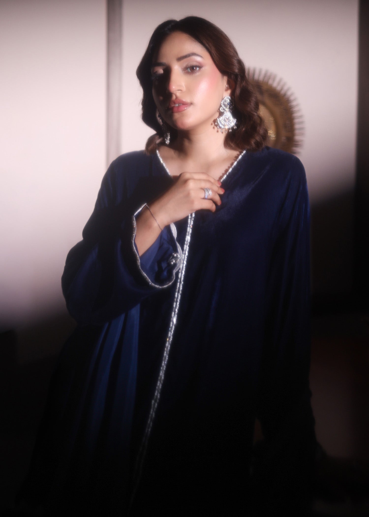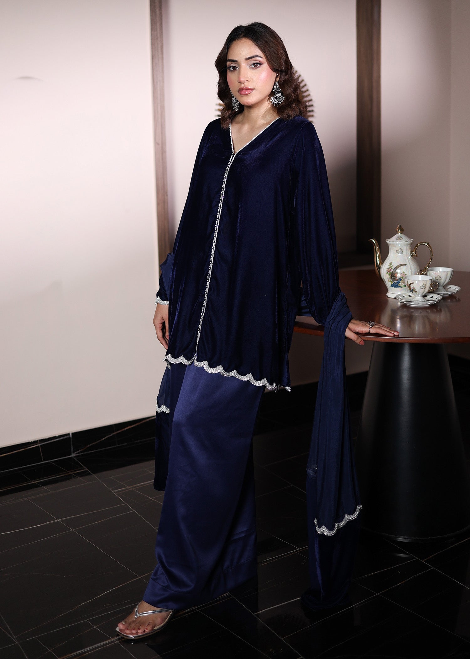Command attention in the effortlessly regal Midnight Muse Ensemble from Candy Closet’s Luxe Collection. Tailored from plush navy velvet, the top features a flowing silhouette with delicate silver lace detailing along the neckline, hem, and sleeves. Paired with rich silk palazzos and a matching dupatta, this look strikes the perfect balance between opulence and grace. Ideal for formal dinners or winter festivities, this ensemble is your go-to for making a bold, sophisticated statement.