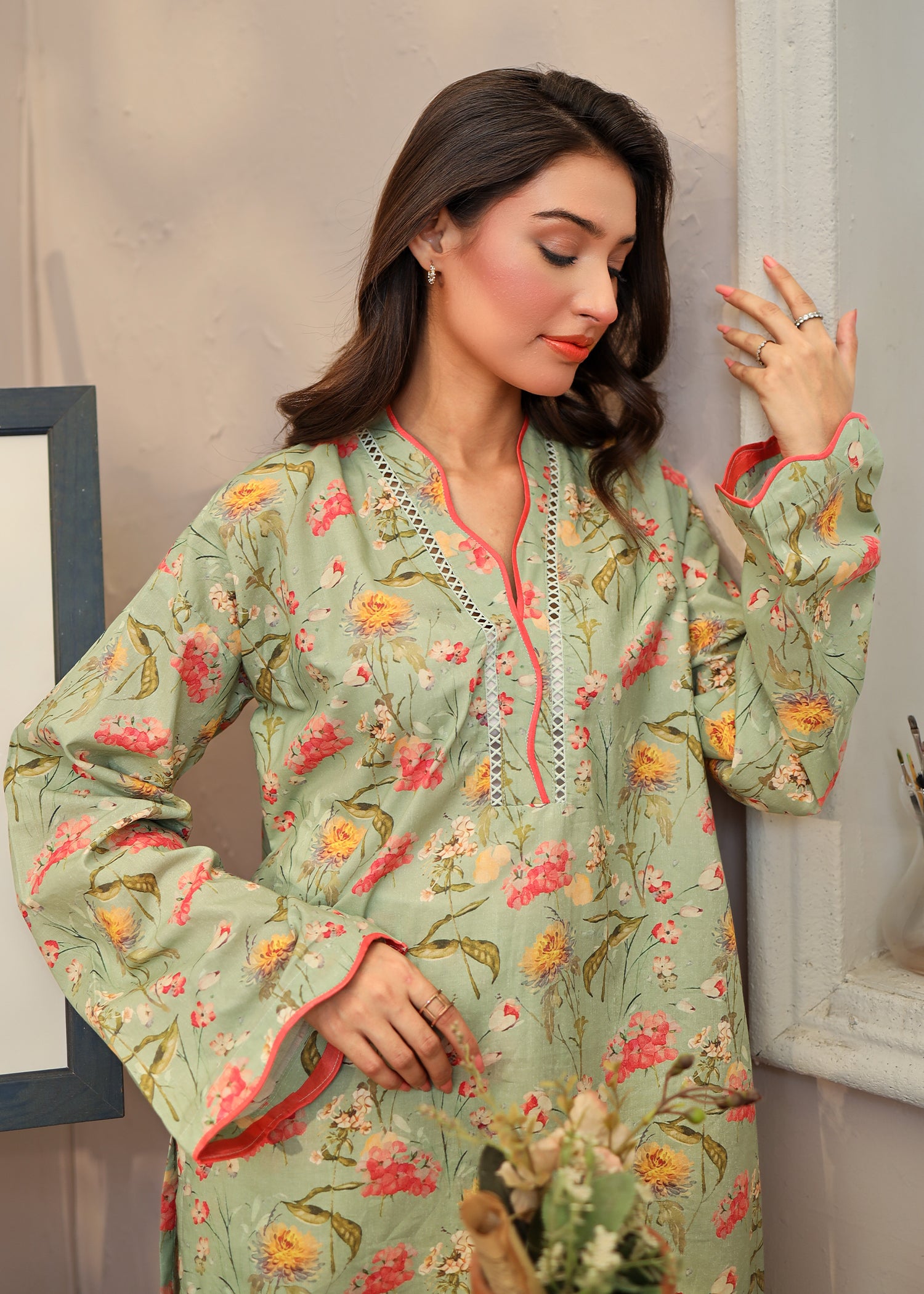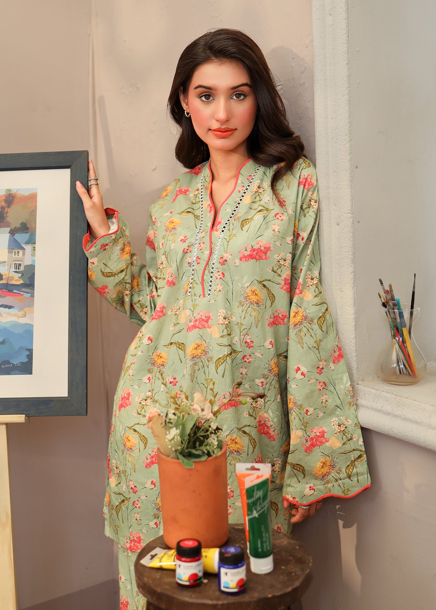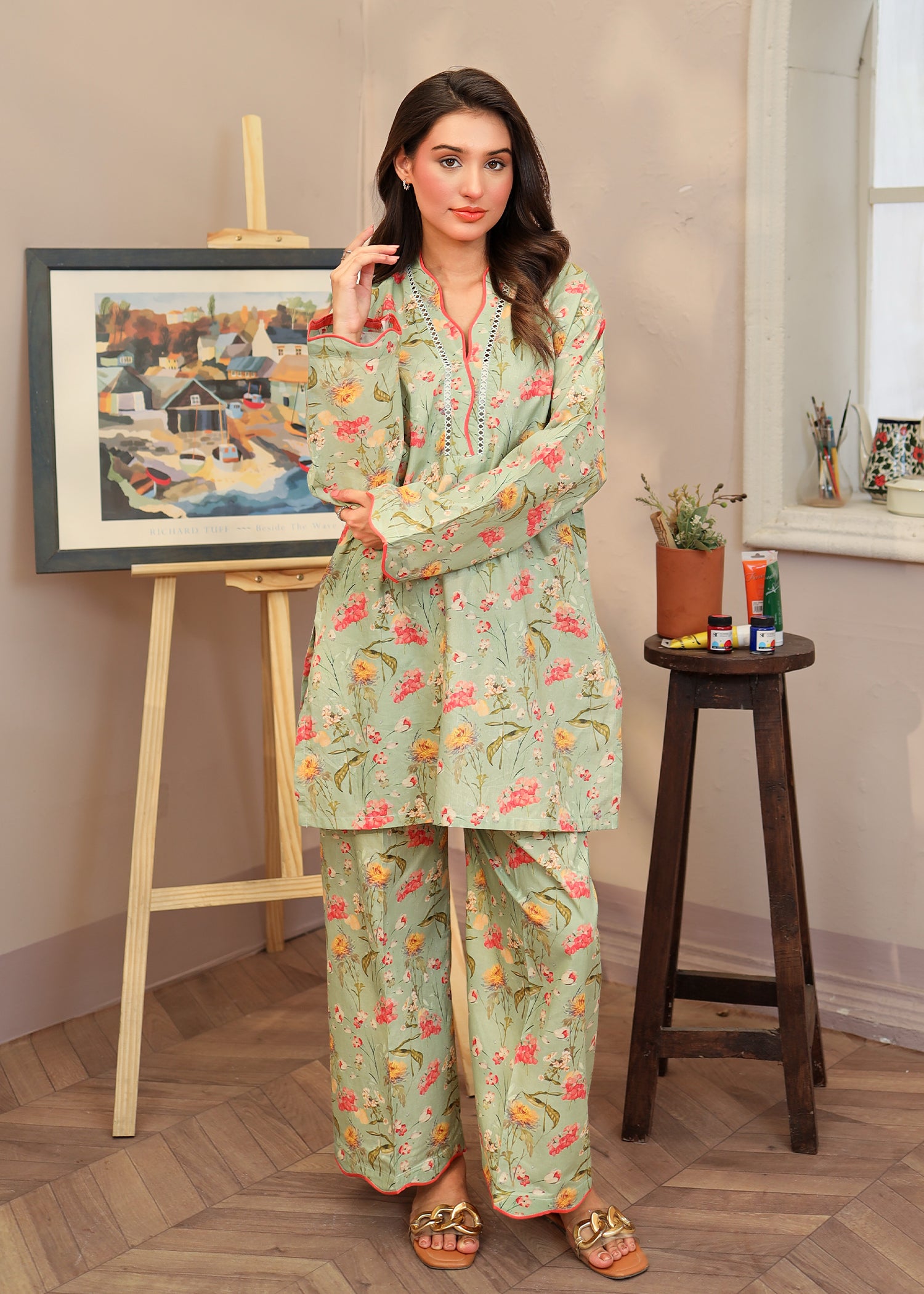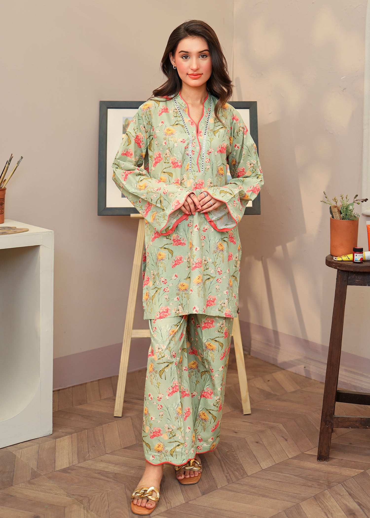 A summery floral print featuring a 2-piece set with a loose fit shirt and trousers with scallop details