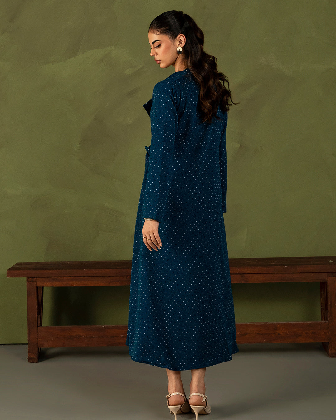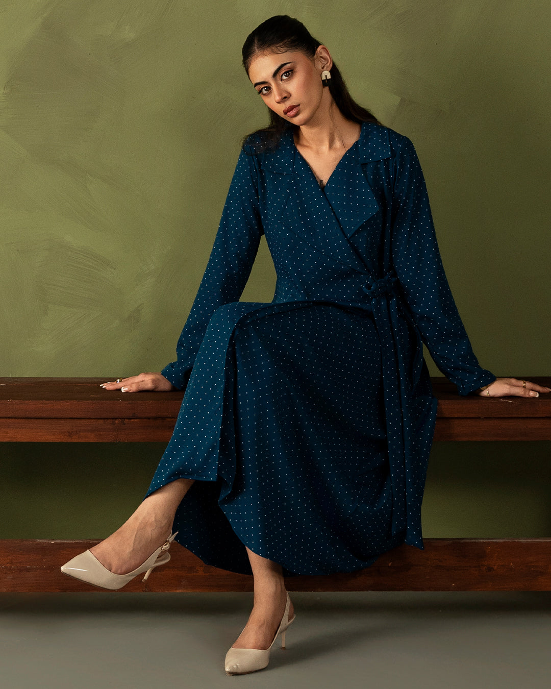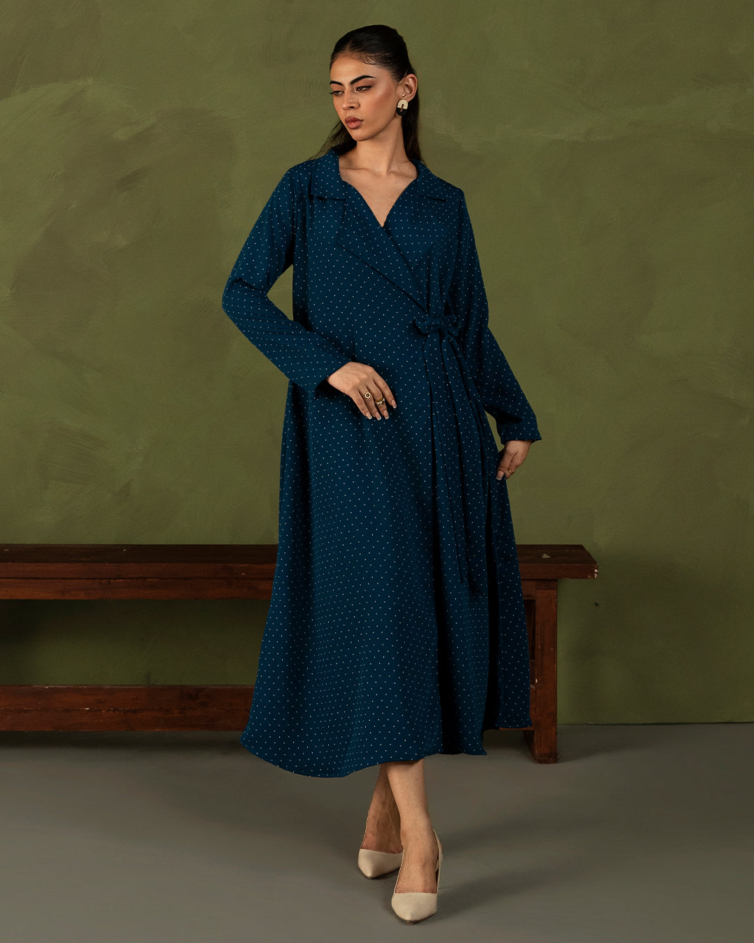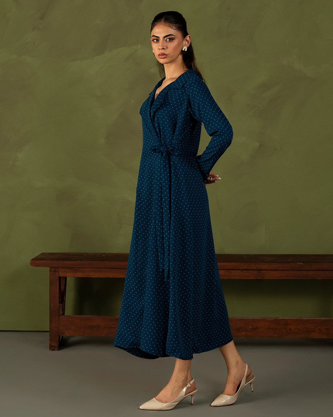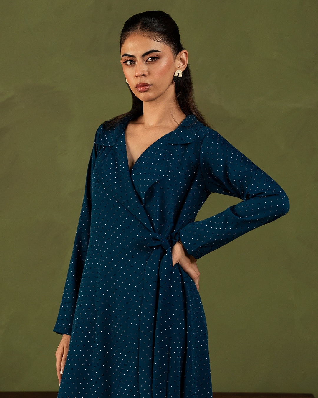 A blue polka dot beauty designed to make every day feel a little more special. Featuring a chic collared neckline that flows into a wrap-style bow tie detail, this dress brings the perfect mix of classic and playful. Full straight sleeves add sophistication, while the soft silhouette keeps it effortlessly wearable.