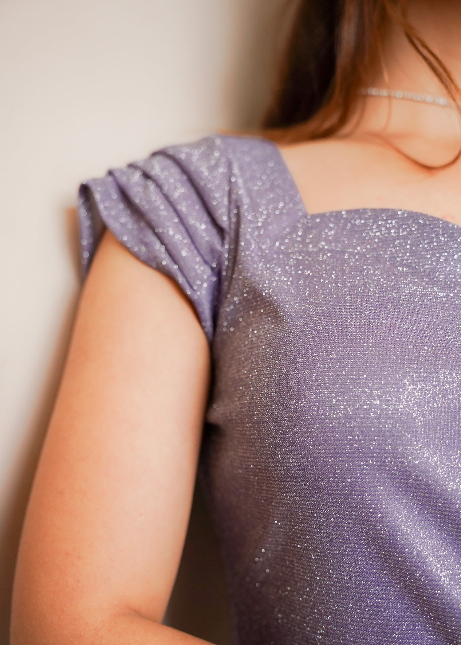 An exquisite purple moonlight dress featuring our all-time favorite sweatheart neckline and pleated frill sleeves, a perfect choice for both day and night events!