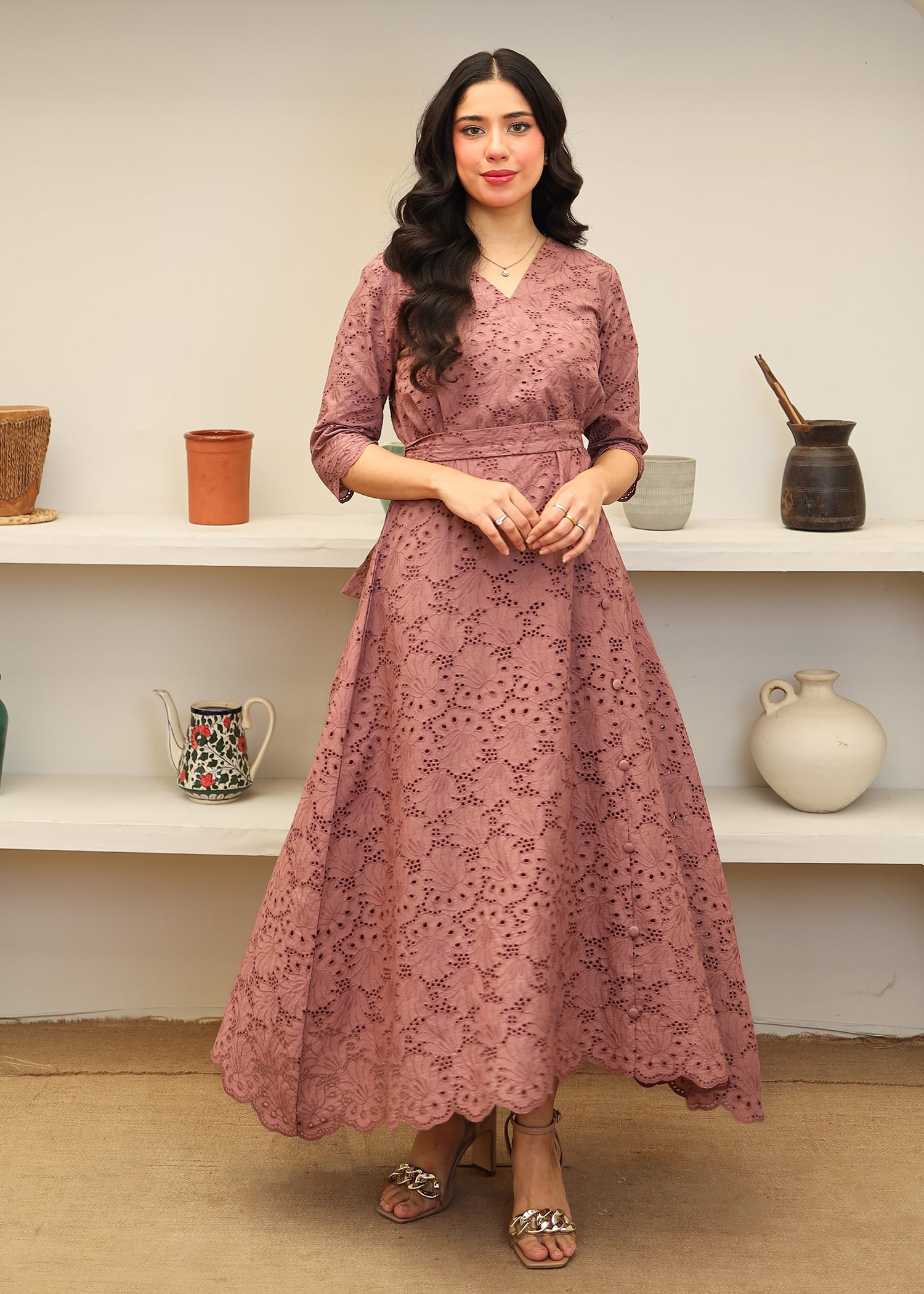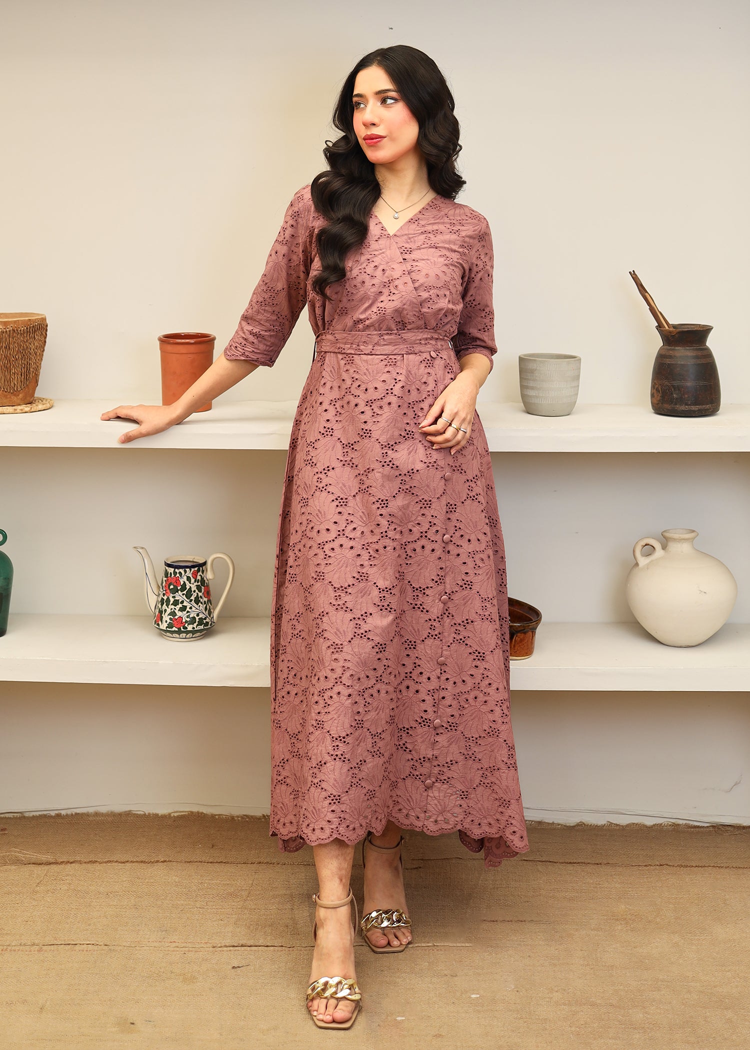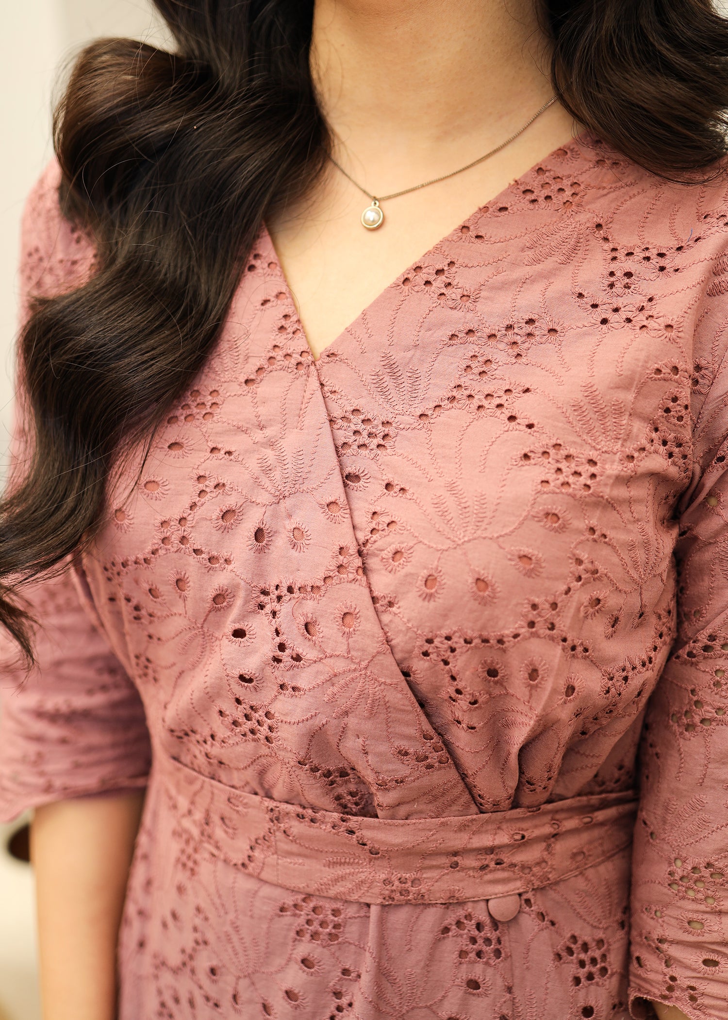 Crafted in a delicate tea pink eyelet fabric, Rosa features a flattering pleated wrap neckline and straight-fit sleeves for a refined yet relaxed silhouette. The dress is further adorned with button details on the skirt, adding a timeless touch to its flowing elegance.