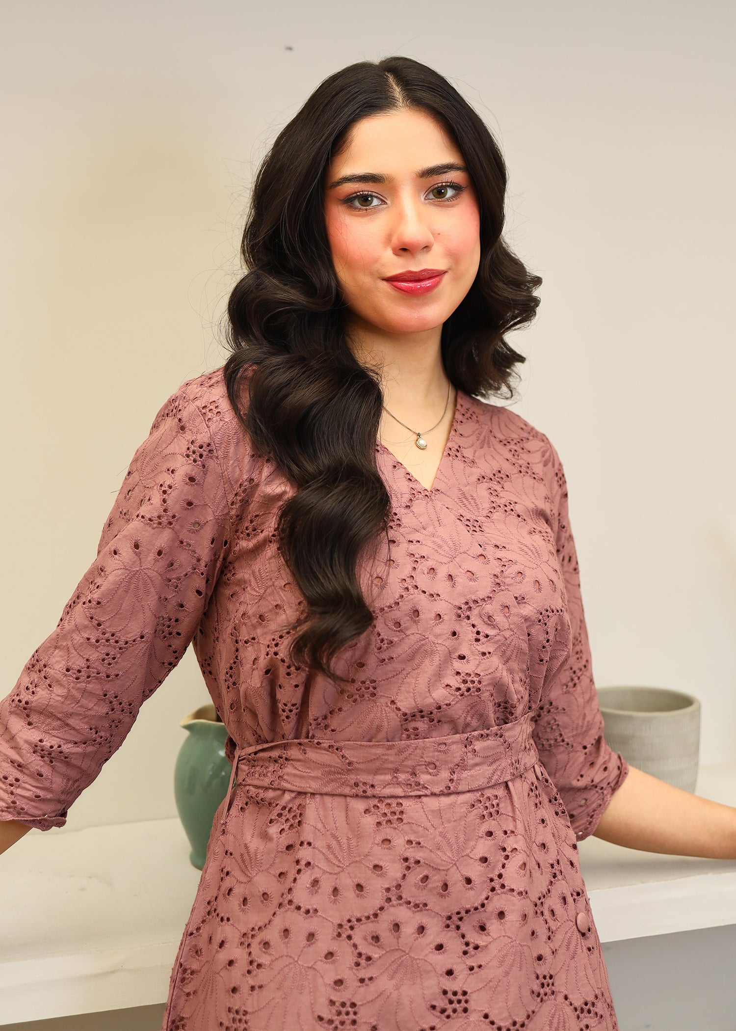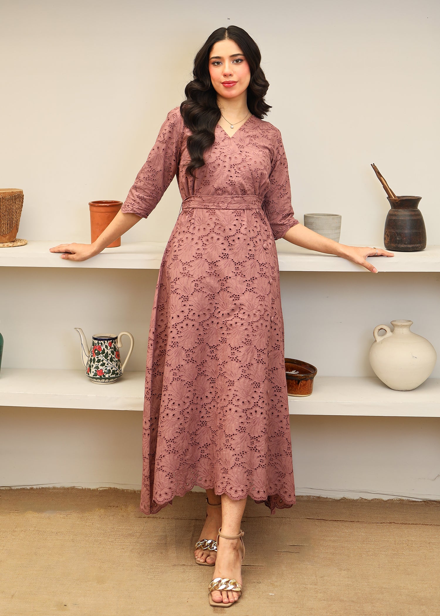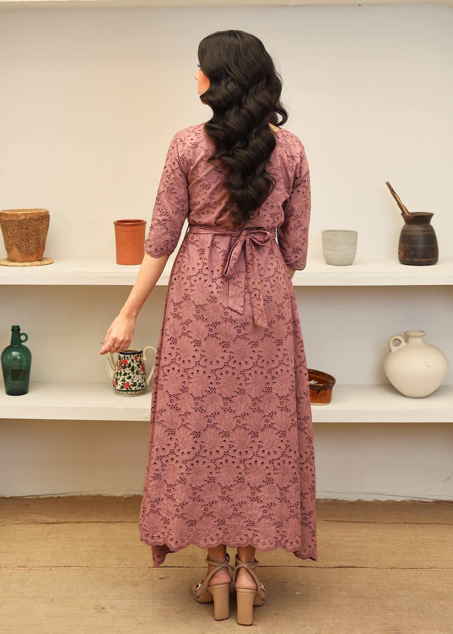 Crafted in a delicate tea pink eyelet fabric, Rosa features a flattering pleated wrap neckline and straight-fit sleeves for a refined yet relaxed silhouette. The dress is further adorned with button details on the skirt, adding a timeless touch to its flowing elegance.