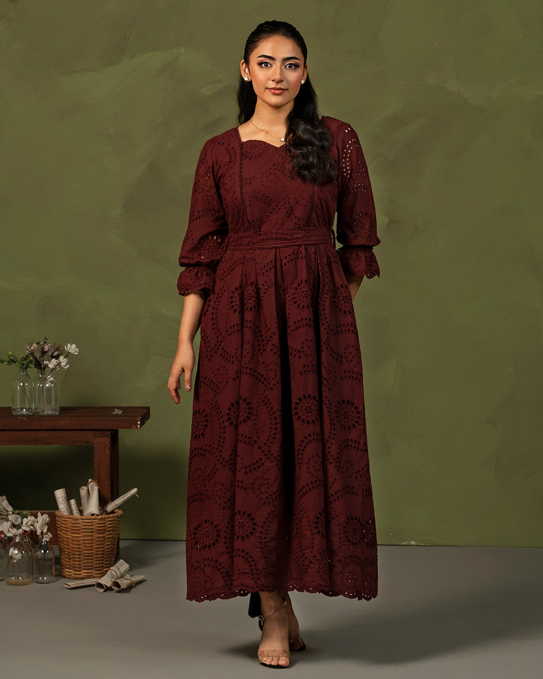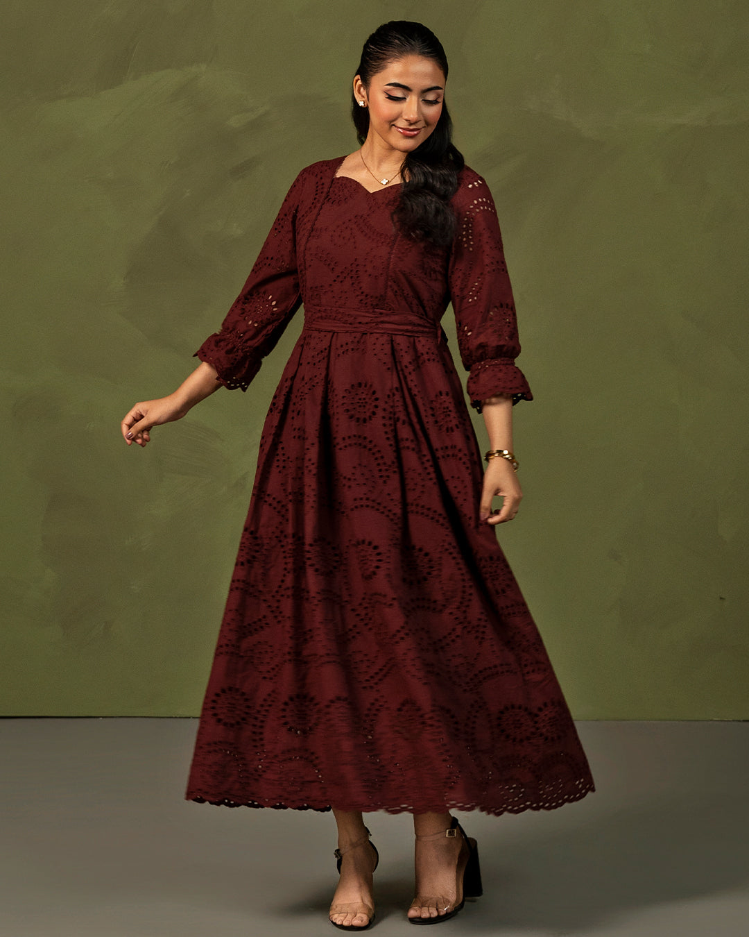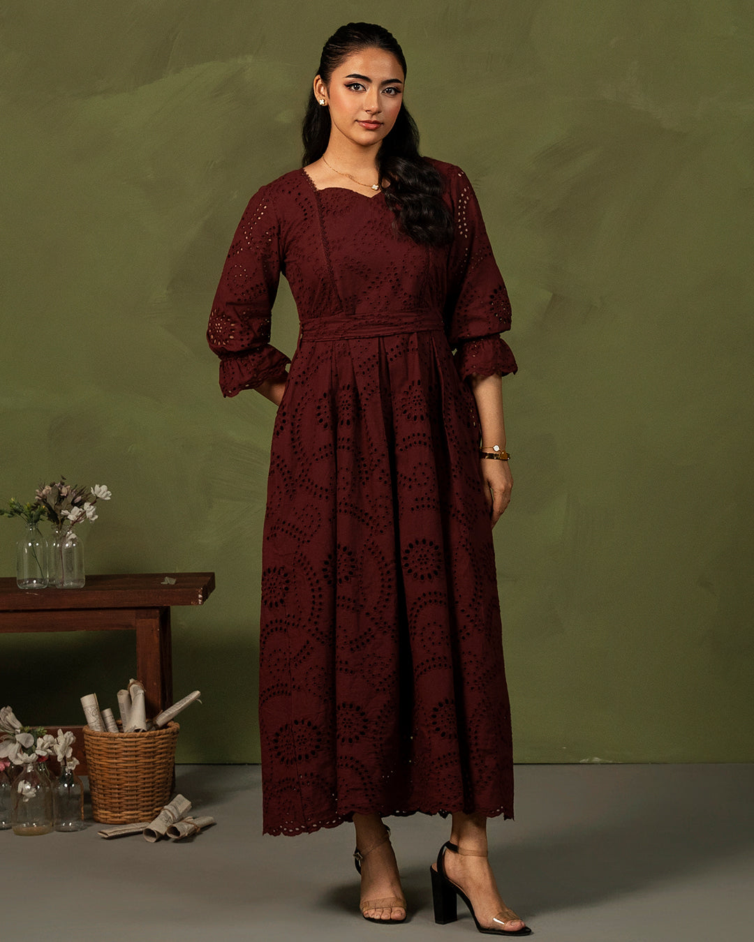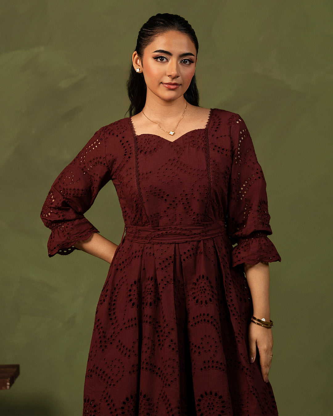 Crafted from flowing maroon eyelet fabric, this dress features a captivating sweetheart neckline with delicate lace details adorning the front and back of the bodice. Enchanting puffy elastic sleeves add a touch of romance, while the skirt is beautifully finished with intricate scallop edges, adding a dreamy, graceful charm to every step.