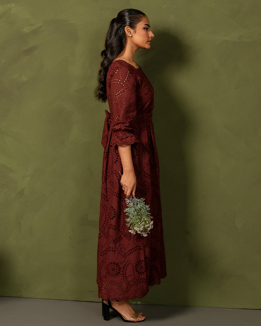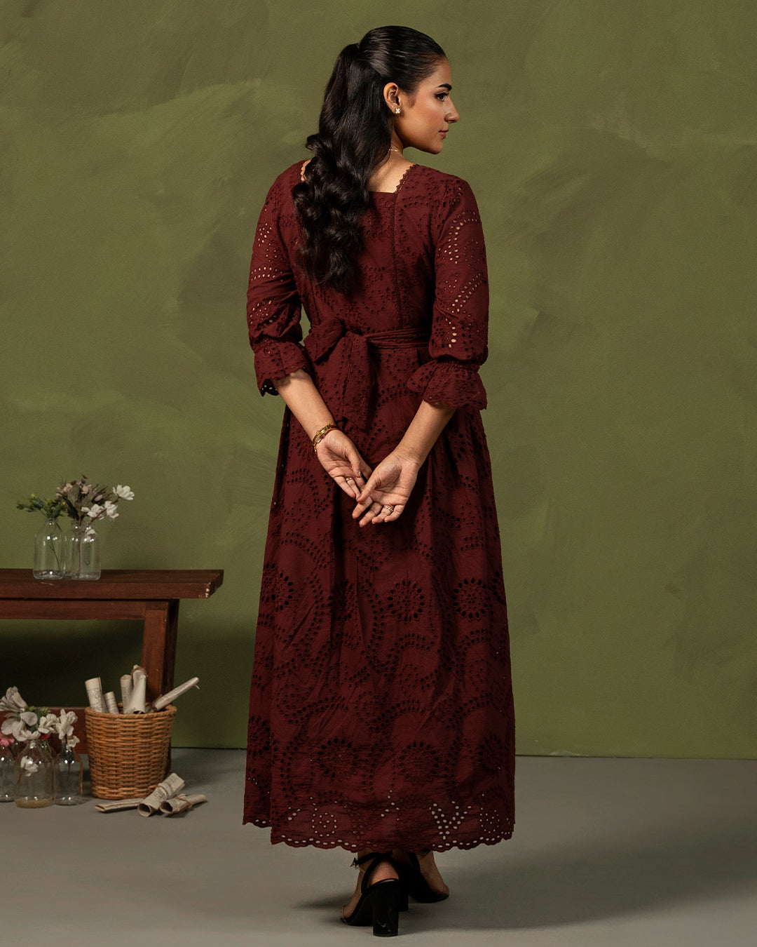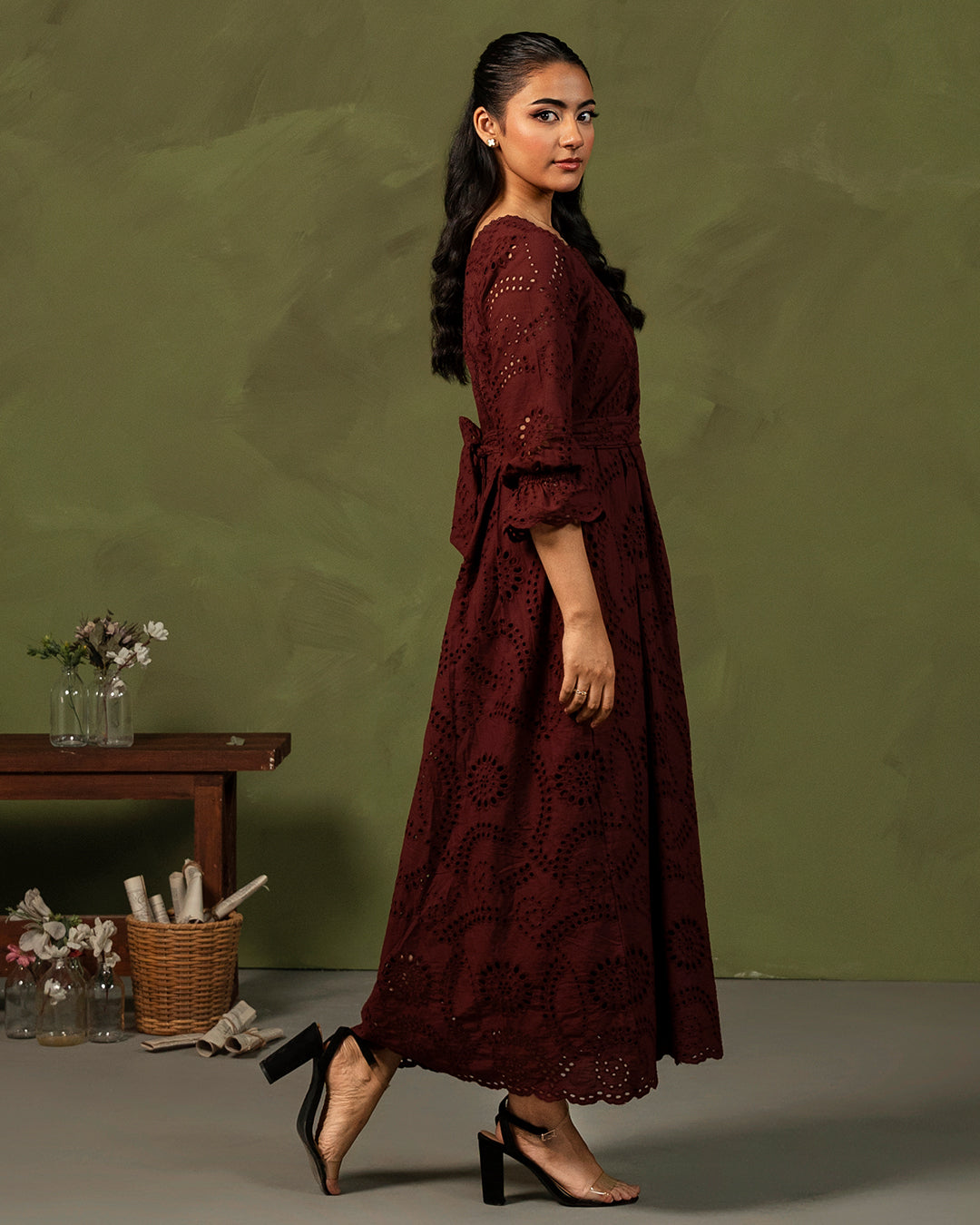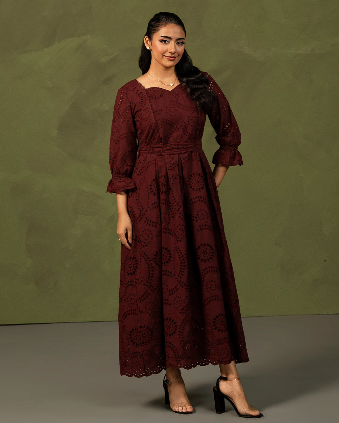 Crafted from flowing maroon eyelet fabric, this dress features a captivating sweetheart neckline with delicate lace details adorning the front and back of the bodice. Enchanting puffy elastic sleeves add a touch of romance, while the skirt is beautifully finished with intricate scallop edges, adding a dreamy, graceful charm to every step.